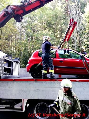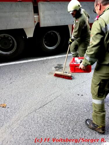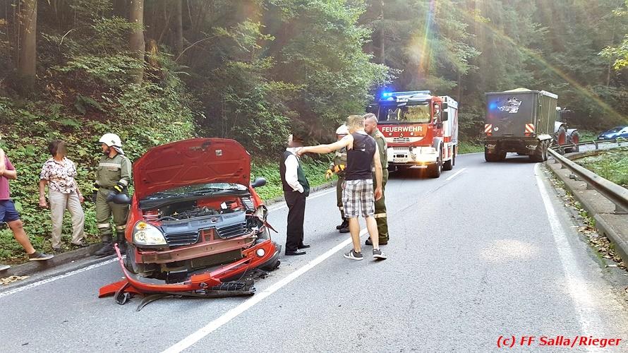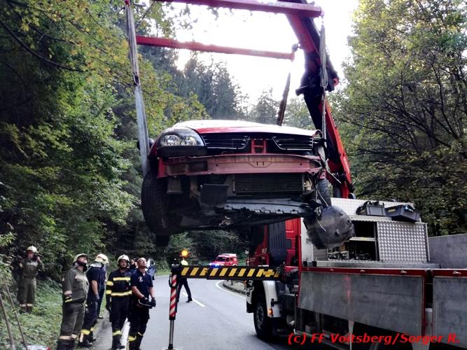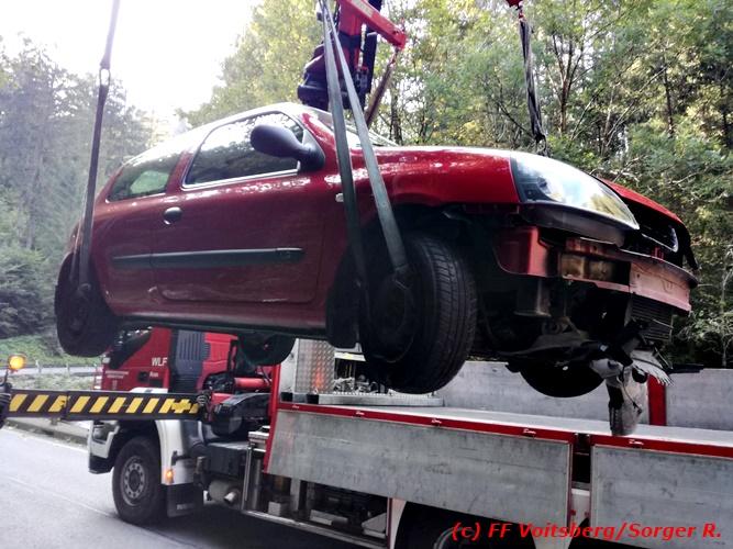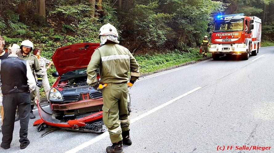VOITSBERG, am 09.09.2018 Zu einem folgenschweren Zusammenstoß zwischen einem Traktoranhänger und einem PKW kam es auf der Gaberl-Bundesstrasse (B 77) im Gemeindegebiet Maria Lankowitz (Ortsteil Salla) am Sonntag, 9. September 2018 um ca. 15 Uhr. Ein in Richtung Köflach fahrender PKW-Lenker erblickte in einer Kurve einen Traktor mit überbreitem Anhänger, erschrak, verriss sein Fahrzeug an den rechten Fahrbahnrand, touchierte einen Randstein und wurde gegen den Anhänger geschleudert. Durch den Aufprall wurde der PKW derart beschädigt, dass Betriebsmittel ausflossen und zwecks Bergung das WLF-Kran der FF Voitsberg seitens der einsatzleitenden Feuerwehr Salla angefordert werden musste. Das Fahrzeug wurde geborgen und zu einem Abstellplatz gebracht. Ausgeflossene Betriebsmittel wurden gebunden sowie herumliegende Wrackteile von der Strasse entfernt. Auf der stark frequentierten B 77 kam es dadurch zu ausgedehnten Staus in beiden Fahrtrichtungen. Die Unfallerhebungen wurden von der Polizei durchgeführt. Verletzt wurde glücklicherweise niemand. Eingesetzt waren unter der Einsatzleitung von HBI Michael Schrotter (FF Salla) insgesamt 13 Einsatzkräfte der Feuerwehren Salla und Voitsberg sowie eine Polizeistreife mit 2 Beamten. Text: Walter Ninaus/FF Voitsberg Fotos: FF Salla/Rieger, FF Voitsberg/Sorger R.