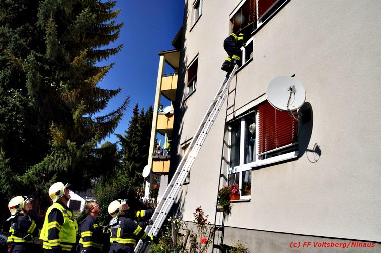VOITSBERG, am 26.09.2018 Die FF Voitsberg wurde am Mittwoch, 26. September 2018 um 12:32 Uhr zu einer Unterstützung des Roten Kreuzes gerufen. Im ersten Stock eines Mehrparteienhauses in der Grillparzerstrasse in Voitsberg konnte eine am Boden liegende Person sich nicht mehr aufrichten. Aufgrund der verschlossenen Wohnung musste ein Kamerad der FF Voitsberg über eine Schiebeleiter durch ein geöffnetes Fenster in die Wohnung einsteigen und die Tür öffnen. Das Rote Kreuz versorgte die ansprechbare Person und überstellte sie ins LKH Voitsberg. Eingesetzte Kräfte: FF Voitsberg mit 7 Kräften (Einsatzleiter: BR Ing. Klaus Gehr) Roten Kreuz mit 2 Sanitätern Polizei Voitsberg mit 2 Beamten Text und Fotos: Walter Ninaus/FF Voitsberg