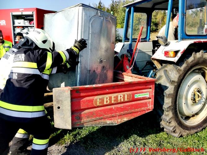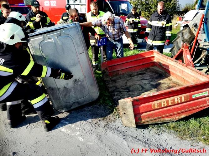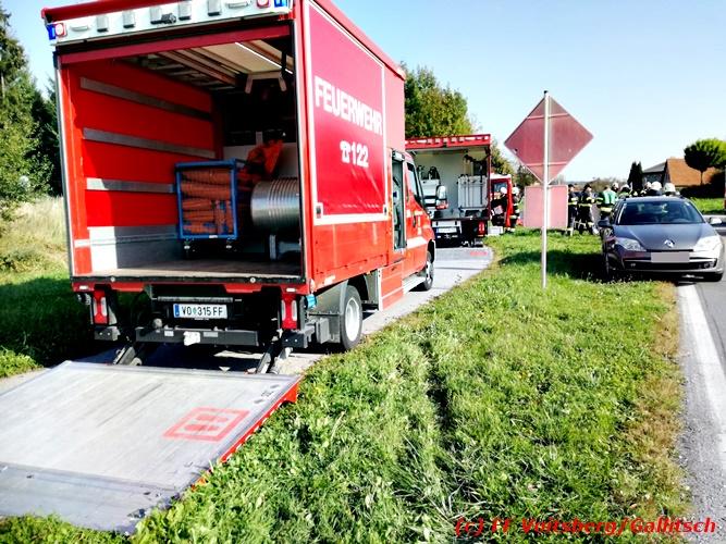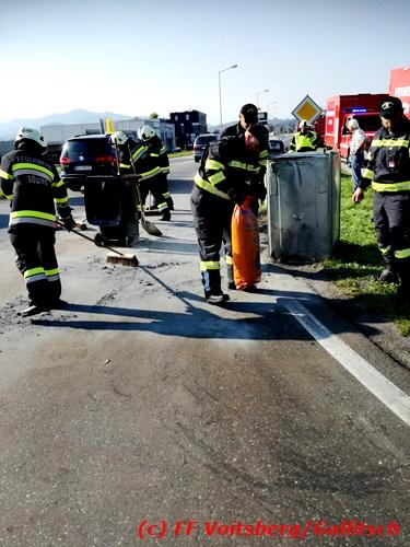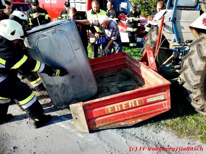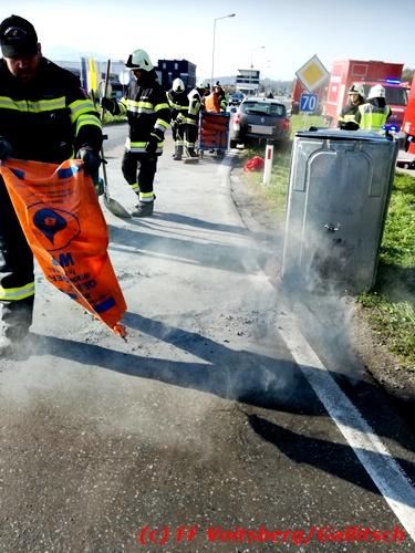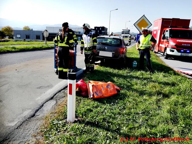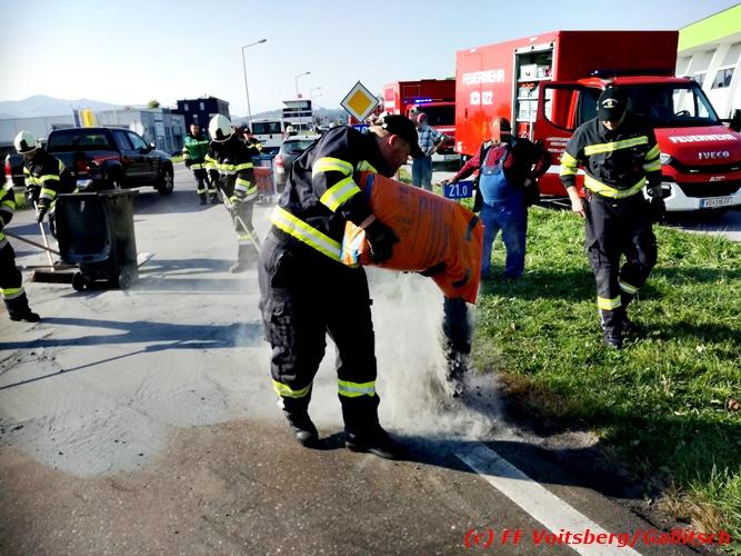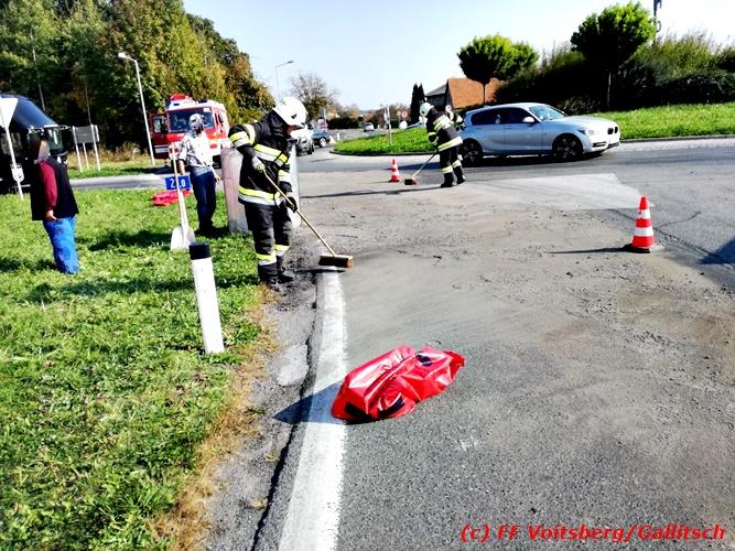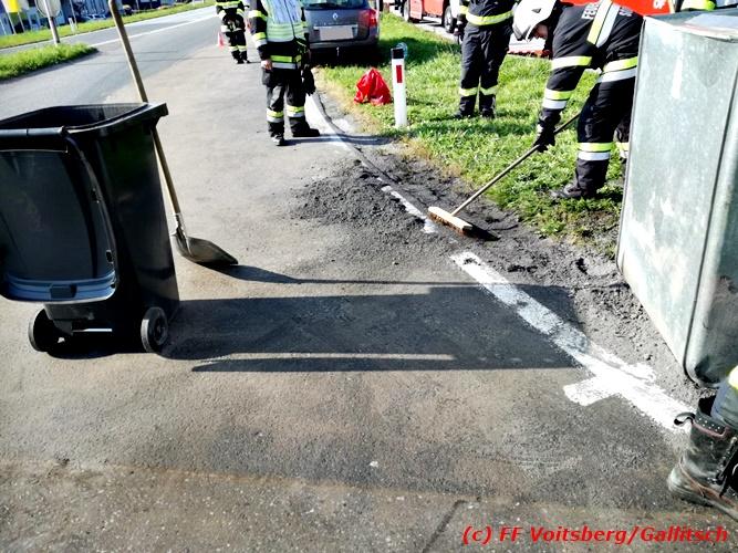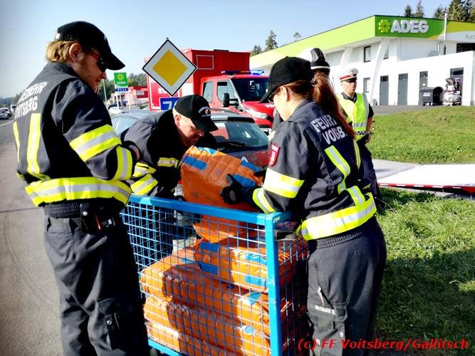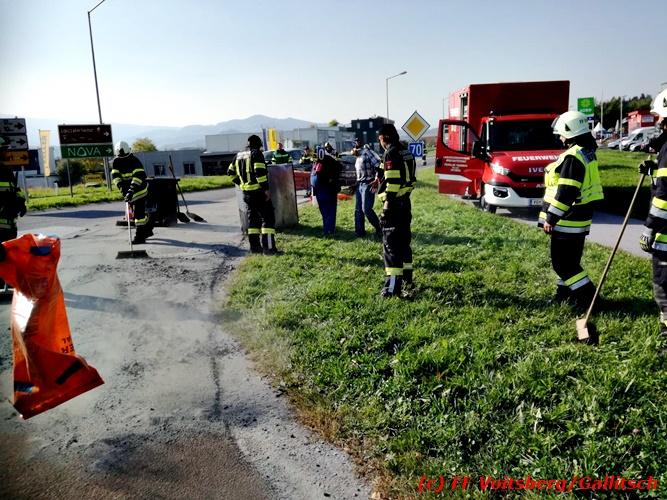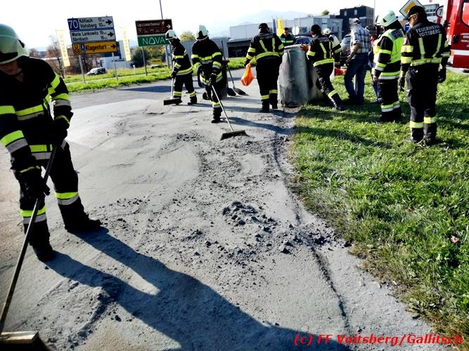 VOITSBERG, am 13.10.2018 Am Samstag, 13. Oktober 2018 in den frühen Nachmittagsstunden stürzte im Kreisverkehr der B 70 in Söding-St.Johann in Richtung Voitsberg ein Behälter mit ca. 600 l Heizöl samt einem PKW-Anhänger um, platzte auf und verteilte sich auf der Fahrbahn der B 70. Die erstalarmierte FF Söding führte Erstmaßnahmen durch, sicherte die Einsatzstelle ab und regelte bis zum Eintreffen der Polizei den Verkehr. Die nachalarmierte Schadstoffstützpunktfeuerwehr Voitsberg band mit Ölbindemittel das ausgeflossene Heizöl, sammelte das durchtränkte Bindemittel ein und entsorgte es fachgerecht. Während des Einsatzes kam es zu einem kurzen Stau auf der B 70. Eingesetzt waren insgesamt 17 Kräfte der Feuerwehren Söding und Voitsberg sowie die Polizei. Verletzt wurde niemand. Fotos: Gallitsch/FF Voitsberg Text: Ninaus/FF Voitsberg