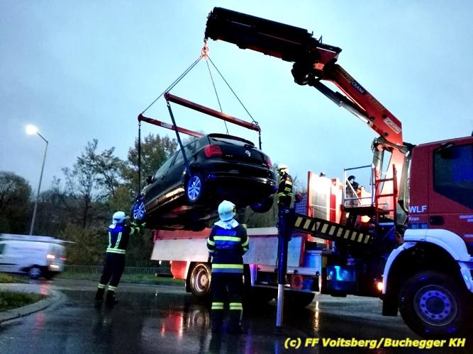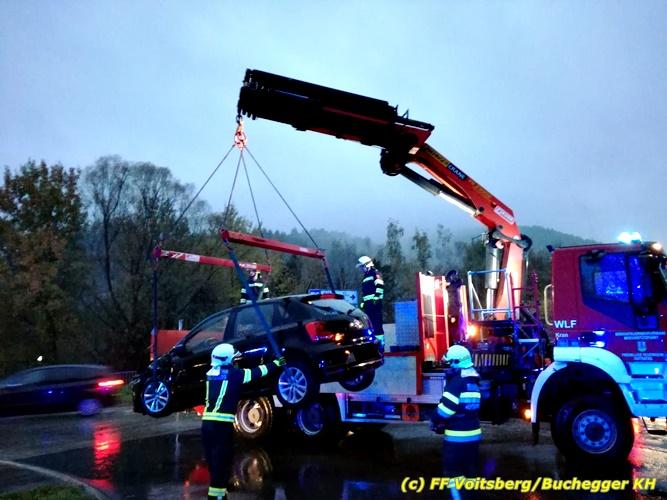 VOITSBERG, am 27.10.2018 Auf der B 70 in Gaisfeld kam es am Samstag, 27. Oktober 2018 am späten Nachmittag zu einem Zusammenstoß zweier PKW. Die einsatzleitende Feuerwehr Gaisfeld forderte über die LLZ das WLF-Kran der FF Voitsberg zwecks Bergung und späterer Sicherstellung eines Fahrzeuges an. Text: Walter Ninaus, FF Voitsberg Fotos: Karlheinz Buchegger, FF Voitsberg
