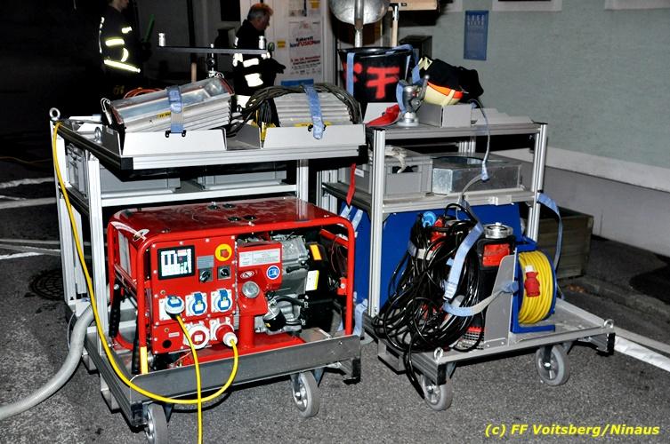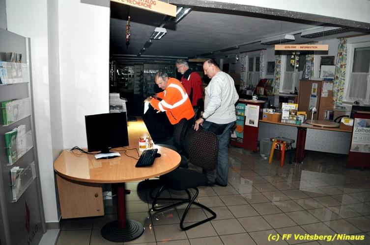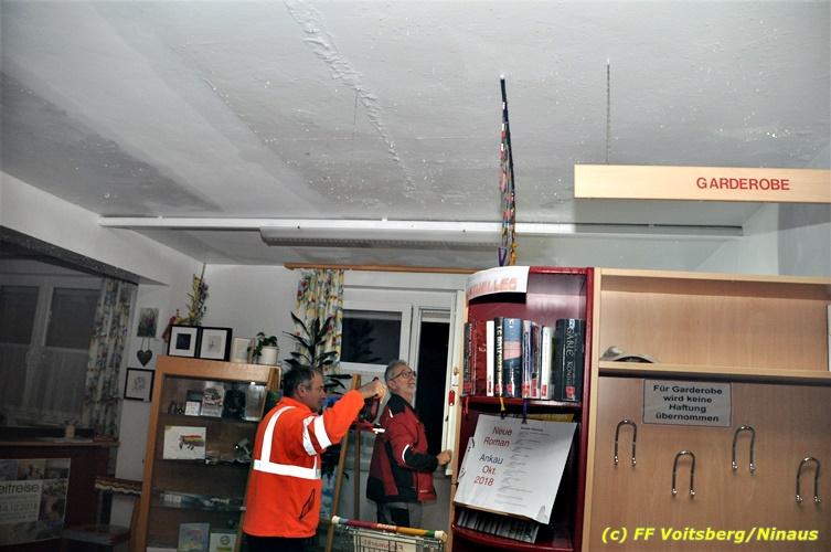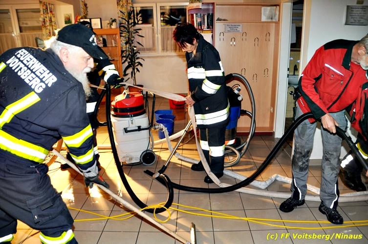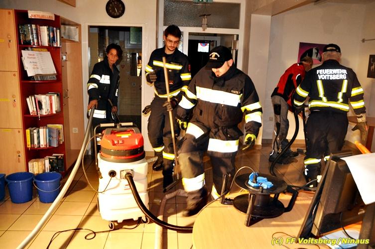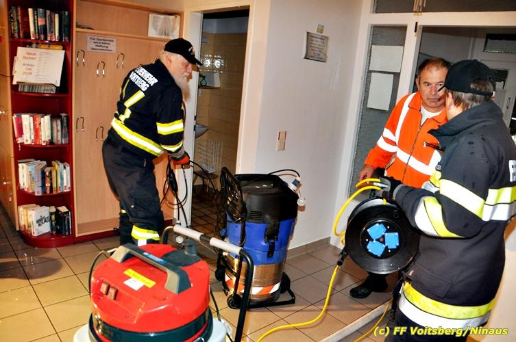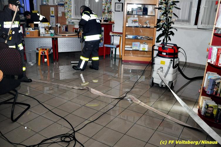VOITSBERG, am 18.11.2018 Am Sonntag, 18. November 2018 in den Nachmittagsstunden bemerkte ein aufmerksamer Passant, dass beim Gebäude der Musikschule in Voitsberg an der Außenwand Wasser nach unten rinnt und verständigte unverzüglich die Polizei Voitsberg. Nach deren Erkundung wurde der Bereitschaftsdienst des Bauhofes Voitsberg verständigt. Nach der Feststellung der Ursache, eines geplatzten Wasserschlauches im ersten Obergeschoß, wurde der Hauptwasserhahn abgedreht und die FF Voitsberg zur Unterstützung der Abpumparbeiten in der darunterliegenden Stadtbücherei angefordert. Mit insgesamt drei Nasssaugern der FF Voitsberg und des Bauhofes Voitsberg und eines aufgrund des Stromausfalls eingesetzten Notstromaggregates der FF Voitsberg konnte die Stadtbücherei, welche auf einer Fläche von ca. 70 m2 überflutet war, nach 1 Stunde wieder trockengelegt werden. Eingesetzt Kräfte: FF Voitsberg mit 7 Kameraden Bauhof Voitsberg mit 3 Kräften Polizei Voitsberg mit 2 Beamten Einsatzleiter: BI Karlheinz Buchegger, FF Voitsberg Text und Fotos: Walter Ninaus, FF Voitsberg