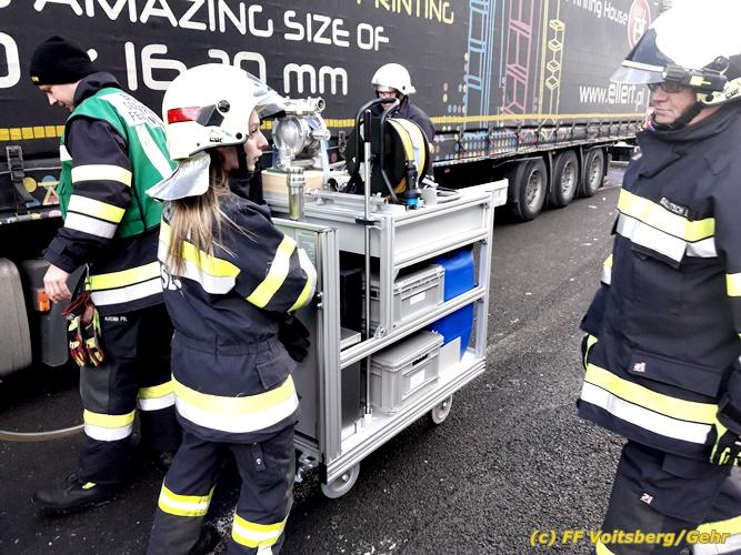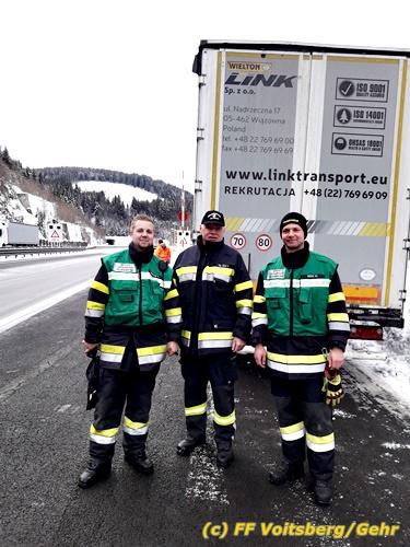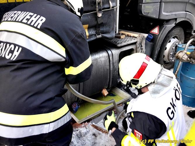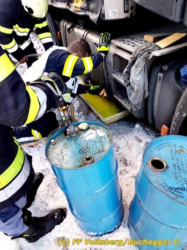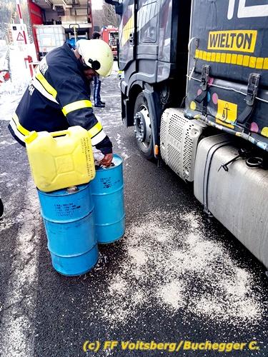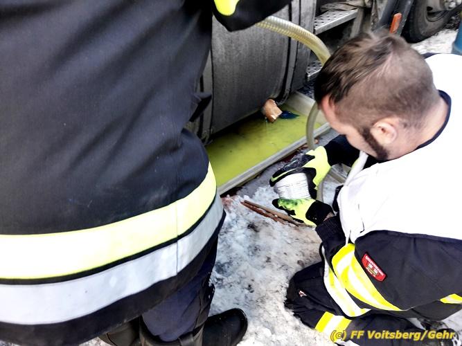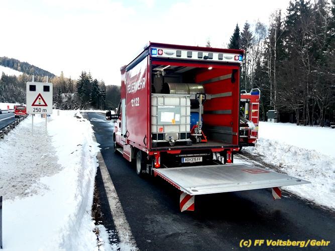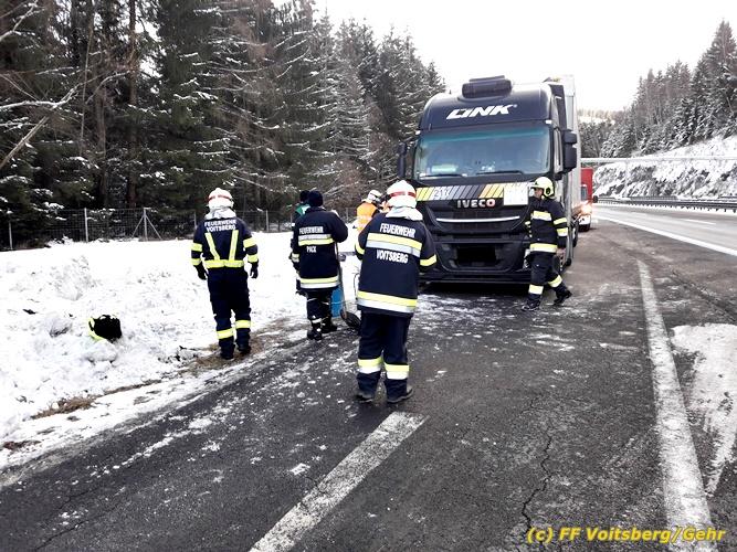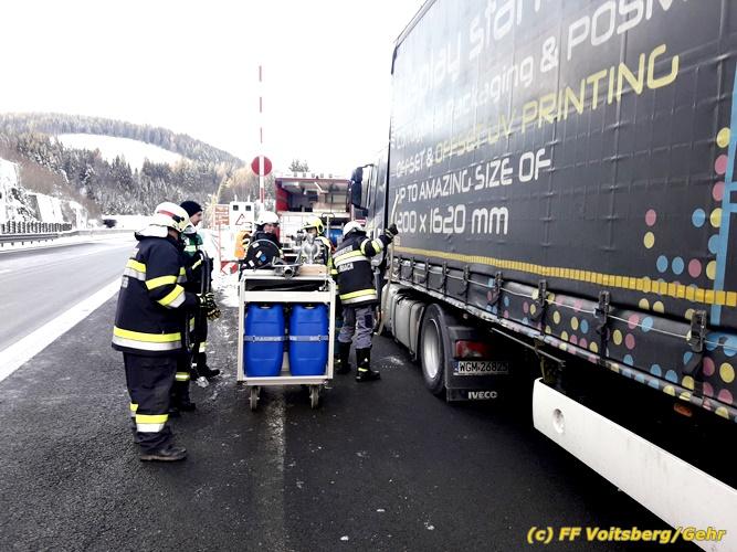 VOITSBERG, am 29.01.2019 Am Dienstag, 29. Jänner 2019 am frühen Nachmittag streifte ein polnischer LKW–Zug im Mitterbergtunnel der A2 mit seinem Tank die Randleiste und beschädigte diesen. Kurz nach dem Tunnel blieb er am Pannenstreifen stehen. Nach ca. 1 Stunde inspizierte ein vorbeifahrendes Fahrzeug der ASFINAG den am Pannenstreifen stehenden LKW und bemerkte den lecken Tank. Um 14.15 Uhr wurde Öl–Alarm ausgelöst und die FF Modriach, FF Pack und der Öl–Schadenszug der FF Voitsberg bzw. der BFV Voitsberg mit den Gefahrgutbeauftragten BI Kremaucz und BI Krenn sowie BR Gehr rückten aus. Der restliche Diesel wurde umgepumpt und das Leck abgedichtet. Der Chemiealarmdienst wurde alarmiert und ordnete das Ausbaggern des kontaminierten Materials an. Die Feuerwehren rückten um 17:30 Uhr wieder ein. Eingesetzt Kräfte: FF Pack FF Modriach Öl – Schadenszug Voitsberg Autobahnmeisterei Autobahnpolizei Chemiealarmdienst Text: Gehr Klaus/FF Voitsberg Fotos: Gehr, Buchegger C. (beide FF Voitsberg)
