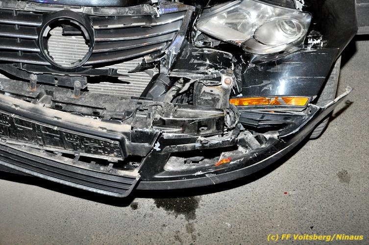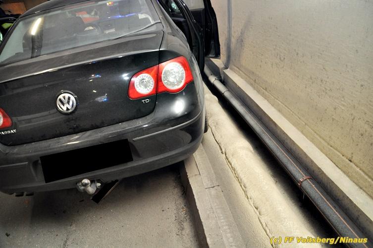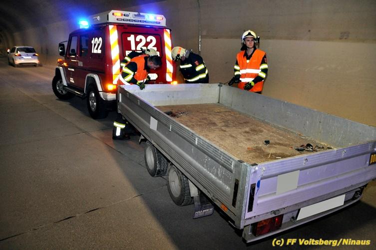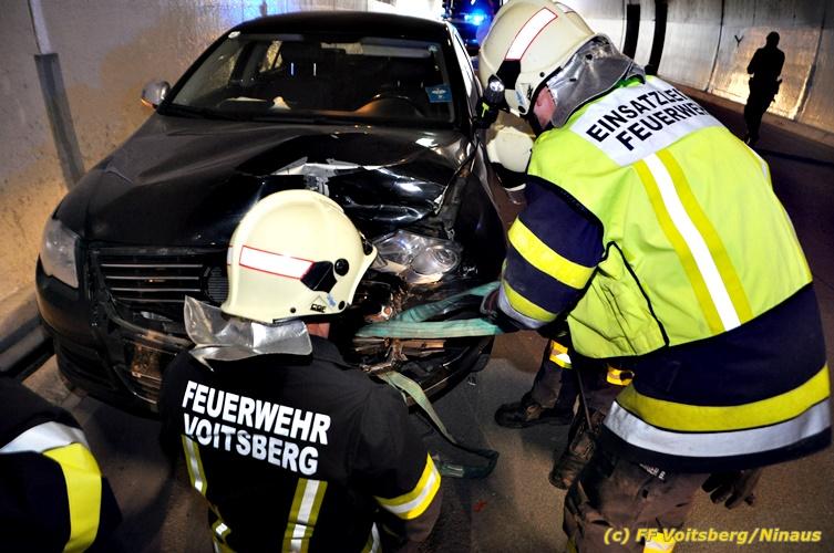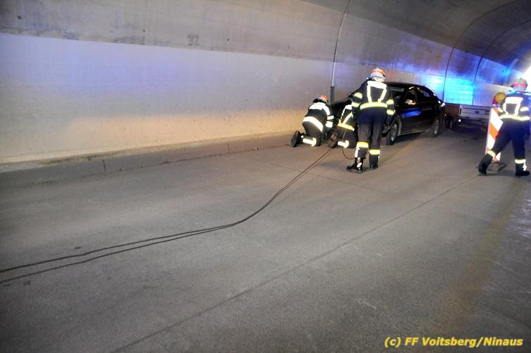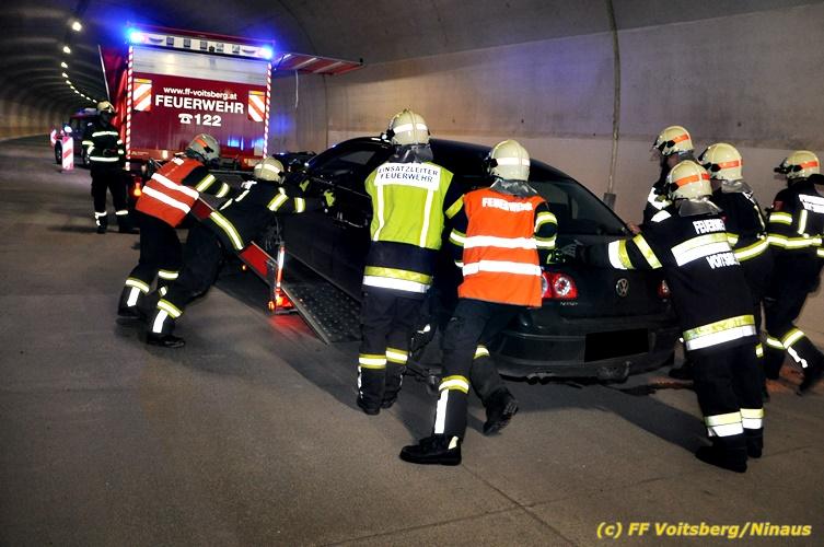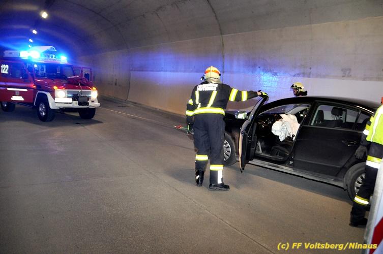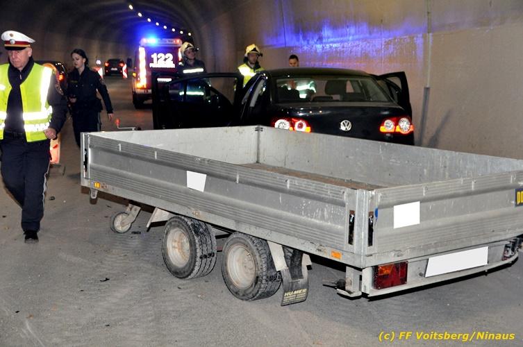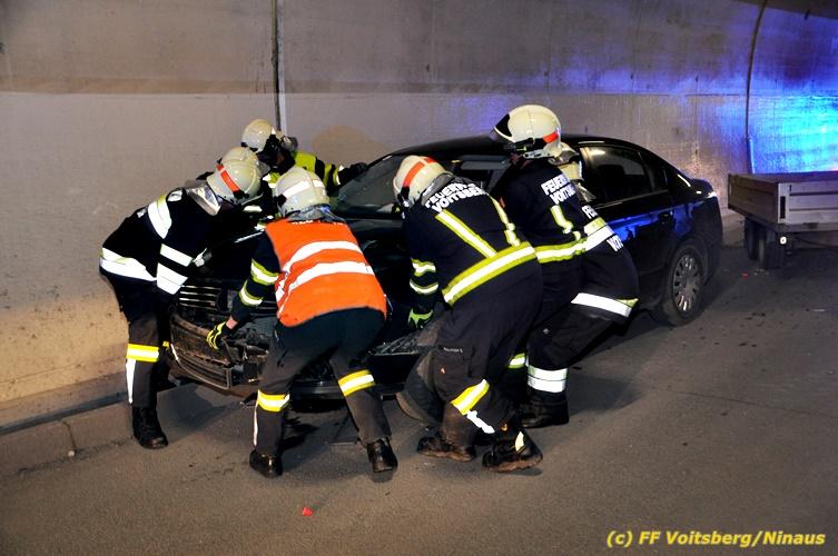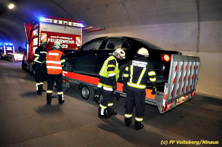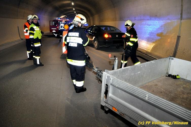 VOITSBERG, am 01.03.2019 Am Freitag, 1. März 2019 gegen 15 Uhr kam es im Voitsberger Umfahrungstunnel zu einem Verkehrsunfall. Ein PKW geriet gegen einen auf der Baustelle abgestellten Anhänger. Das Fahrzeug wurde schwer beschädigt und der Lenker konnte die Fahrt nicht mehr fortsetzen. Bei Ankunft der Einsatzkräfte konnte kein Lenker aufgefunden werden und die Ermittlungen wurden durch die Polizei Voitsberg eingeleitet. Aufgrund des Schadens kann es auch sein, dass sich im Fahrzeug zwei Personen befanden. Die alarmierte FF Voitsberg barg den PKW mittels Mehrzweckanhängers und den leicht beschädigten Anhänger mit einem Zugfahrzeug. Ausgeflossene Betriebsmittel wurden gebunden und entsorgt sowie herumliegende Wrackteile von der Fahrbahn entfernt. Während der Aufräumungs- und Bergungsarbeiten war der Umfahrungstunnel auch Richtung Köflach für ca. 30 Minuten gesperrt, wobei es im Stadtgebiet Voitsberg zu erheblichen Staus kam. Eingesetzte Kräfte: FF Voitsberg unter Einsatzleiter OBI Bernd Unger mit 12 Kräften Polizei Voitsberg mit 2 Beamten Text und Fotos: Walter Ninaus, FF Voitsberg