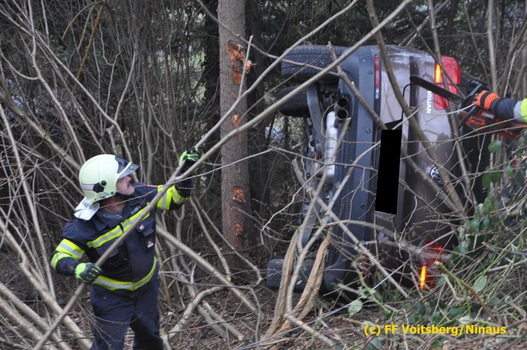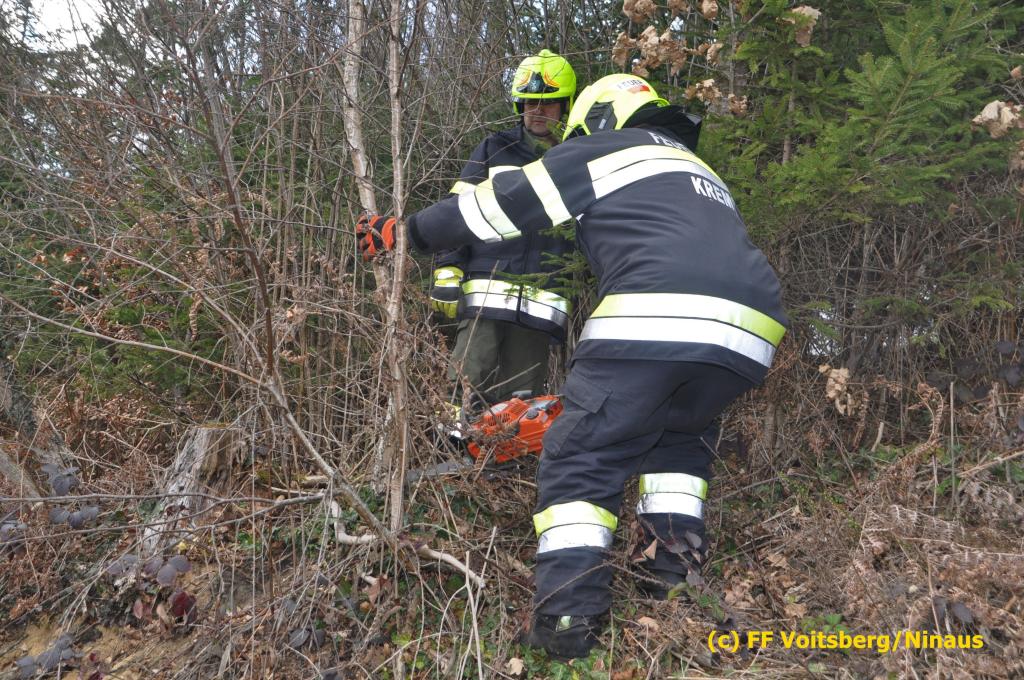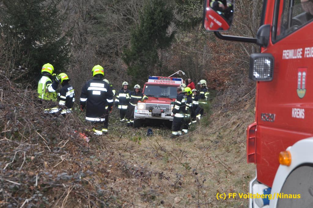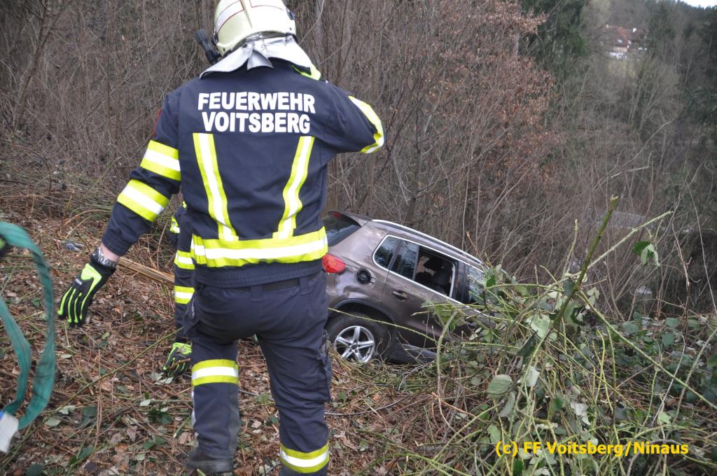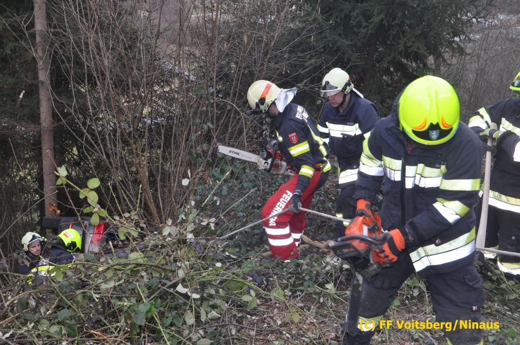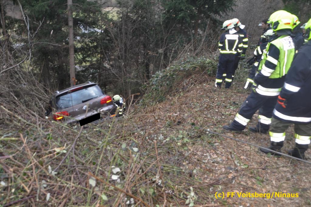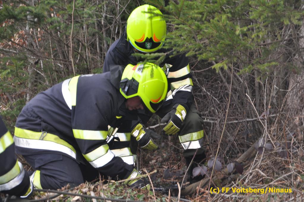 VOITSBERG, am 08.03.2019 Am Freitag, 8. März 2019 in den Nachmittagsstunden kam eine Lenkerin mit ihrem PKW auf der Lobminger Landesstrasse kurz nach der Ruppbauernhöhe in Richtung Voitsberg aus unbekannten Gründen links von der Fahrbahn ab, fuhr ca. 150 m einen Waldweg bergab und stürzte von diesem ca. 30 m nach links überschlagend gegen einen Baum und blieb dort hängen. Die Lenkerin konnte das Fahrzeug wie durch ein Wunder unverletzt verlassen. Der Einsatzleiter der zur Bergung alarmierten FF Krems entschied nach Feststellung der Lage als Unterstützung die FF Voitsberg anzufordern. Um zum bergenden Fahrzeug zu gelangen, musste mit Motorsägen eine Schneise geschnitten werden. Mit Seilwinden und Umlenkrollen wurde das schwer beschädigte Fahrzeug in Zusammenarbeit beider Wehren geborgen und von einem Autofahrerclub abgeschleppt. Text: Walter Ninaus, FF Voitsberg Fotos: Gallitsch und Ninaus, beide FF Voitsberg