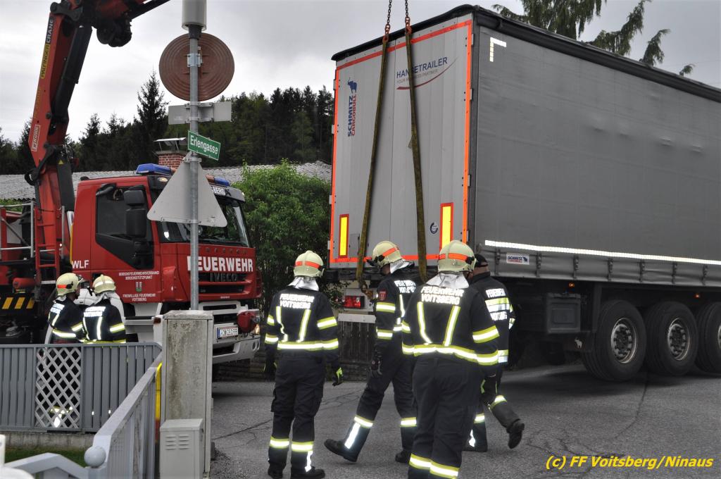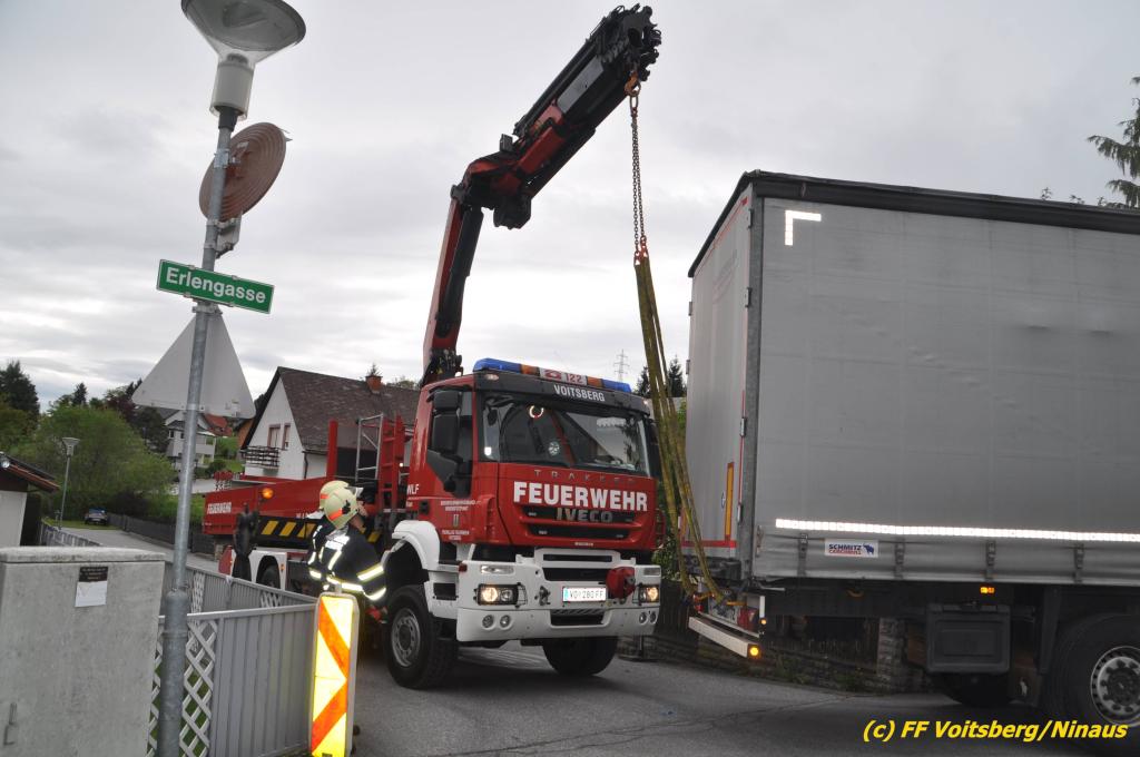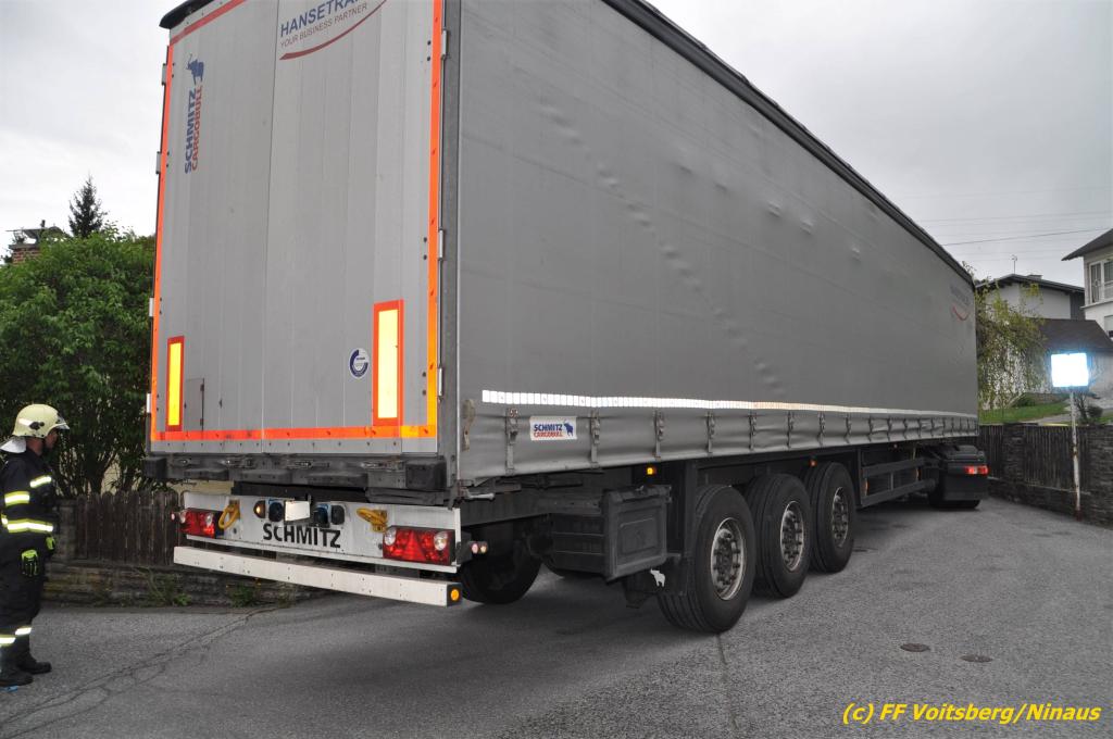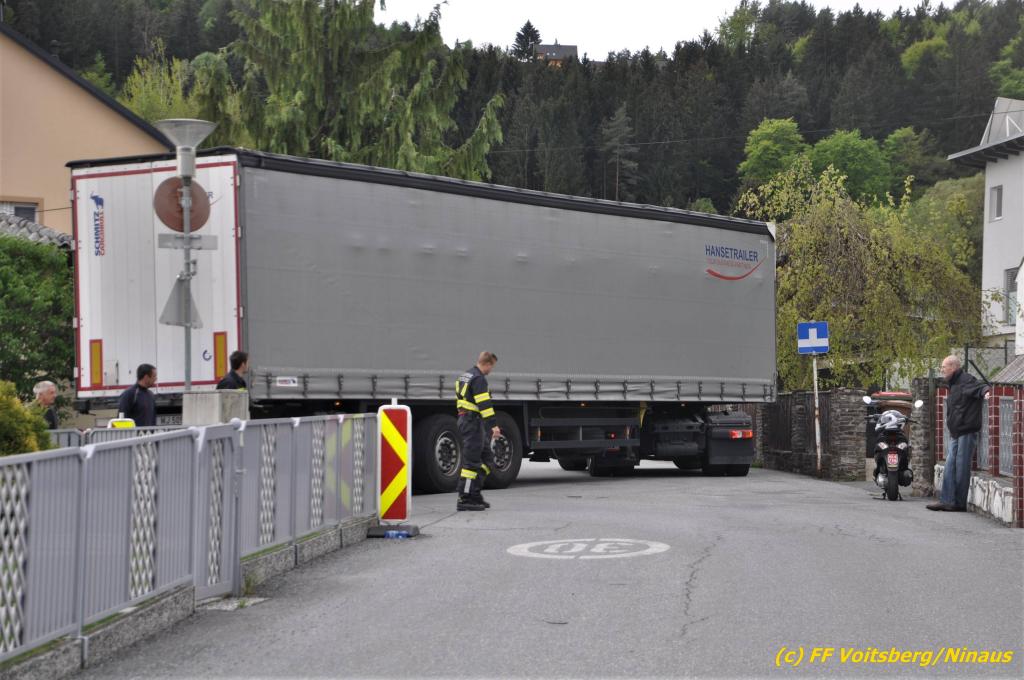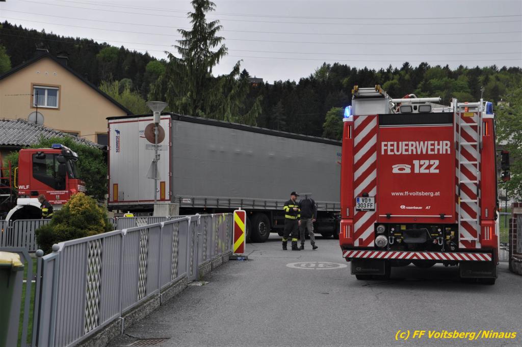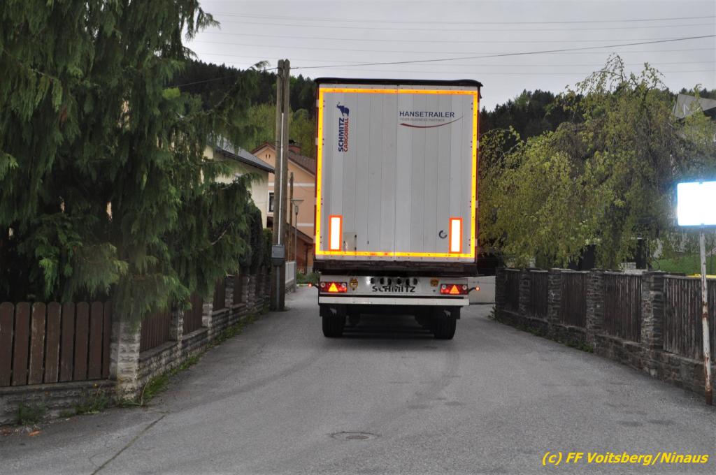 VOITSBERG, am 30.04.2019 Die FF Voitsberg wurde am Dienstag, 30. April 2019 kurz vor 9 Uhr zu einer Hilfeleistung gerufen. Ein LKW-Lenker aus Litauen fuhr trotz mehrfacher Verbots- und Gebotsschilder aufgrund des Vorschlages seines Navi in die Lindenhofgasse, weiter in den Weidenweg und blieb bei der Kreuzung mit der Erlengasse stecken. Er konnte weder vor noch zurück. Mit dem WLF-Kran wurde der Sattelschlepper aus seiner misslichen Situation gehoben und von den Feuerwehrkameraden durch die Erlengasse zu seinem Ziel gelotst. Schaden entstand keiner. Eingesetzte Kräfte unter Einsatzleiter OBI DI (FH) Bernd Unger: FF Voitsberg mit 7 Kameraden Text und Fotos: Walter Ninaus, FF Voitsberg