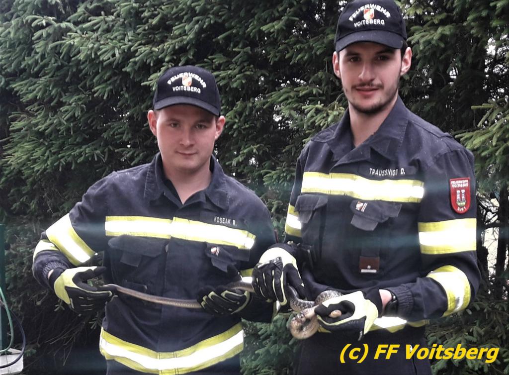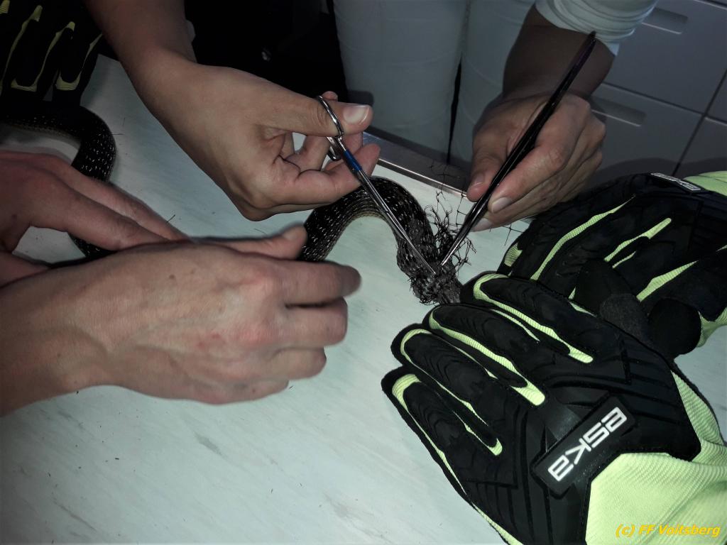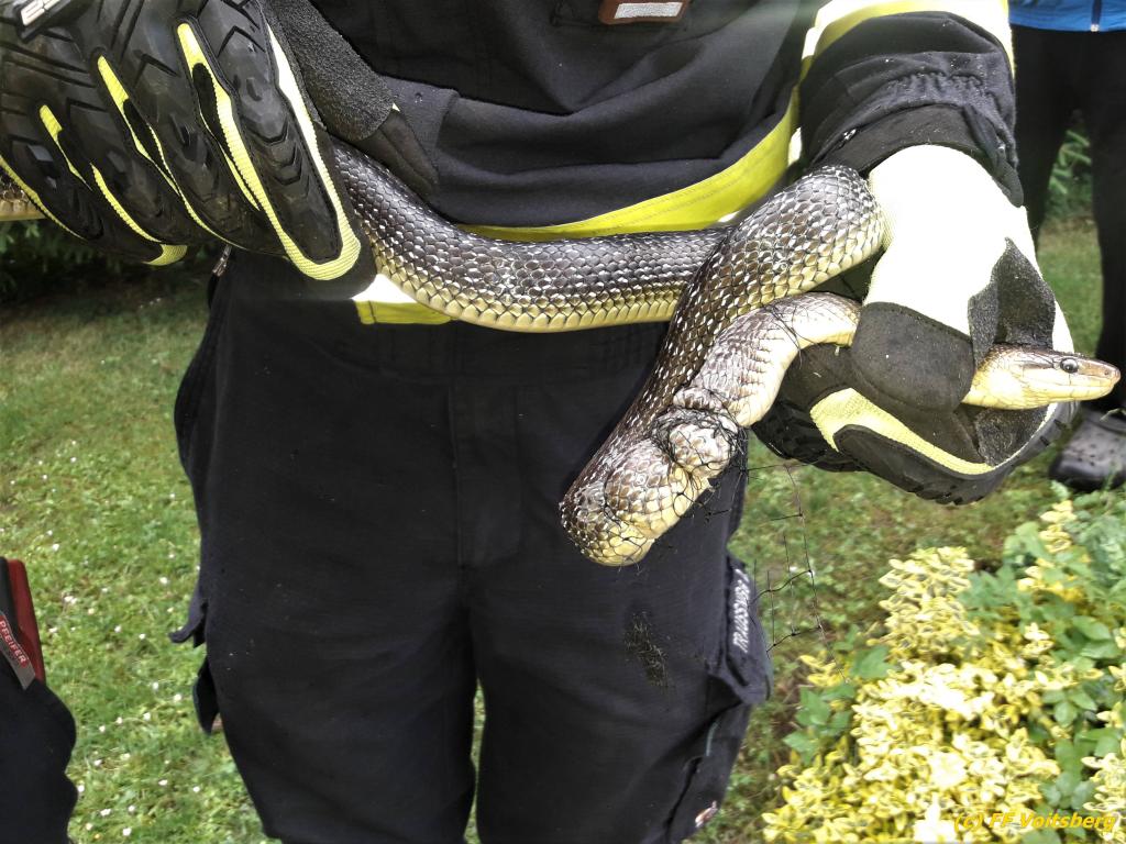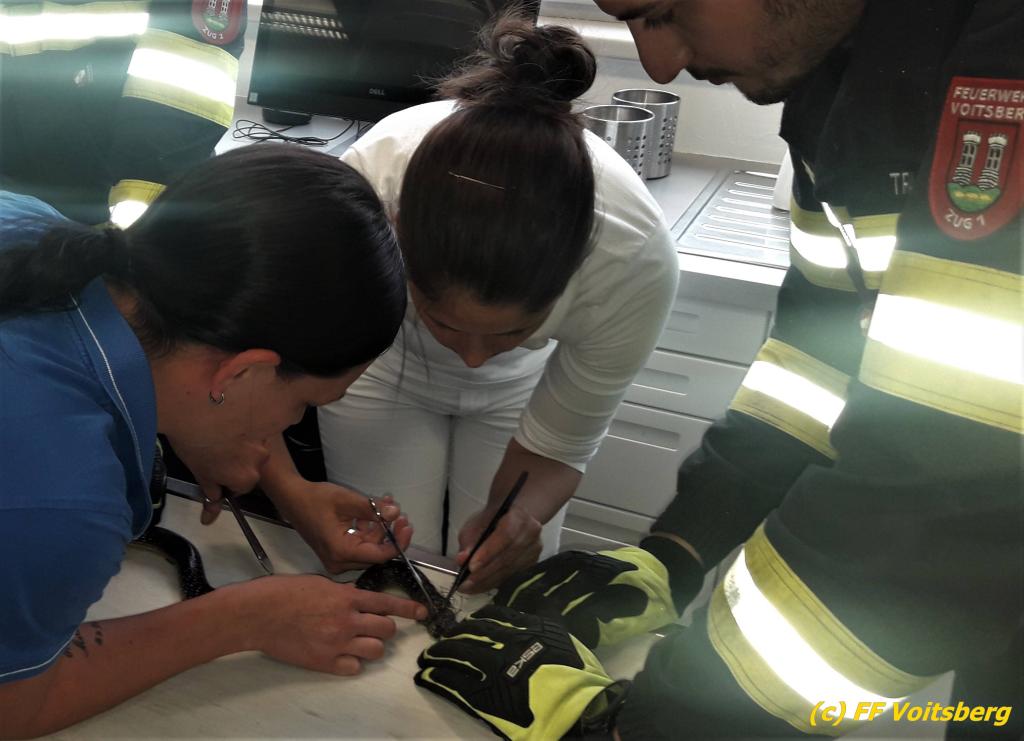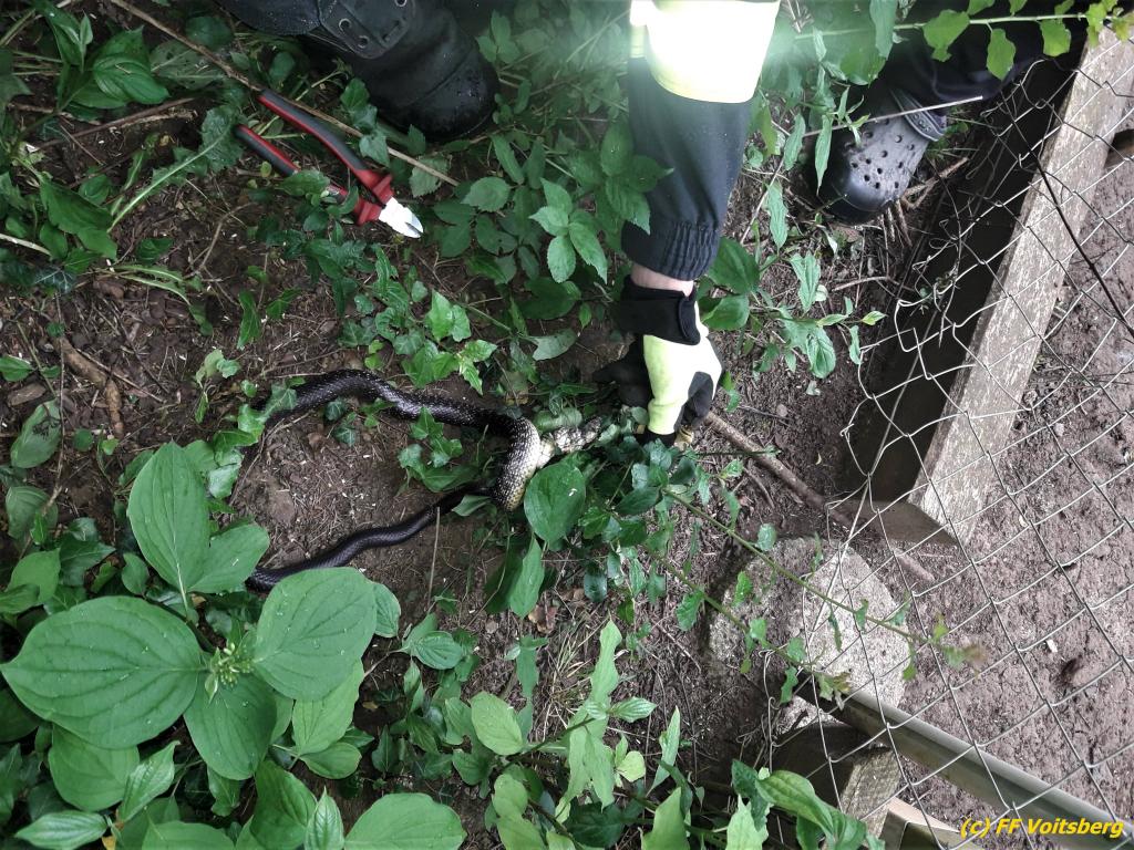 VOITSBERG, am 27.05.2019 Ein aufmerksamer Hausbesitzer am Voitsberger Schlossberg entdeckte am Montag, 27. Mai 2019 in den Vormittagsstunden eine Schlange an einem Zaun unter einem Gebüsch, die sich in einem Drahtgeflecht verfangen hatte. Die FF Voitsberg wurde zur Tierrettung alarmiert und rückte mit 2 Mann aus. Die Schlange konnte rasch aus ihrer misslichen Lage befreit werden, das Drahtgeflecht hatte sich jedoch so um ihren Körper gewickelt, dass es mit den Werkzeugen der Feuerwehr nicht entfernt werden konnte. Das Tier wurde in die ACC Tierklinik nach Rosental gebracht, wo es einer Tierärztin gelang, das eng anliegende Drahtgeflecht vom Körper der Schlange zu entfernen, ohne diese zu verletzten. Die ungiftige Äskulapnatter wurde anschließend wieder in seinen natürlichen Lebensraum verbracht und in die Freiheit entlassen. Text und Fotos: FF Voitsberg