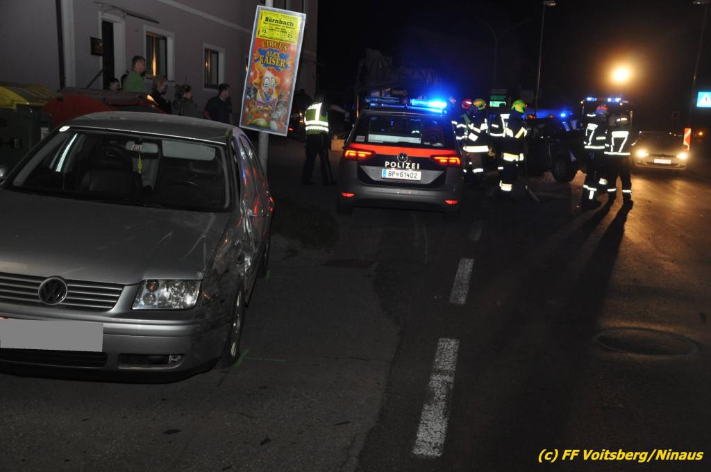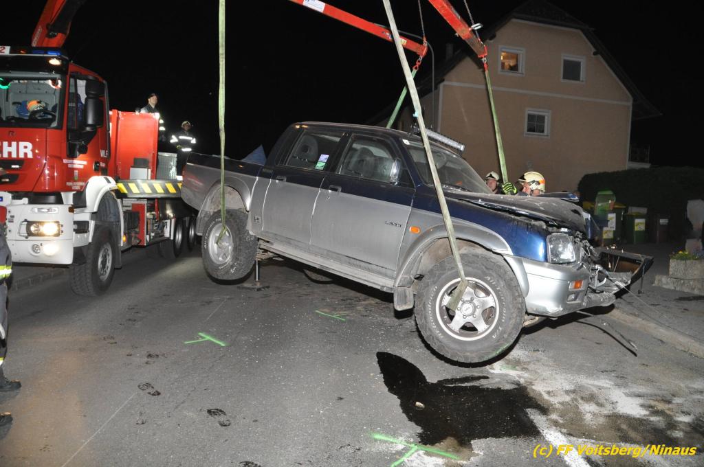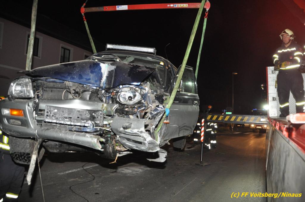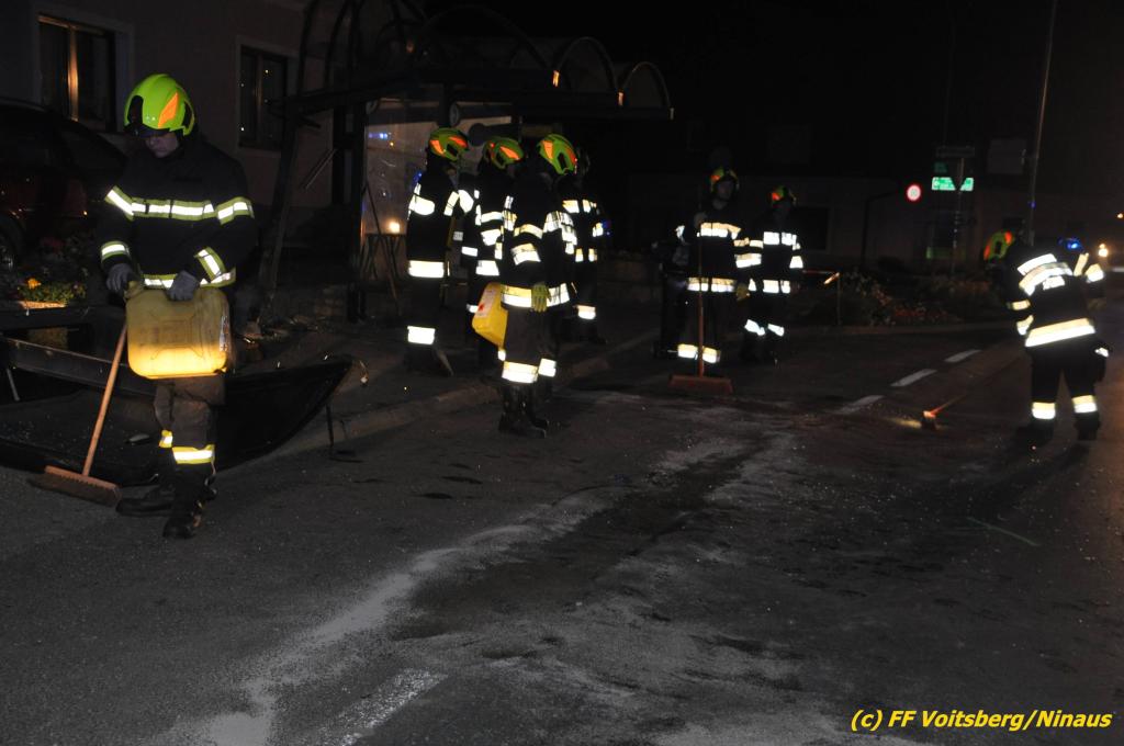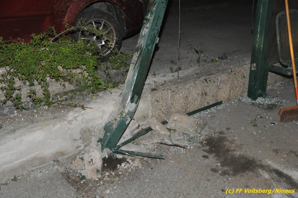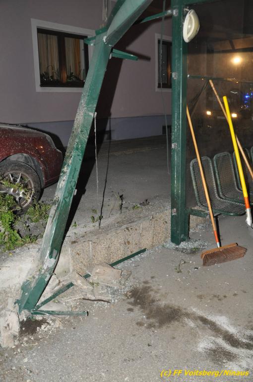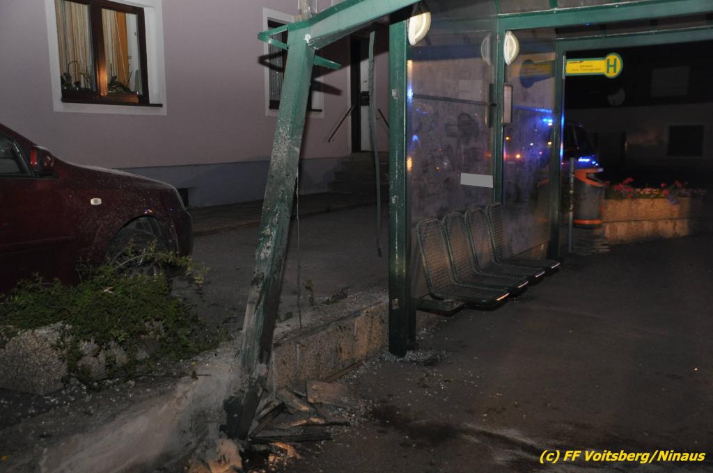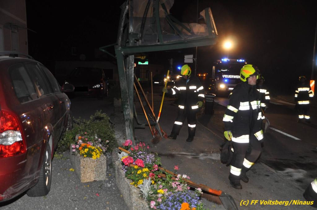 VOITSBERG, am 09.06.2019 Am Sonntag, 9. Juni 2019 kurz vor 1 Uhr früh ereignete sich auf der Kainacherstrasse in Bärnbach ein schwerer Verkehrsunfall. Ein Lenker eines geländegängigen Fahrzeuges verlor die Herrschaft über sein Fahrzeug, kam auf die linke Straßenseite, touchierte dort einen parkenden Pkw und in weiterer Folge stieß er mit voller Wucht gegen ein Wartehaus an einer Bushaltestelle. Dabei wurden die dort aufgestellten betonierten Blumenkisterl gegen ein weiteres Auto geschleudert. Beide parkenden Pkw wurden schwer beschädigt, ebenfalls das Wartehaus. Das Unfallauto kam sodann mitten auf der Landesstrasse zu stehen. Der Lenker konnte das Fahrzeug mit Verletzungen unbestimmten Grades verlassen und wurde mit dem Roten Kreuz Voitsberg in ein Krankenhaus gebracht. Die erstalarmierten Feuerwehren Bärnbach und Afling sicherten die Unfallstelle ab und bauten einen Brandschutz auf. Gleichzeitig wurden ausgeflossene Betriebsmittel gebunden und in späterer Folge fachgerecht entsorgt. Herumliegende Wrackteile wurden eingesammelt. Zwecks Bergung des schwer beschädigten Unfallwracks wurde das WLF-Kran der FF Voitsberg angefordert. Da weiterhin Betriebsmittel austraten, wurde das Fahrzeug auf einem gesicherten Stellplatz abgestellt. Die polizeilichen Erhebungen wurden von der Polizei Voitsberg durchgeführt. Eingesetzt unter Einsatzleiter Michael Kleindienst (FF Bärnbach) waren insgesamt 25 Einsatzkräfte der Feuerwehren Bärnbach, Afling und Voitsberg. Text und Fotos: Walter Ninaus, FF Voitsberg