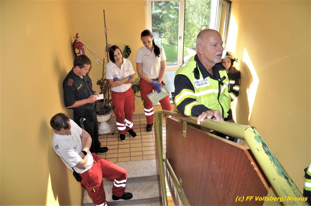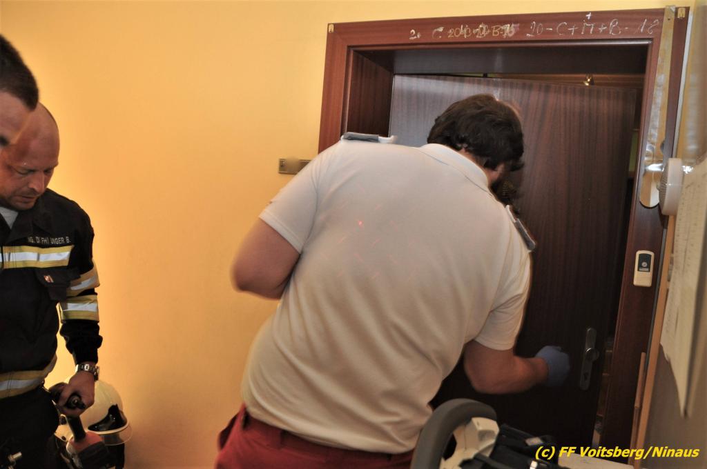 VOITSBERG, am 13.06.2019 Die FF Voitsberg wurde am 13. Juni 2019 um 6:58 Uhr zu einer Wohnungstüröffnung in die Grillparzerstrasse in Voitsberg alarmiert. Eine Wohnungsinhaberin brach in ihrer Wohnung zusammen und konnte nicht mehr aufstehen. Die verständigte Rettung konnte nicht zur Hilfesuchenden vordringen, da die Wohnungstüre versperrt war. KameradInnen der FF Voitsberg öffneten mit einem speziellen Türöffnungsset die Wohnung und ermöglichten den Zutritt der Notärztin, welche die Frau versorgte und danach vom Roten Kreuz Voitsberg ins LKH Voitsberg einliefern ließ. Die FF Voitsberg war mit 7 KameradInnen unter der Einsatzleitung von BR Ing. Klaus Gehr im Einsatz, das Rote Kreuz Voitsberg mit einer Notärztin und 3 Sanitätern und die Polizei Voitsberg mit 2 Beamten. Text und Fotos: Walter Ninaus, FF Voitsberg