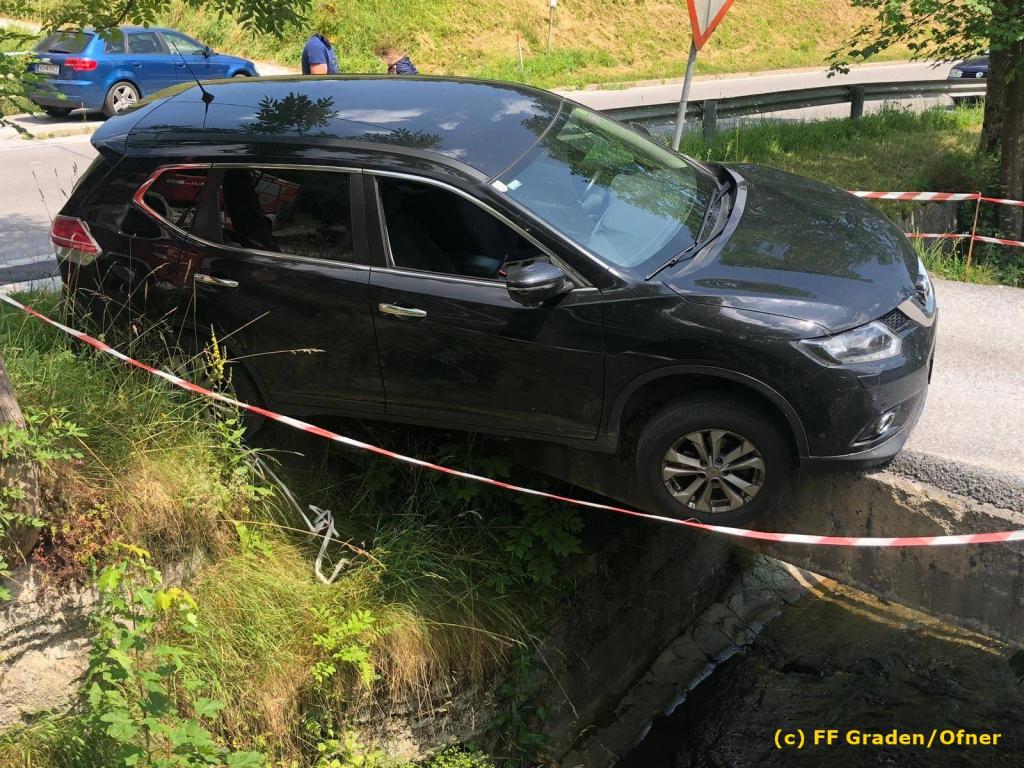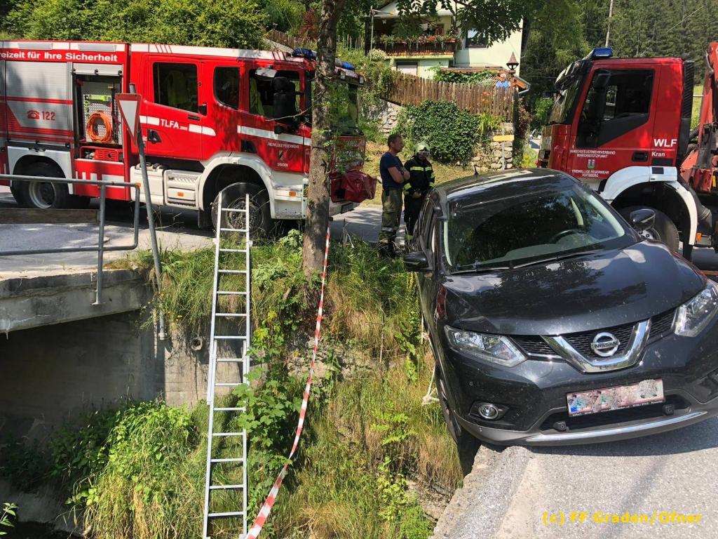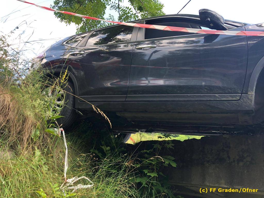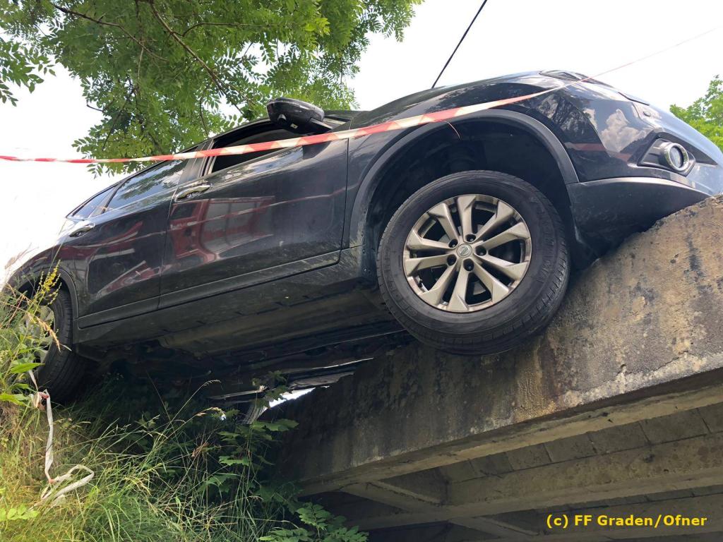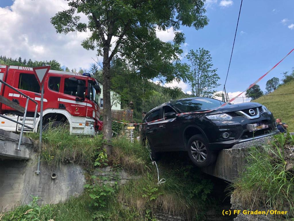 VOITSBERG, am 06.07.2019 Am Samstag, 6. Juli 2019 kurz nach Mittag kam ein Pkw von der Strasse ab und drohte abzustürzen. Er steckte mit der Bodenplatte an einer Brücke und die rechten Räder waren in der Luft. Zwecks Bergung wurde das WLF-Kran der FF Voitsberg über die LLZ Steiermark von der einsatzleitenden Feuerwehr Graden angefordert. Die Bergung verlief reibungslos, sodass der Lenker die Fahrt ohne Schaden fortsetzen konnte. Eingesetzt waren insgesamt 9 Kameraden der Feuerwehren Graden und Voitsberg. Fotos: David Ofner/FF Graden Text: Walter Ninaus/FF Voitsberg