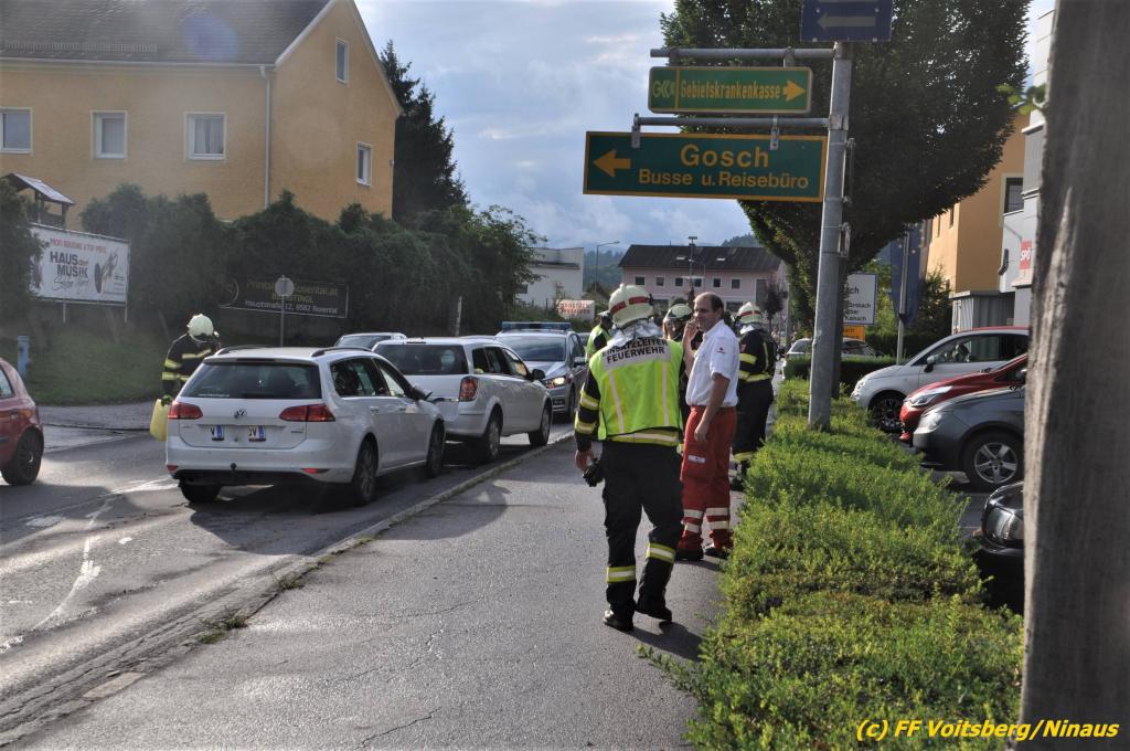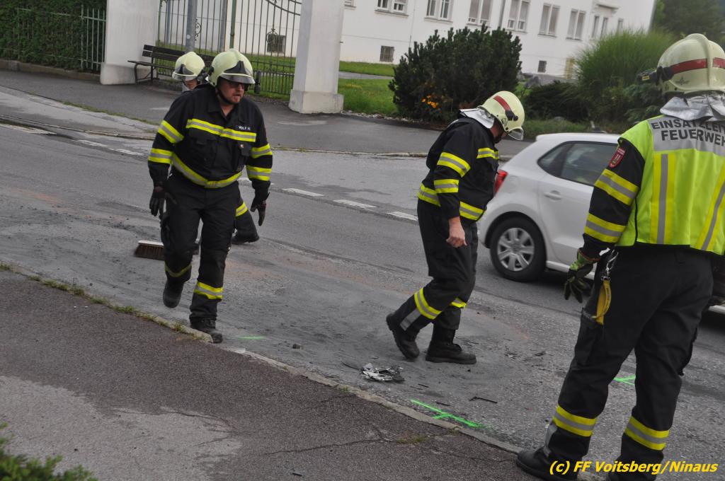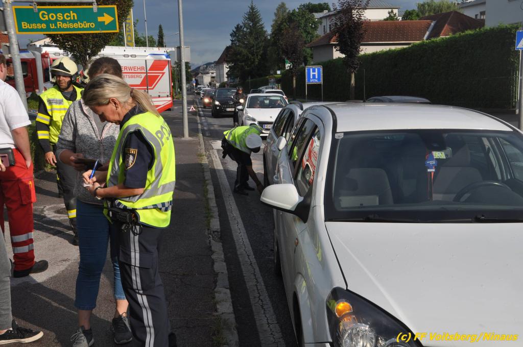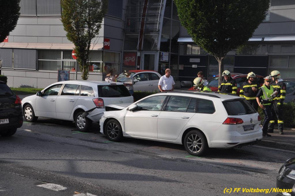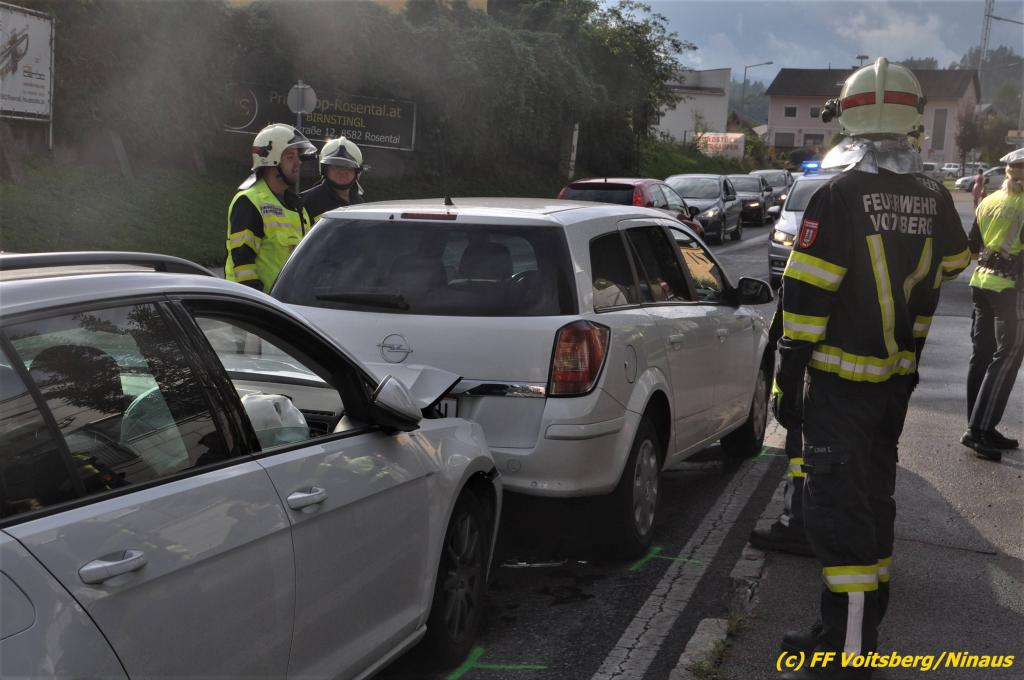 VOITSBERG, am 02.08.2019 Am Freitag, 2. August 2019 um 18:09 Uhr wurde die FF Voitsberg in die C.v.Hötzendorfstrasse zu einem Verkehrsunfall alarmiert. Bei einem Auffahrunfall waren drei Fahrzeuge beteiligt. Die Fahrzeuge wurden nach den Erhebungen der Polizei von der Straße gebracht. Herumliegende Wrackteile wurden eingesammelt und ausgelaufene Betriebsmittel gebunden und fachgerecht entsorgt. Verletzt wurde niemand. Durch die Bergungs- und Vermessungsarbeiten kam es im gesamten Stadtgebiet Voitsberg zu einem ausgedehnten Stau. Eingesetzt unter der Einsatzleitung von Harald Kremaucz waren 8 Kameraden der FF Voitsberg sowie zwei Streifen der Polizei.