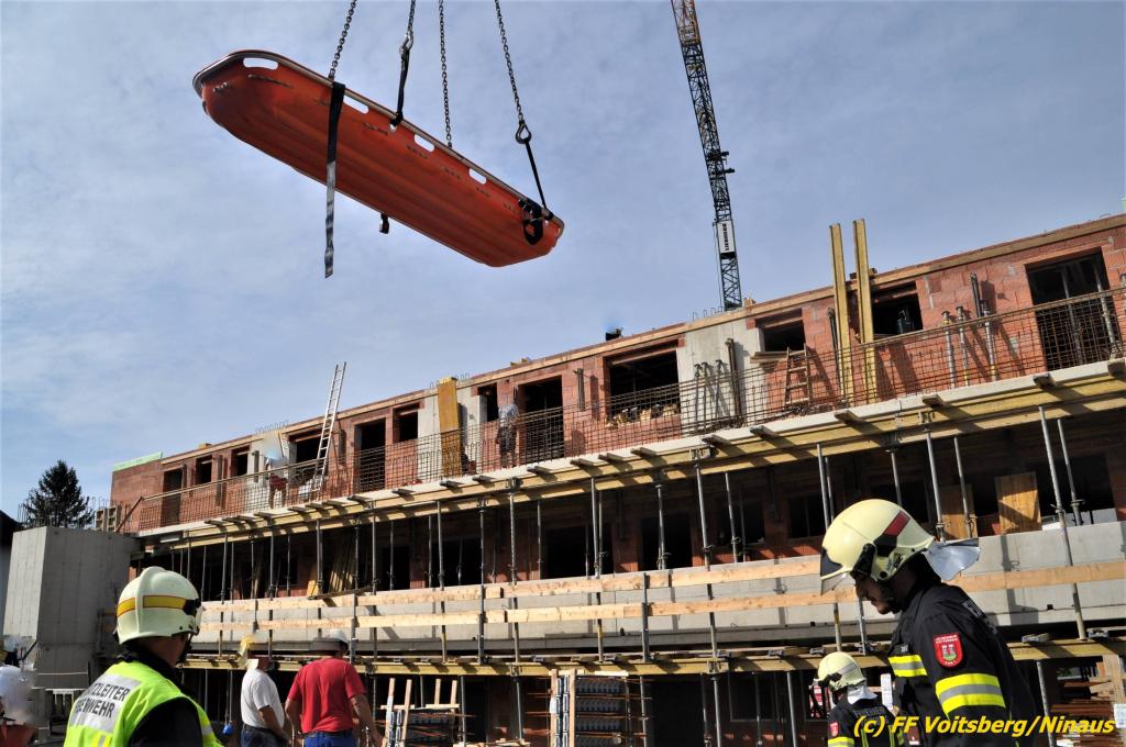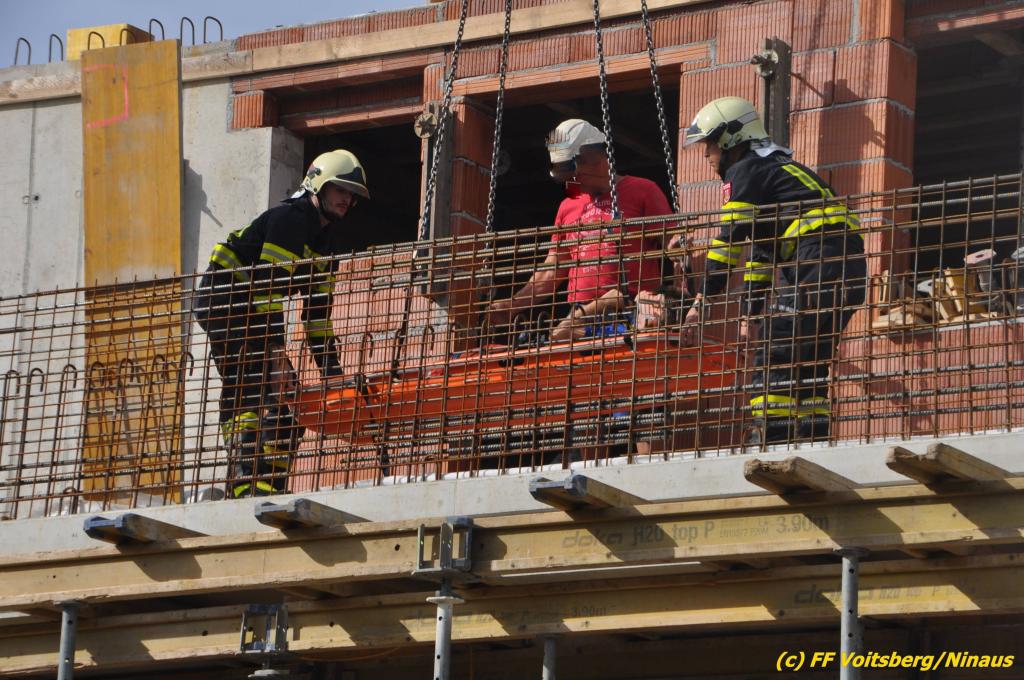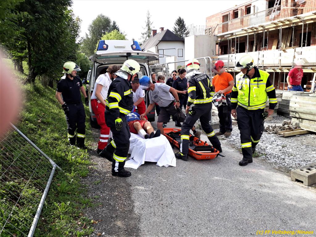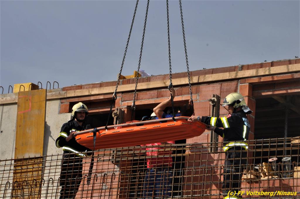 VOITSBERG, am 05.08.2018 Auf einer Baustelle eines Mehrparteienhauses in der Jungferngasse in Voitsberg stürzte am Montag, 5. August um ca. 8:35 Uhr im 2. Obergeschoß ein Arbeiter von der Leiter auf den Balkon. Dabei zog er sich Verletzungen am Bein zu und konnte nicht mehr über die Leiter geborgen werden. Die alarmierte FF Voitsberg rettete nach der Erstversorgung von Sanitätern des Roten Kreuzes den Bauarbeiter gesichert mit einer Trage unter Mithilfe eines Baukranes. Unter der Einsatzleitung von BR Ing. Klaus Gehr waren 6 Kameraden im Einsatz. Drei Sanitätern des Roten Kreuzes Voitsberg-Köflach sowie 3 Beamtinnen der PI Voitsberg waren ebenfalls im Einsatz.