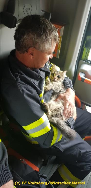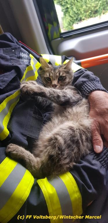 VOITSBERG, am 18.09.2019 Katze in gekipptem Fenster im ersten Stock eingeklemmt - Aufstieg zur Katze mittels Schiebeleiter und Rettung - Weitertransport des geschwächten Tieres zu einem Tierarzt
