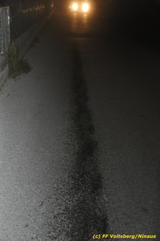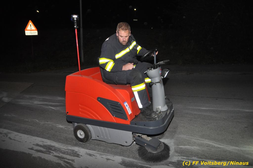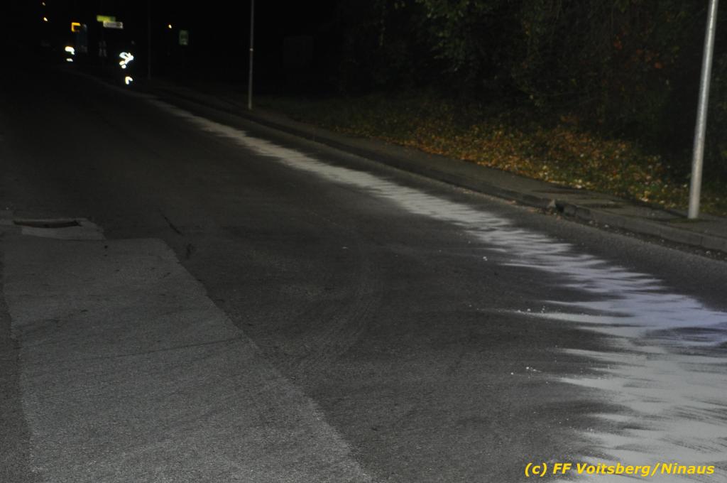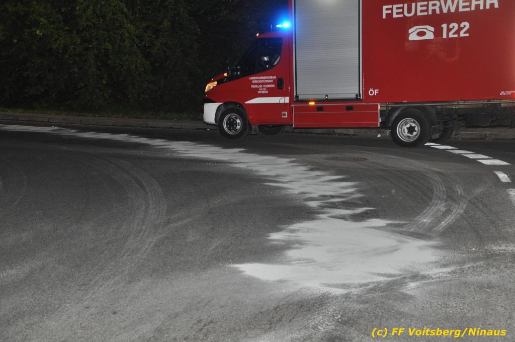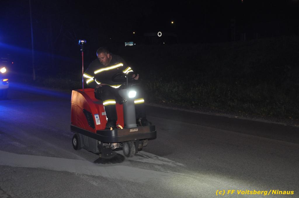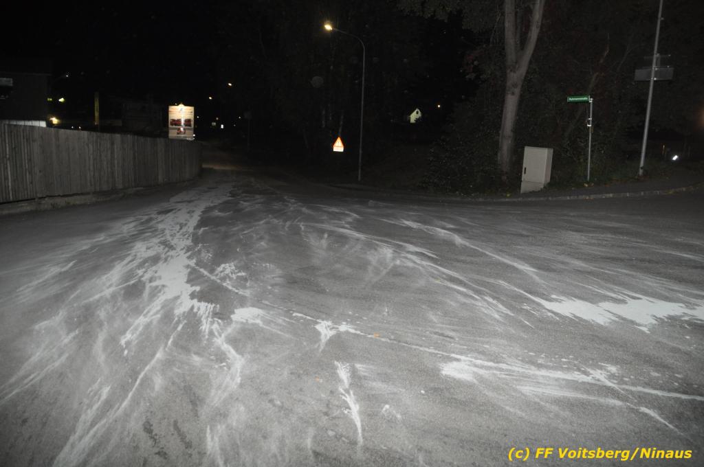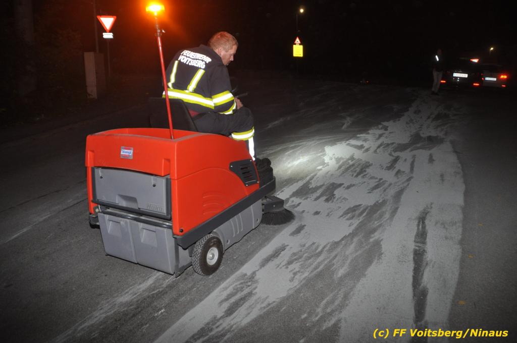 VOITSBERG, am 01.10.2019 Aufgrund eines technischen Gebrechens verlor am 1. Oktober um ca. 20 Uhr ein Kfz Motoröl und verschmutzte die Ruhmannstrasse und die Arnsteinstrasse in Voitsberg auf einer Gesamtlänge von ca. 500 m. Die alarmierte Feuerwehr Voitsberg rückte aus, um die ausgeflossenen Betriebsmittel zu binden und mit einer feuerwehreigenen Kehrmaschine einzusammeln. Das verunreinigte Bindemittel wurde fachgerecht entsorgt. Ein Mitarbeiter des städtischen Bauhofes sicherte die Gefahrenstellen mit Hinweisschilder „Ölspur“ ab.