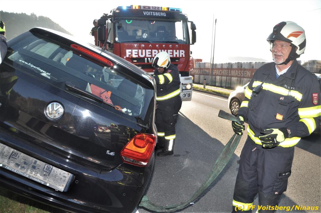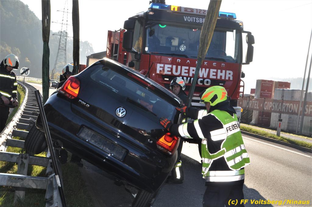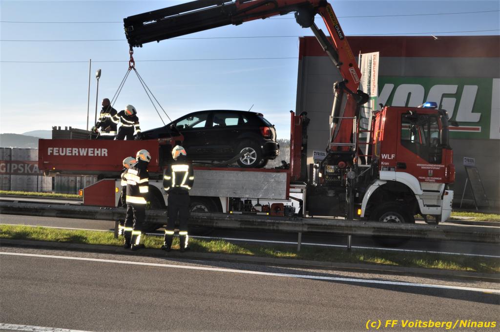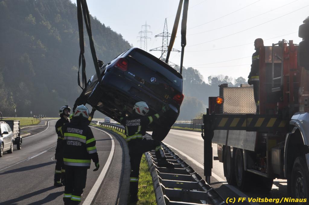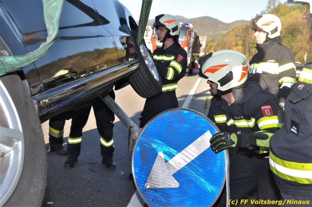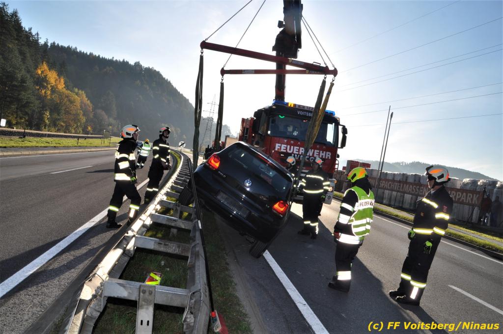 VOITSBERG, am 23.10.2019 Ein spektakulärer Unfall ereignete sich am Mittwoch, 23. Oktober um ca. 8 Uhr auf der B 70 in Rosental. Eine PKW-Lenkerin wurde auf der zweispurigen Richtungsfahrbahn nach Graz von der Sonne derart geblendet, dass sie die Orientierung verlor. Der PKW schlitterte mit der linken Seite auf die Mittelleitschiene, kippte nach rechts auf die Fahrbahn und dann wieder zurück auf die Leitschiene. Dadurch blockierte das Fahrzeug einen Fahrstreifen. Die Lenkerin blieb unverletzt hatte aber großes Glück, da sich die Stange eines Verkehrszeichens durch die Bodenplatte in den Kofferraum bohrte. Wäre dies einen Meter davor passiert, hätte es tragisch ausgehen können. Die alarmierte FF Rosental sicherte die Unfallstelle ab, regelte den Verkehr und band ausgeflossene Betriebsmittel. Zwecks Bergung und Abtransport auf einen gesicherten Platz wurde das WLF-Kran der FF Voitsberg nachalarmiert.