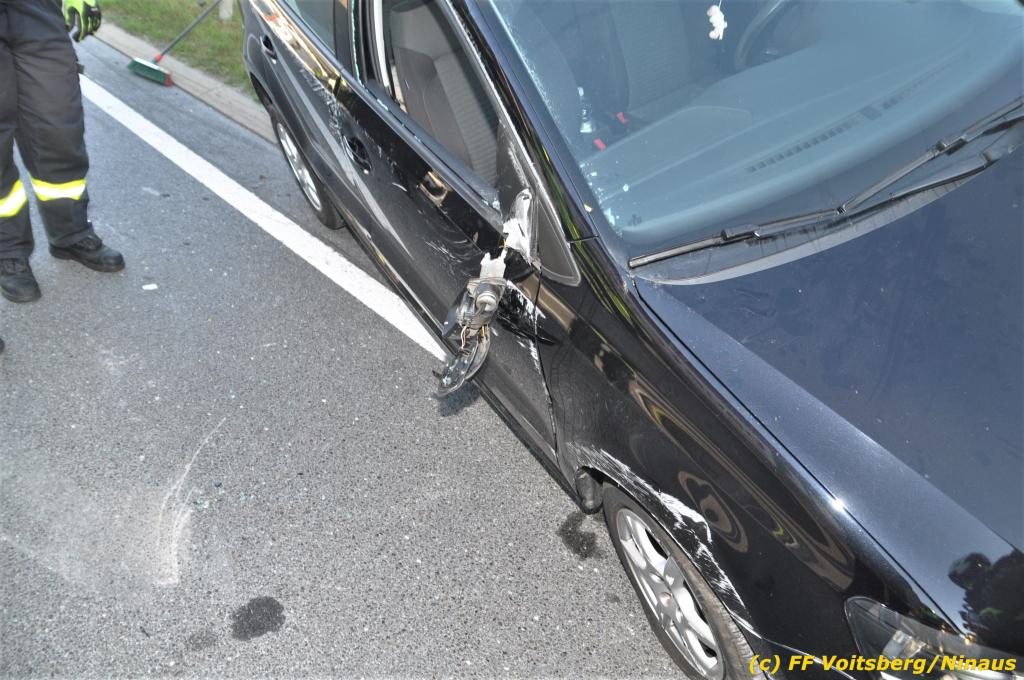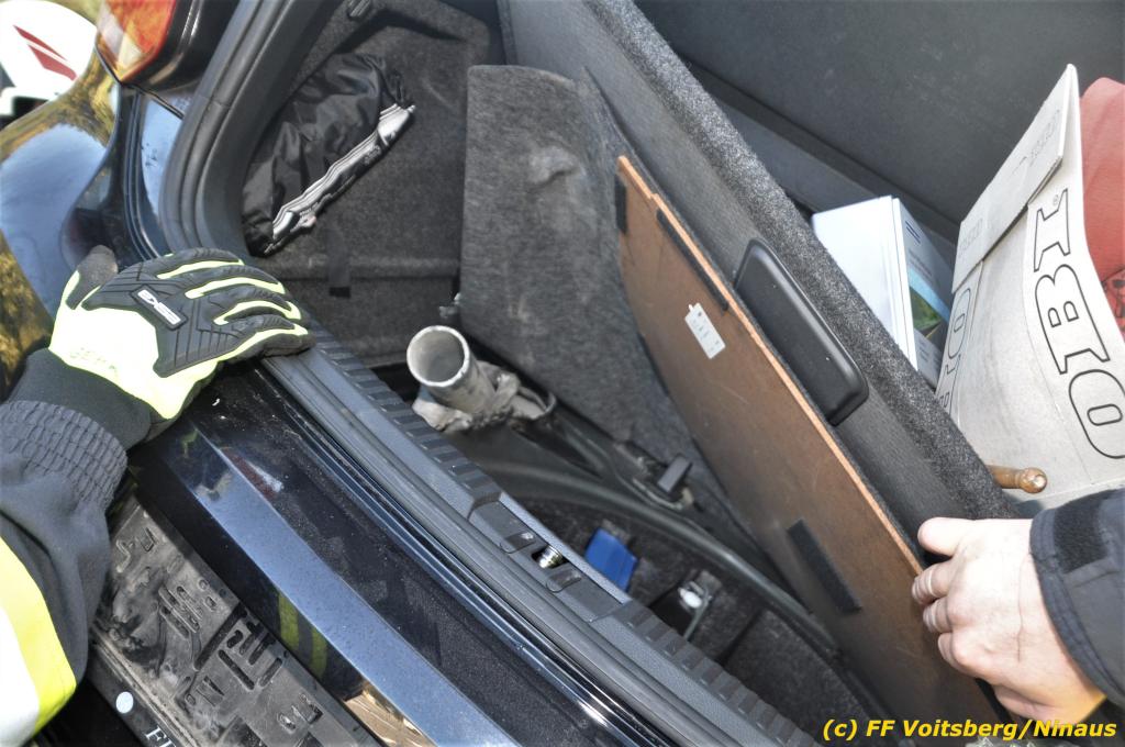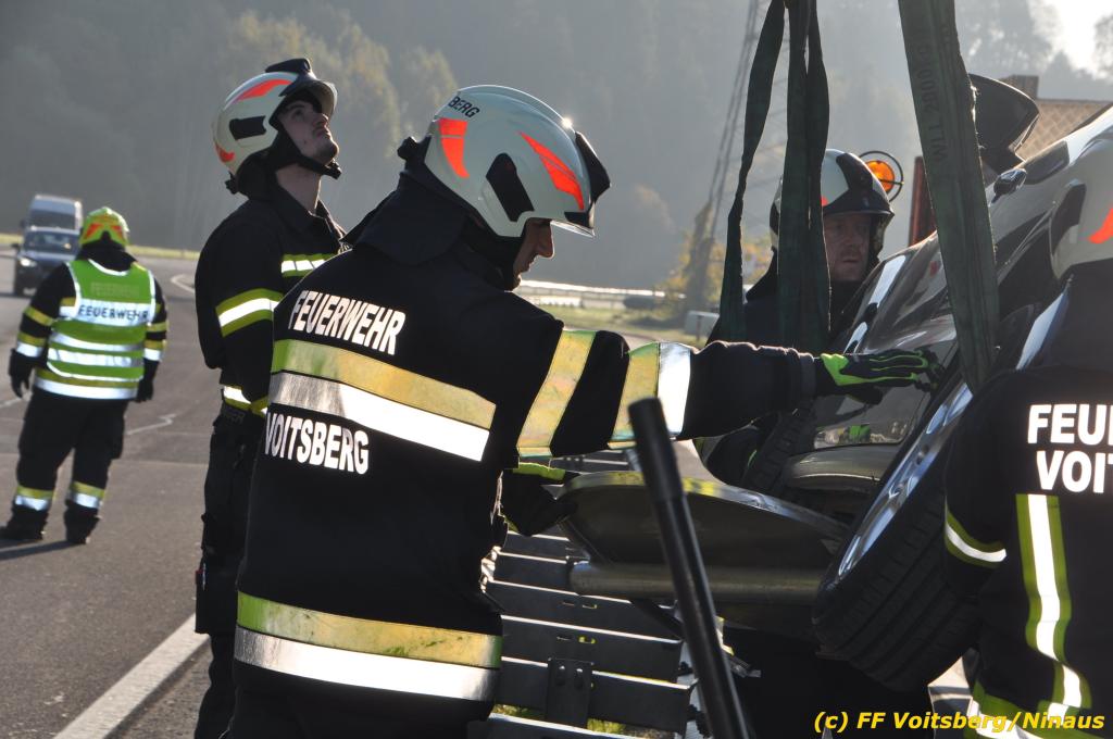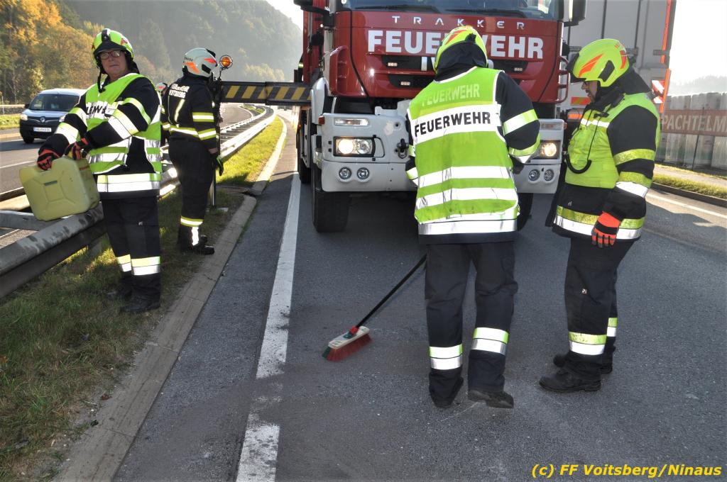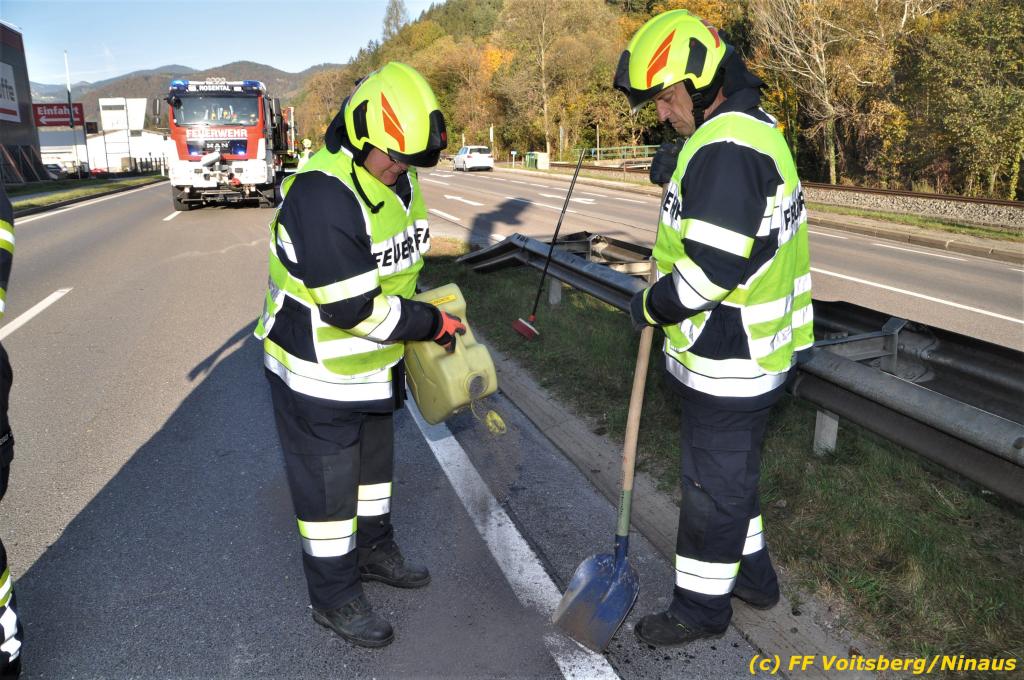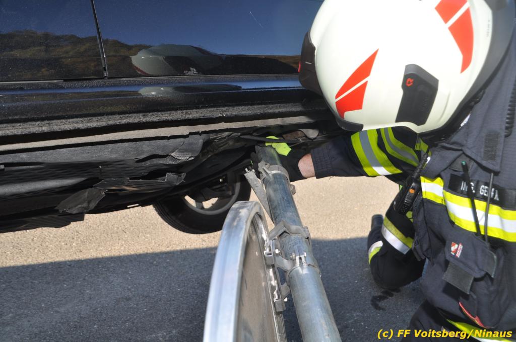 VOITSBERG, am 23.10.2019 Ein spektakulärer Unfall ereignete sich am Mittwoch, 23. Oktober um ca. 8 Uhr auf der B 70 in Rosental. Eine PKW-Lenkerin wurde auf der zweispurigen Richtungsfahrbahn nach Graz von der Sonne derart geblendet, dass sie die Orientierung verlor. Der PKW schlitterte mit der linken Seite auf die Mittelleitschiene, kippte nach rechts auf die Fahrbahn und dann wieder zurück auf die Leitschiene. Dadurch blockierte das Fahrzeug einen Fahrstreifen. Die Lenkerin blieb unverletzt hatte aber großes Glück, da sich die Stange eines Verkehrszeichens durch die Bodenplatte in den Kofferraum bohrte. Wäre dies einen Meter davor passiert, hätte es tragisch ausgehen können. Die alarmierte FF Rosental sicherte die Unfallstelle ab, regelte den Verkehr und band ausgeflossene Betriebsmittel. Zwecks Bergung und Abtransport auf einen gesicherten Platz wurde das WLF-Kran der FF Voitsberg nachalarmiert.