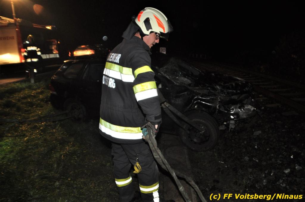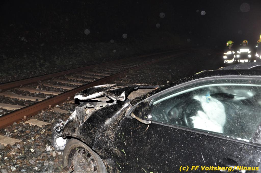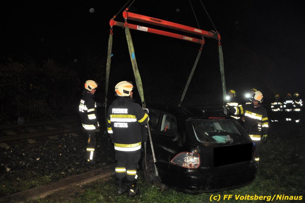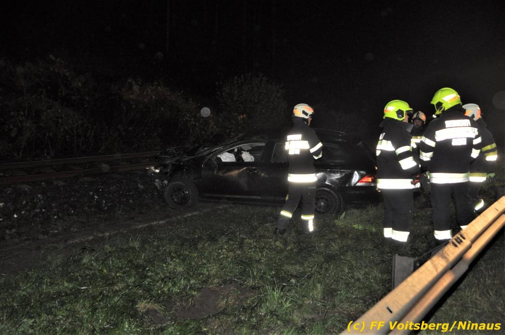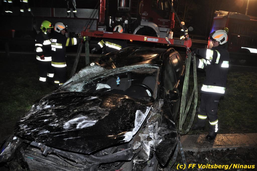 VOITSBERG, am 01.11.2019 Die FF Voitsberg wurde am Freitag, 1. November 2019 kurz nach 2 Uhr seitens der einsatzleitenden FF Krems zu einer Fahrzeugbergung in den Kremser Reihen Fahrtrichtung Graz in Voitsberg zwecks Unterstützung nachalarmiert. Ein von der B 70 abgekommener PKW geriet auf eine Leitschiene, wurde ca. 30 m durch die Luft geschleudert, überschlug sich einige Male und kam neben der Bahngleise der GKB zu stehen. Die Bergung erfolgte mit dem WLF-Kran der FF Voitsberg. Da Betriebsmittel aus dem schwer beschädigten Fahrzeug ausflossen, wurde dieser auf einen gesicherten Platz abgestellt. Der Lenker wurde mit Verletzungen unbestimmten Grades in ein Krankenhaus eingeliefert. Die FF Krems übernahm die Einsatzleitung, sicherte die Unfallstelle ab, baute einen Brandschutz auf, band ausgelaufene Betriebsmittel und sammelte herumliegende Wrackteile ein.