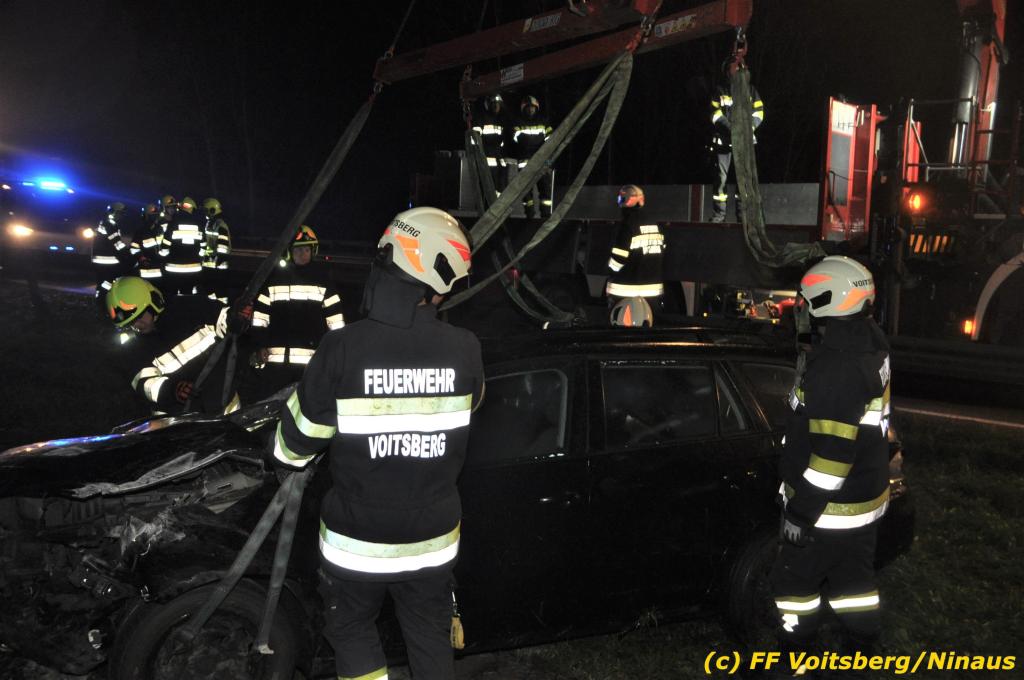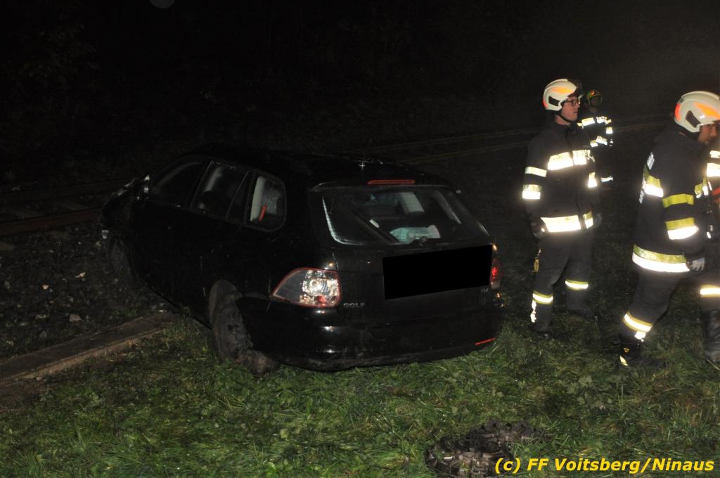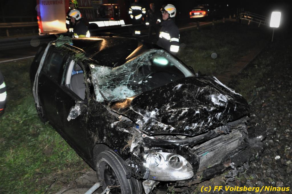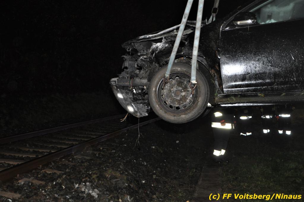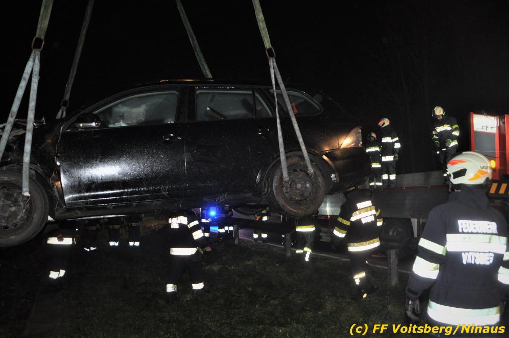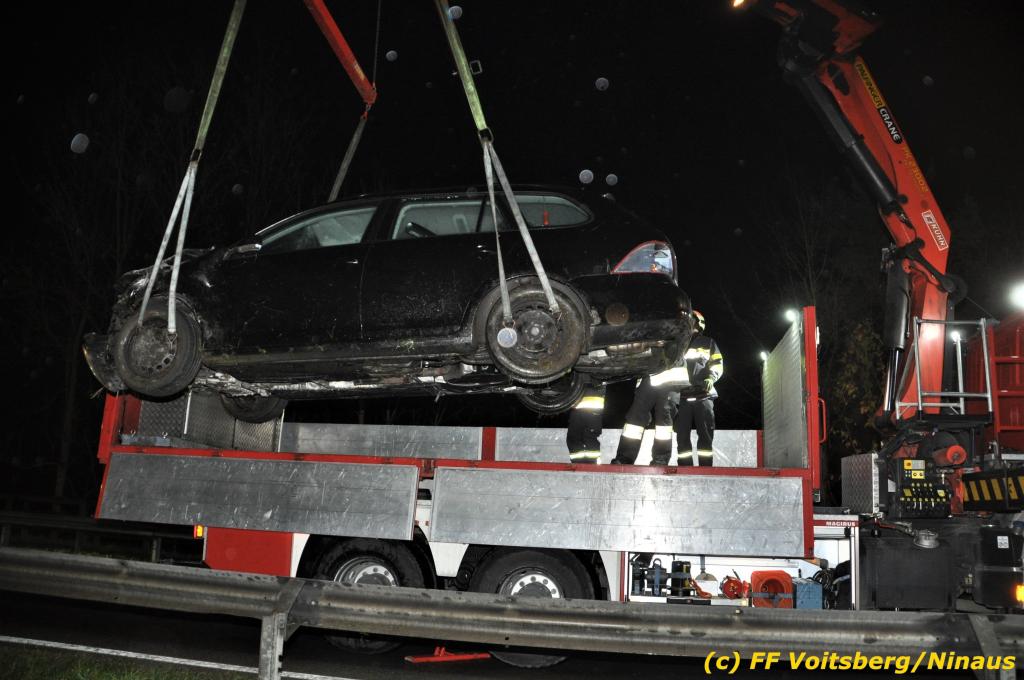VOITSBERG, am 01.11.2019 Die FF Voitsberg wurde am Freitag, 1. November 2019 kurz nach 2 Uhr seitens der einsatzleitenden FF Krems zu einer Fahrzeugbergung in den Kremser Reihen Fahrtrichtung Graz in Voitsberg zwecks Unterstützung nachalarmiert. Ein von der B 70 abgekommener PKW geriet auf eine Leitschiene, wurde ca. 30 m durch die Luft geschleudert, überschlug sich einige Male und kam neben der Bahngleise der GKB zu stehen. Die Bergung erfolgte mit dem WLF-Kran der FF Voitsberg. Da Betriebsmittel aus dem schwer beschädigten Fahrzeug ausflossen, wurde dieser auf einen gesicherten Platz abgestellt. Der Lenker wurde mit Verletzungen unbestimmten Grades in ein Krankenhaus eingeliefert. Die FF Krems übernahm die Einsatzleitung, sicherte die Unfallstelle ab, baute einen Brandschutz auf, band ausgelaufene Betriebsmittel und sammelte herumliegende Wrackteile ein.
