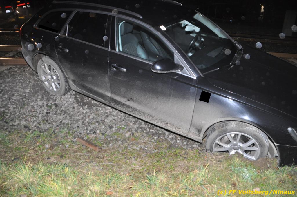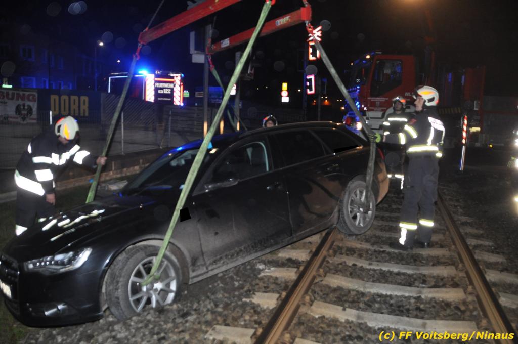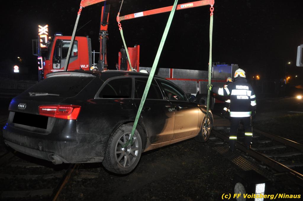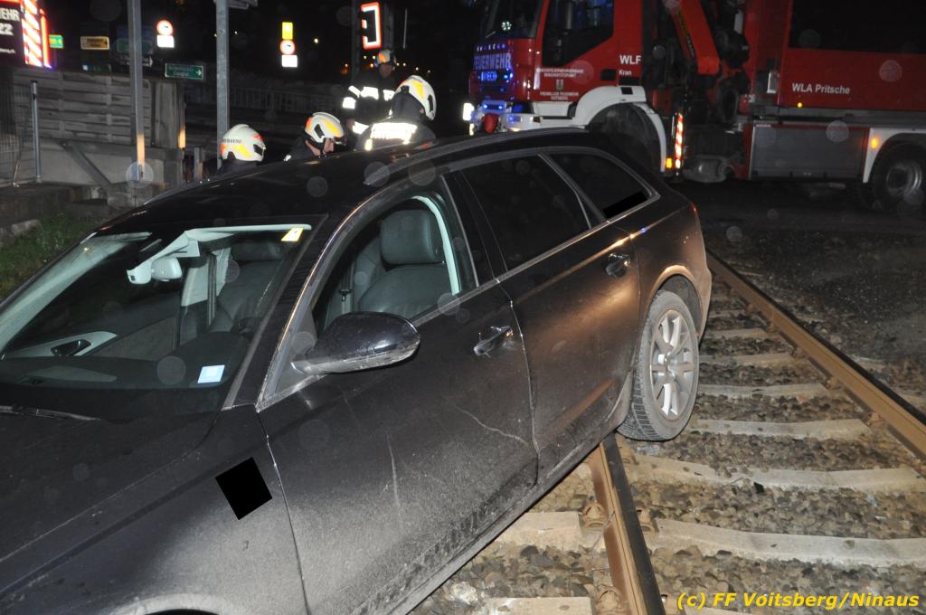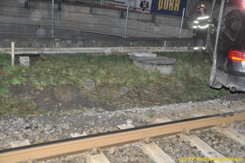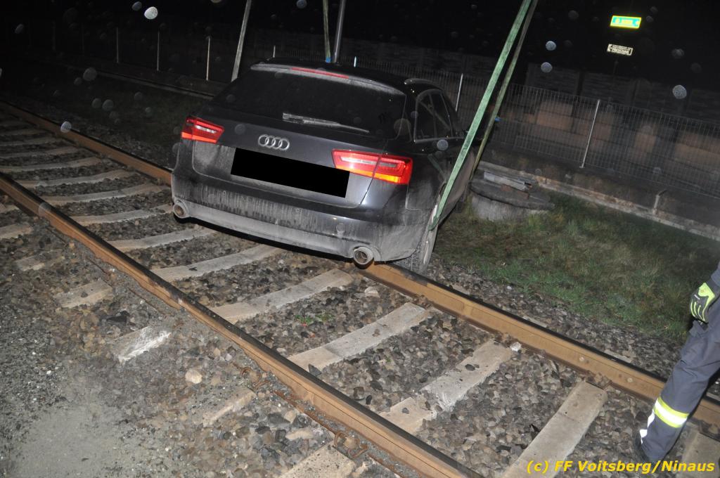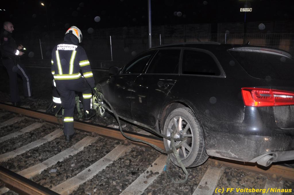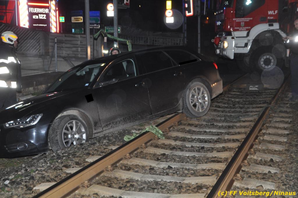VOITSBERG, am 27.11.2019 Am Mittwoch, 27. November 2019 kam um ca. 1 Uhr ein Fahrzeuglenker mit seinem Fahrzeug bei der Bahnübersetzung in der Arnsteinstrasse in Voitsberg von der Gemeindestrasse ab und landete auf dem GKB-Bahngleis, wo es zu diesem Zeitpunkt zum Glück keinen Zugsverkehr gab. Das Fahrzeug schlitterte über die Gleise und kam mit dem Heck auf diesem zu stehen. Die alarmierte FF Voitsberg barg das leicht beschädigte Fahrzeug mittels dem WLF-Kran und brachte es zu einem gesicherten Abstellplatz. Verletzt wurde niemand. Zwecks Kontrolle des Gleiskörpers wurde der zuständige Mitarbeiter der GKB verständigt, welcher nach kleineren Arbeiten keine Schäden feststellen konnte. Die polizeilichen Erhebungen führten Beamte der PI Voitsberg durch. Eingesetzt waren 6 KameradInnen der FF Voitsberg, die Polizei mit 2 Beamten und der Inspektionsdienst der GKB mit einem Mitarbeiter. Text und Fotos: FF Voitsberg/Ninaus
