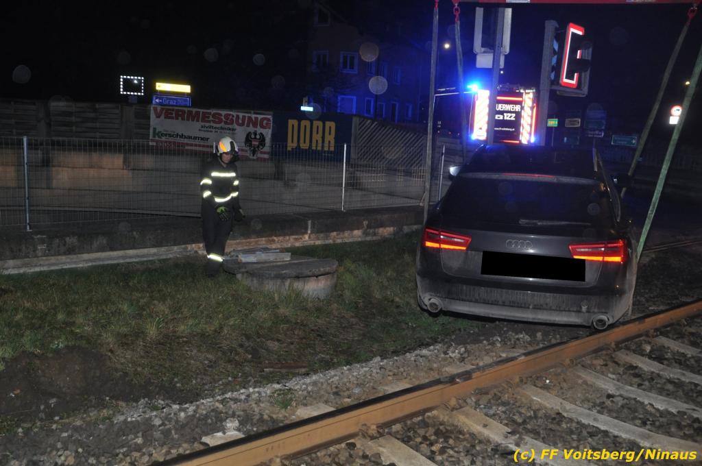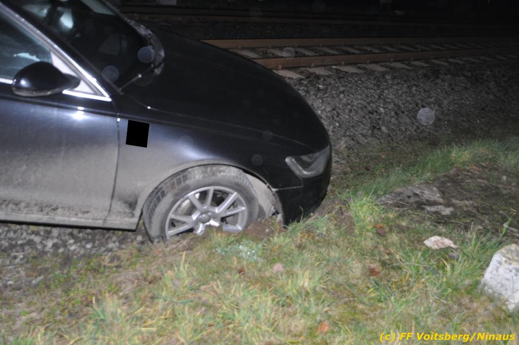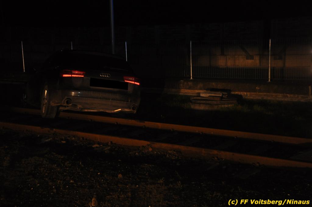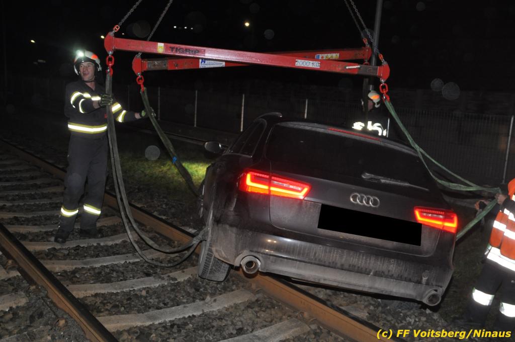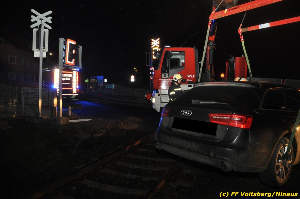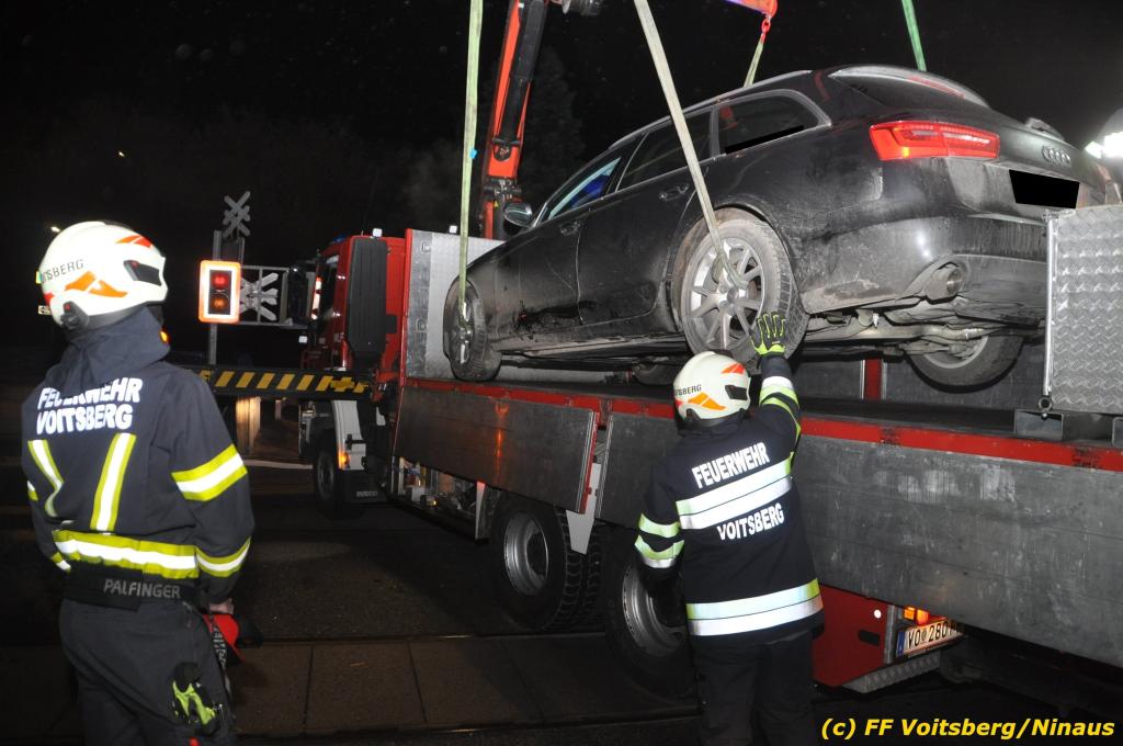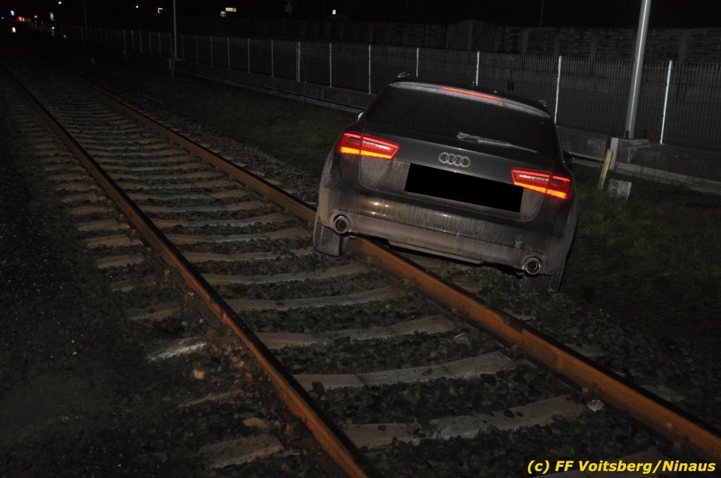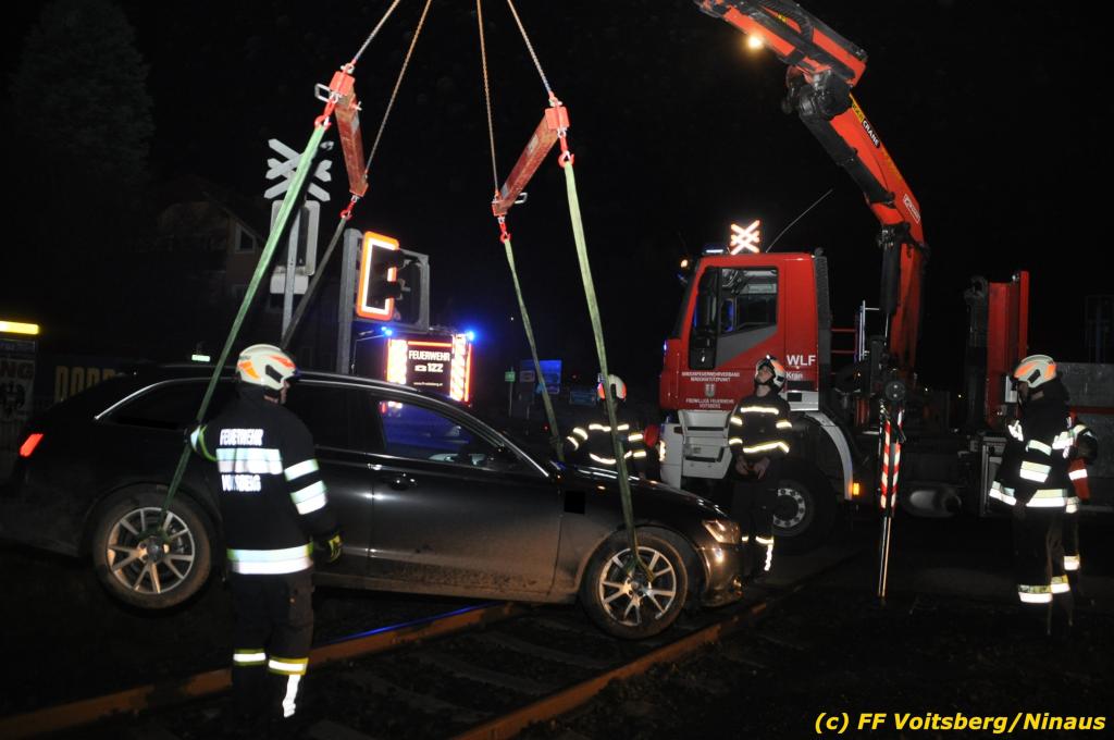 VOITSBERG, am 27.11.2019 Am Mittwoch, 27. November 2019 kam um ca. 1 Uhr ein Fahrzeuglenker mit seinem Fahrzeug bei der Bahnübersetzung in der Arnsteinstrasse in Voitsberg von der Gemeindestrasse ab und landete auf dem GKB-Bahngleis, wo es zu diesem Zeitpunkt zum Glück keinen Zugsverkehr gab. Das Fahrzeug schlitterte über die Gleise und kam mit dem Heck auf diesem zu stehen. Die alarmierte FF Voitsberg barg das leicht beschädigte Fahrzeug mittels dem WLF-Kran und brachte es zu einem gesicherten Abstellplatz. Verletzt wurde niemand. Zwecks Kontrolle des Gleiskörpers wurde der zuständige Mitarbeiter der GKB verständigt, welcher nach kleineren Arbeiten keine Schäden feststellen konnte. Die polizeilichen Erhebungen führten Beamte der PI Voitsberg durch. Eingesetzt waren 6 KameradInnen der FF Voitsberg, die Polizei mit 2 Beamten und der Inspektionsdienst der GKB mit einem Mitarbeiter. Text und Fotos: FF Voitsberg/Ninaus