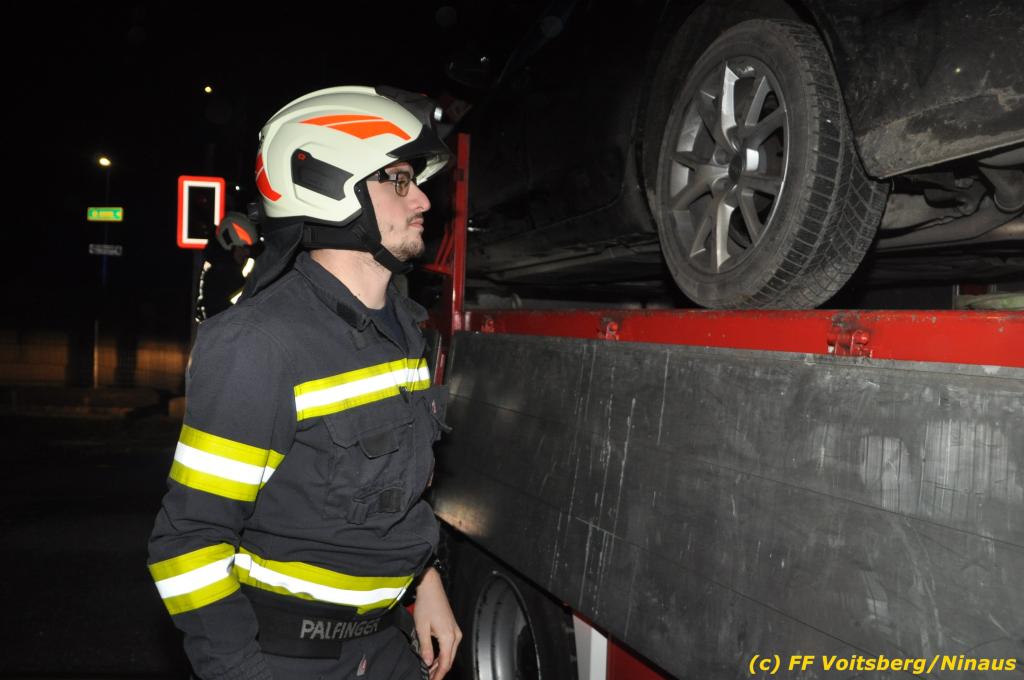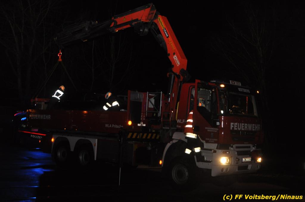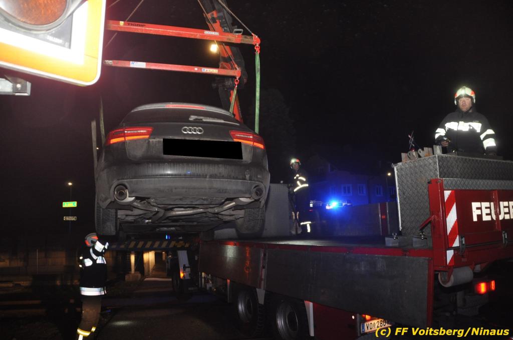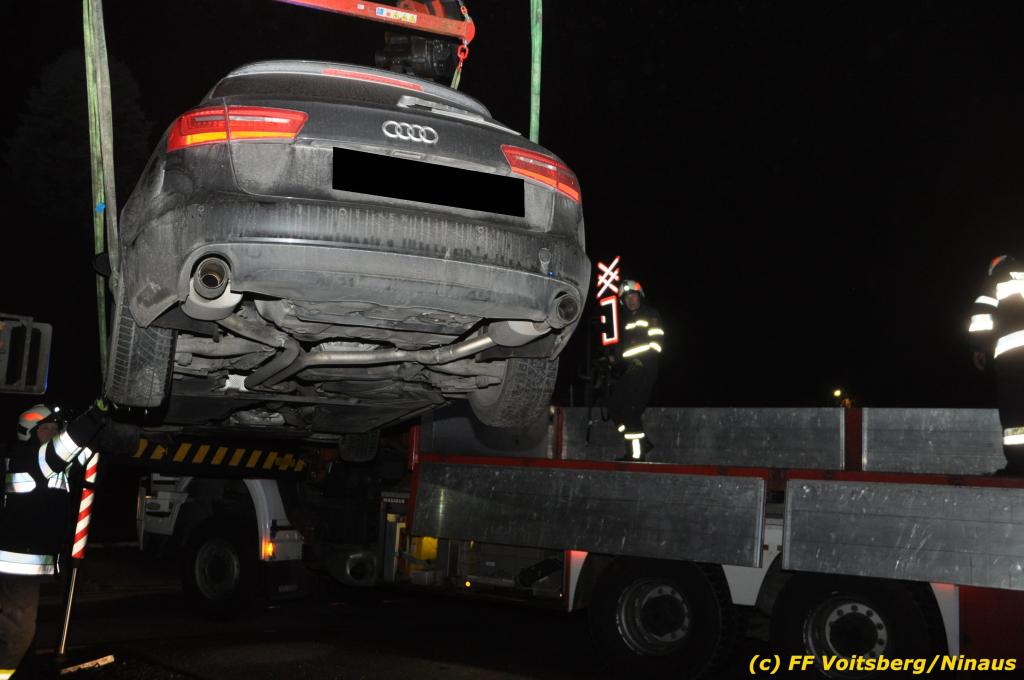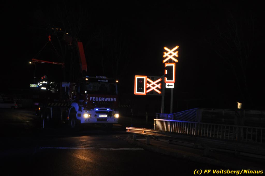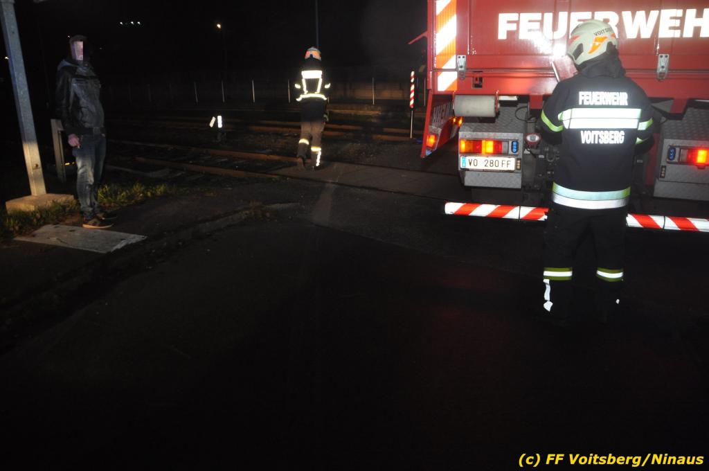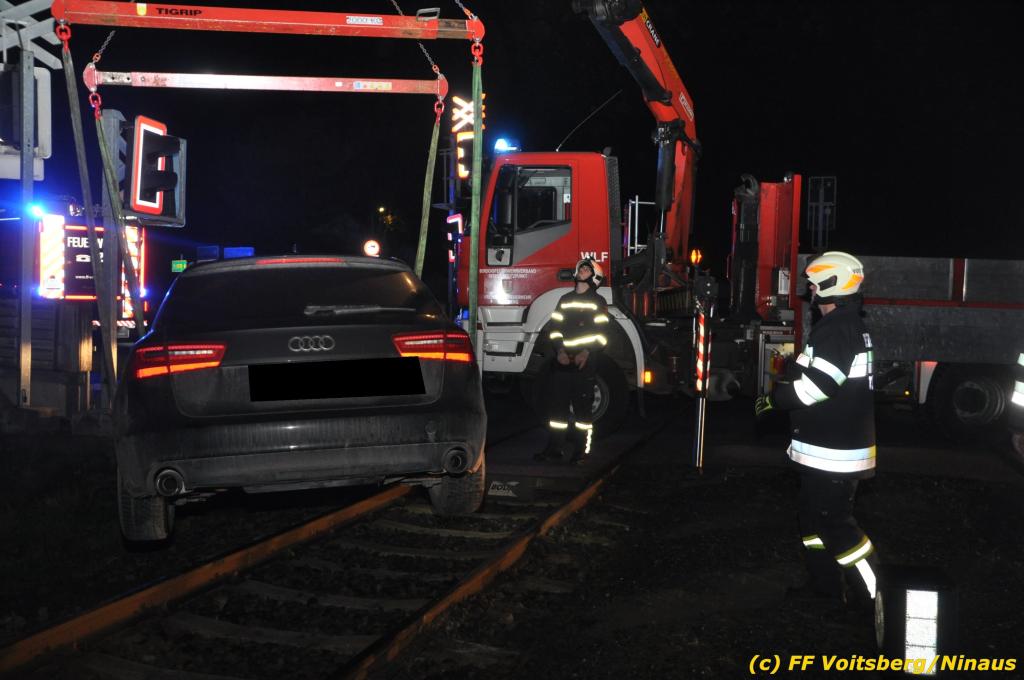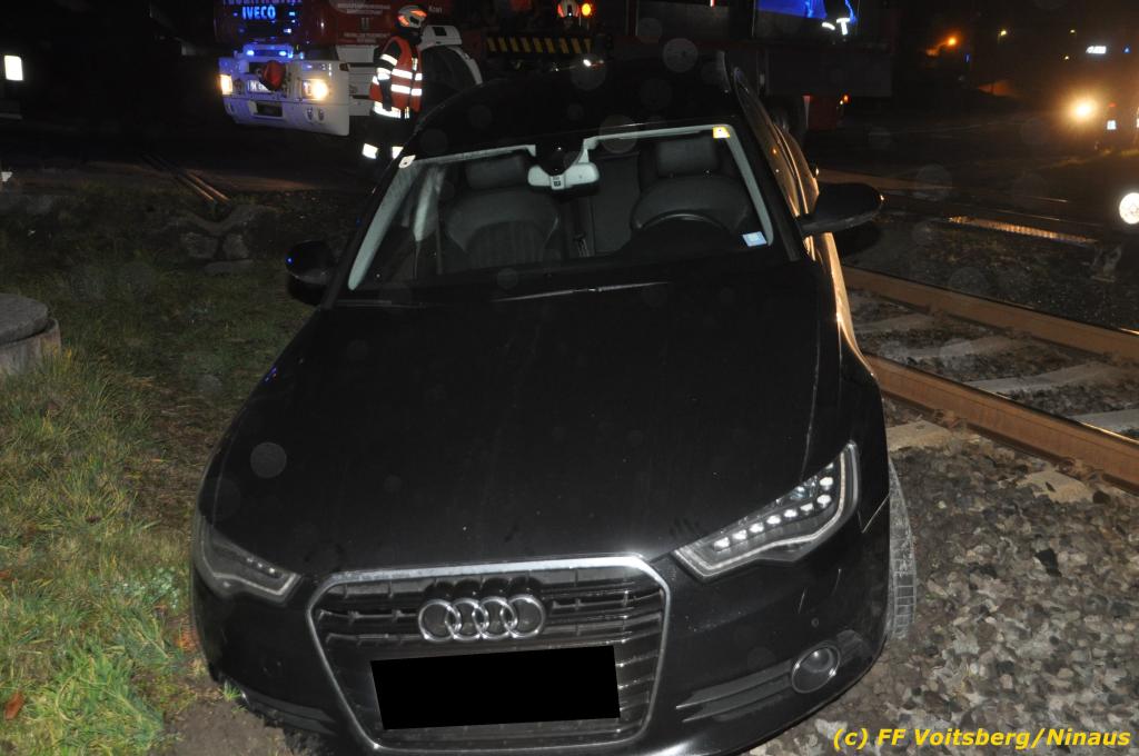 VOITSBERG, am 27.11.2019 Am Mittwoch, 27. November 2019 kam um ca. 1 Uhr ein Fahrzeuglenker mit seinem Fahrzeug bei der Bahnübersetzung in der Arnsteinstrasse in Voitsberg von der Gemeindestrasse ab und landete auf dem GKB-Bahngleis, wo es zu diesem Zeitpunkt zum Glück keinen Zugsverkehr gab. Das Fahrzeug schlitterte über die Gleise und kam mit dem Heck auf diesem zu stehen. Die alarmierte FF Voitsberg barg das leicht beschädigte Fahrzeug mittels dem WLF-Kran und brachte es zu einem gesicherten Abstellplatz. Verletzt wurde niemand. Zwecks Kontrolle des Gleiskörpers wurde der zuständige Mitarbeiter der GKB verständigt, welcher nach kleineren Arbeiten keine Schäden feststellen konnte. Die polizeilichen Erhebungen führten Beamte der PI Voitsberg durch. Eingesetzt waren 6 KameradInnen der FF Voitsberg, die Polizei mit 2 Beamten und der Inspektionsdienst der GKB mit einem Mitarbeiter. Text und Fotos: FF Voitsberg/Ninaus