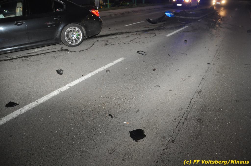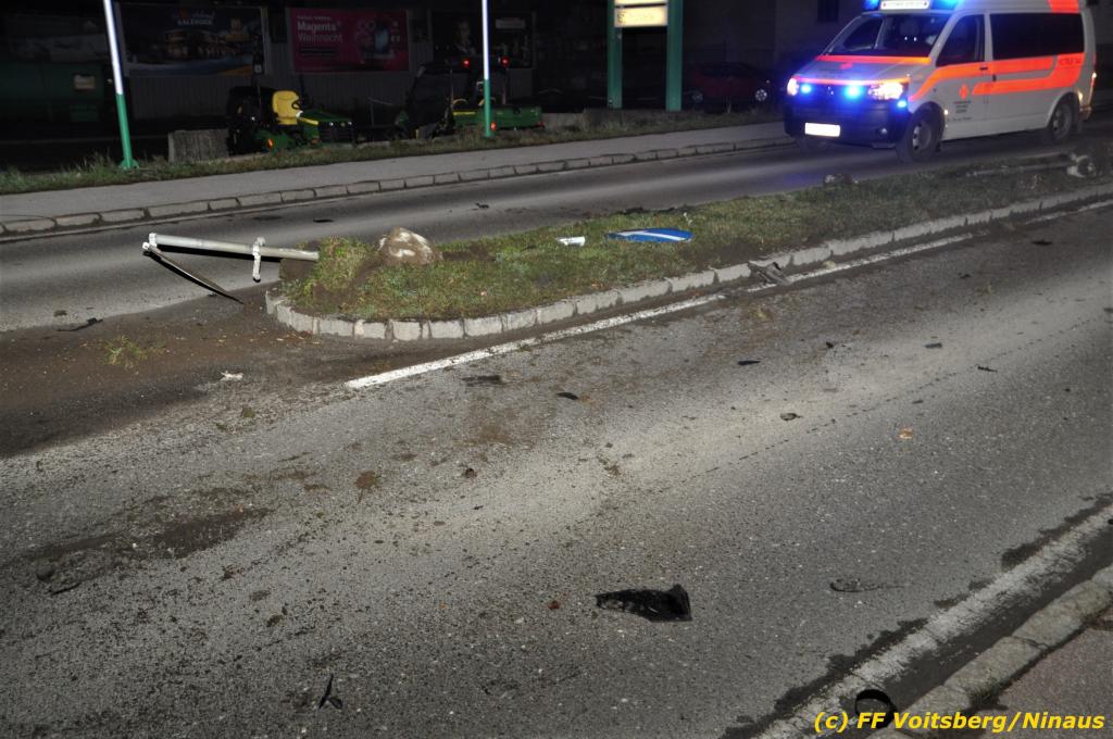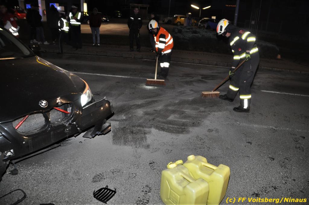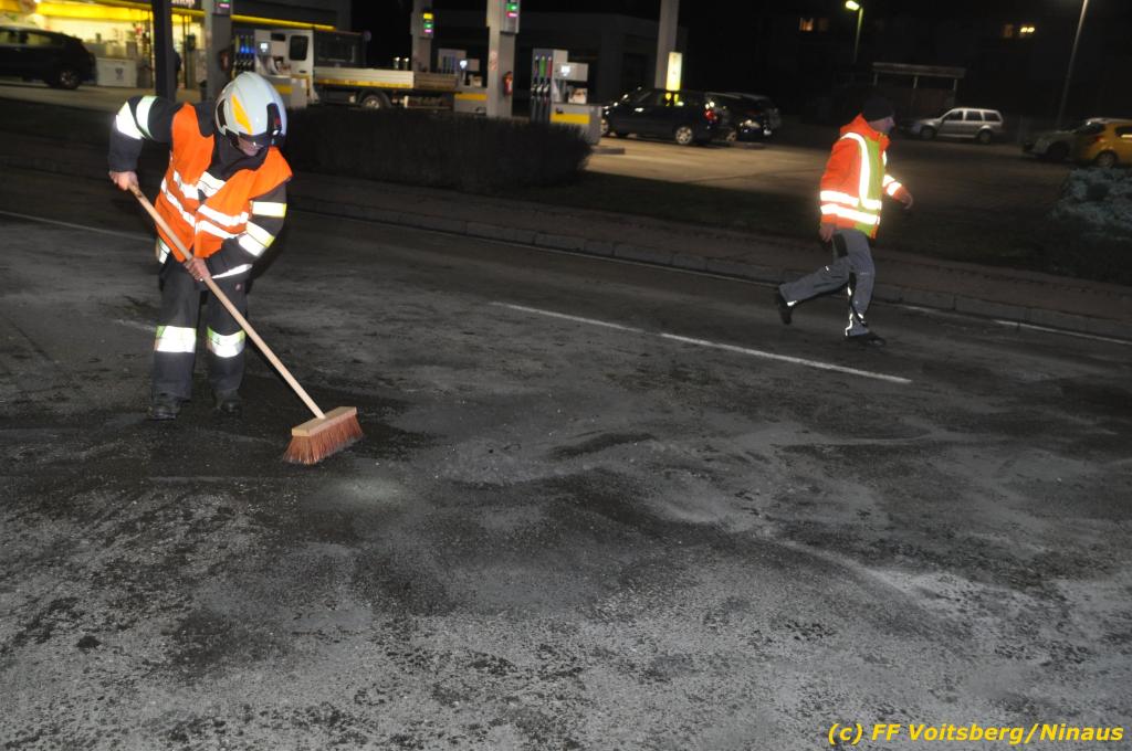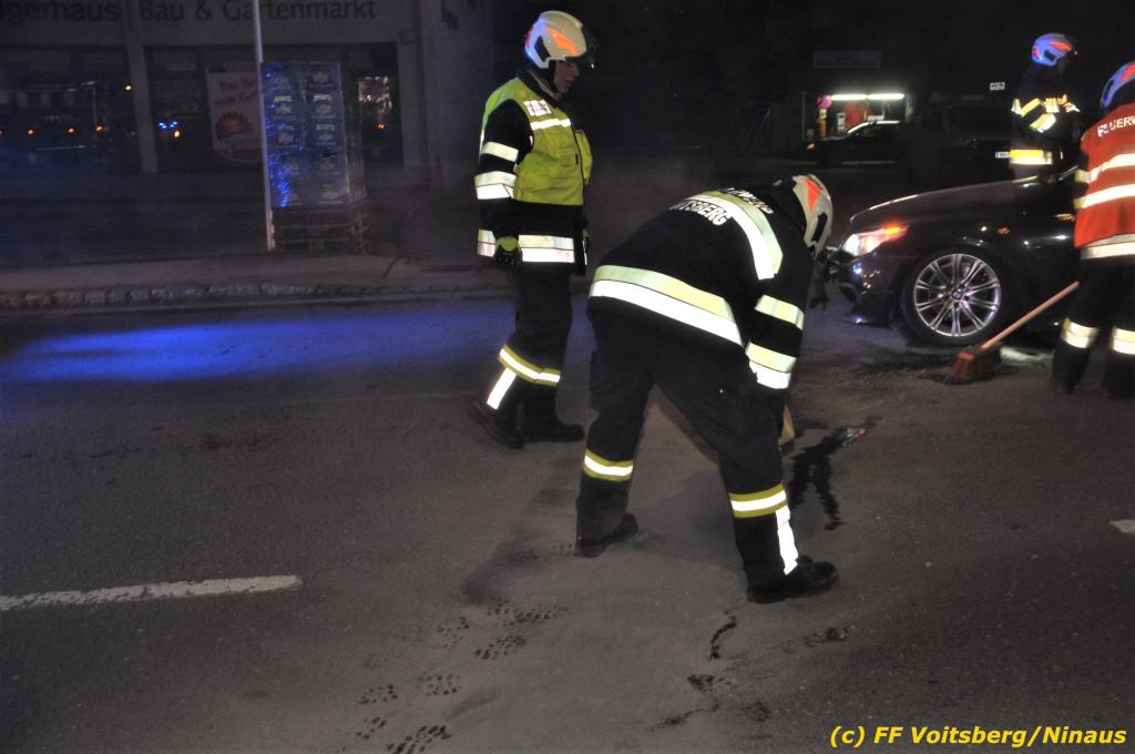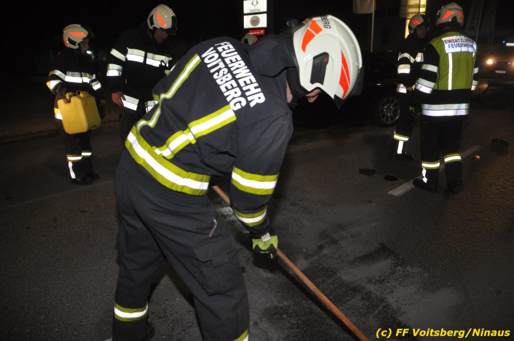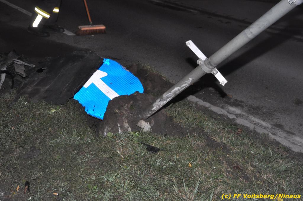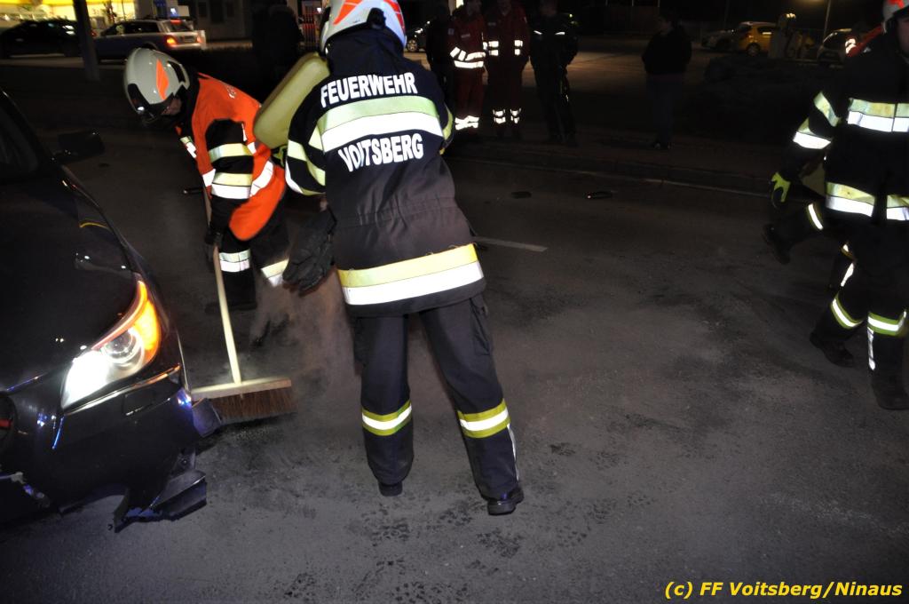VOITSBERG, am 29.11.2019 Die FF Voitsberg wurde am Freitag, 29. November 2019 um 21:50 Uhr zu einem Verkehrsunfall in die Grazer Vorstadt in Voitsberg über die LLZ Steiermark alarmiert. Ein Pkw geriet auf eine Verkehrsinsel, beschädigte zwei Verkehrszeichen und kam nach ca. 40 m auf der Gemeindestraße zu stehen. Dabei gelangten Betriebsmittel auf die Fahrbahn und verunreinigten sie. Mit Bindemittel wurden diese gebunden und fachgerecht entsorgt. Herumliegende Wrackteile wurde eingesammelt und vom städtischen Bauhof abtransportiert. Das beschädigte Fahrzeug wurde mit vier Abschlepprollern von der Straße geschoben und abgestellt, sowie die Batterie abgeklemmt. Verletzt wurde niemand.