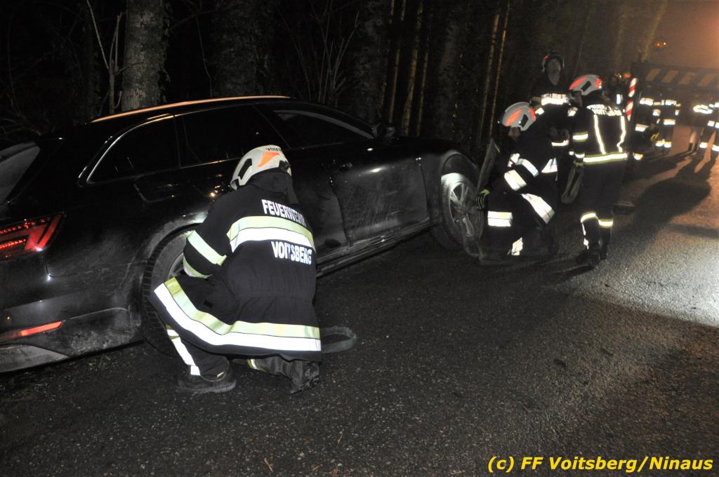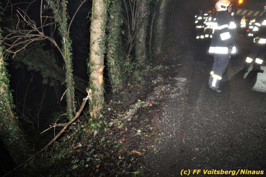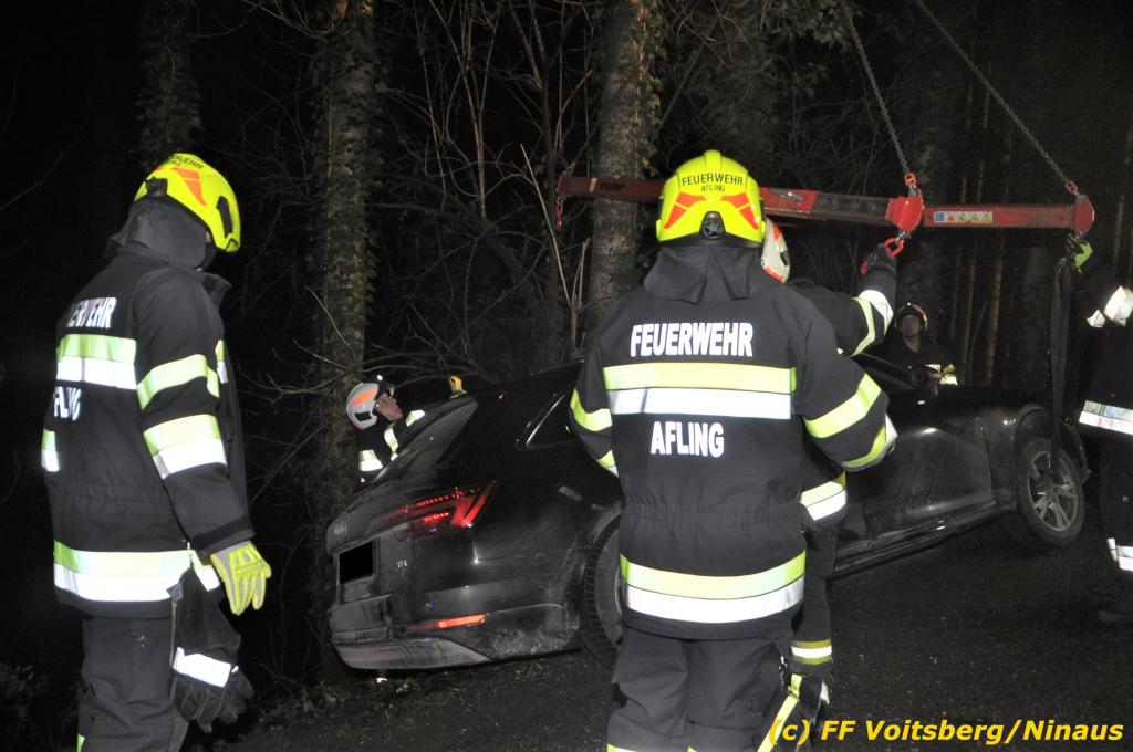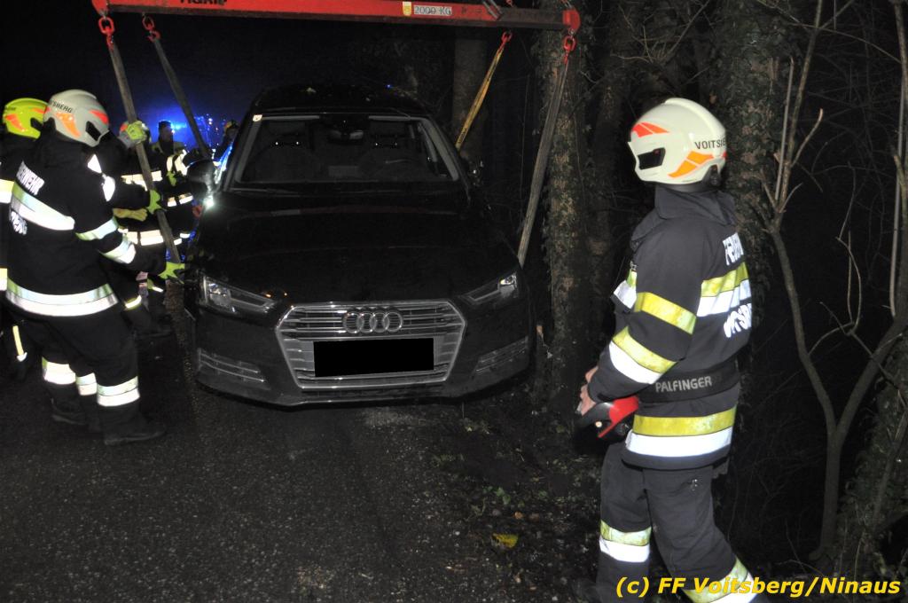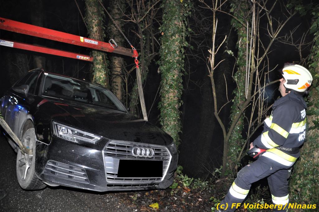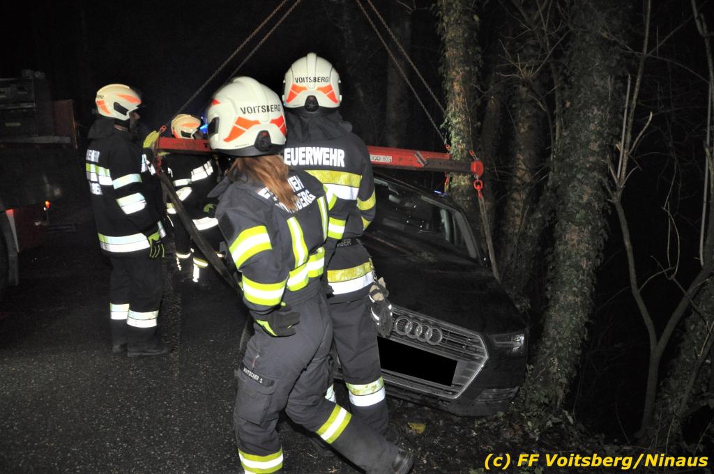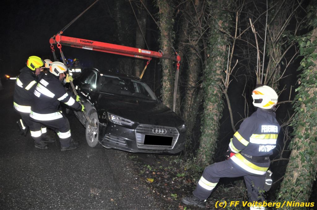 VOITSBERG, am 02.12.2019 In den Abendstunden des Montag, 2. Dezember 2019 kam ein Pkw auf der Lucknerstrasse in Bärnbach bergaufwärts fahrend links von Straße ab und blieb an einem Baum hängen. Die alarmierten Feuerwehren Bärnbach und Afling sicherten die Unfallstelle ab und alarmierten zwecks Bergung das WLF-Kran der FF Voitsberg, mit welchem der leicht beschädigte Pkw geborgen wurde ehe dieser dann die Fahrt auf eigener Achse fortsetzen konnte. Verletzt wurde niemand. .