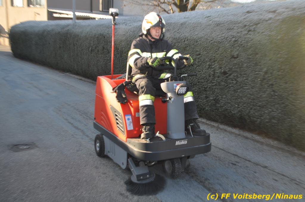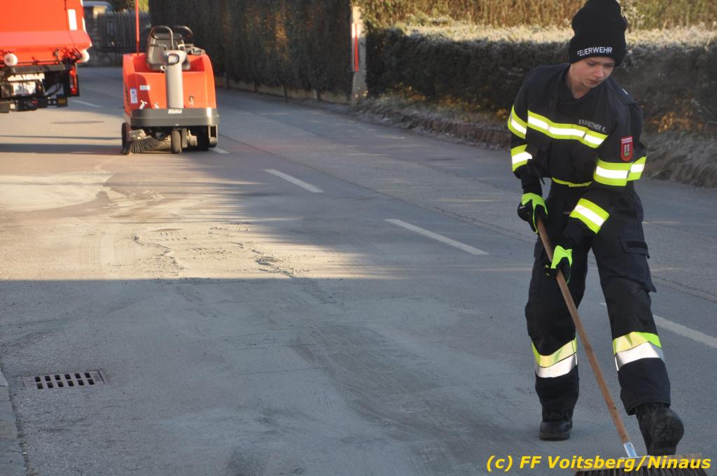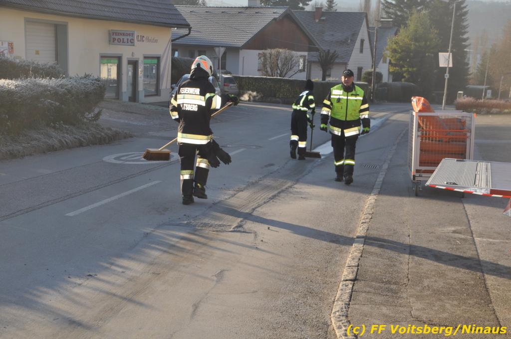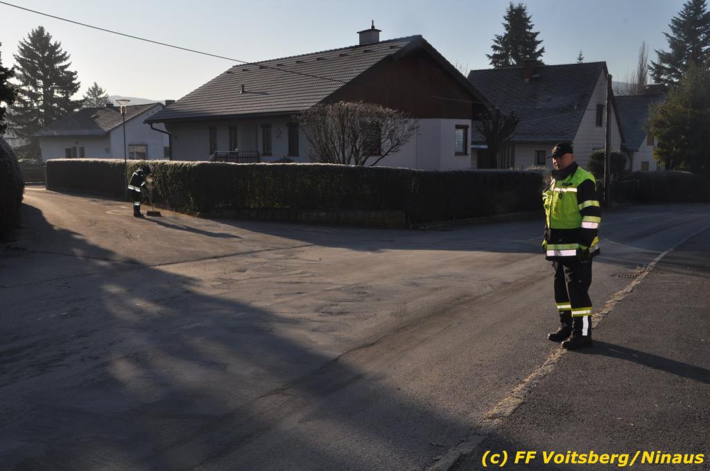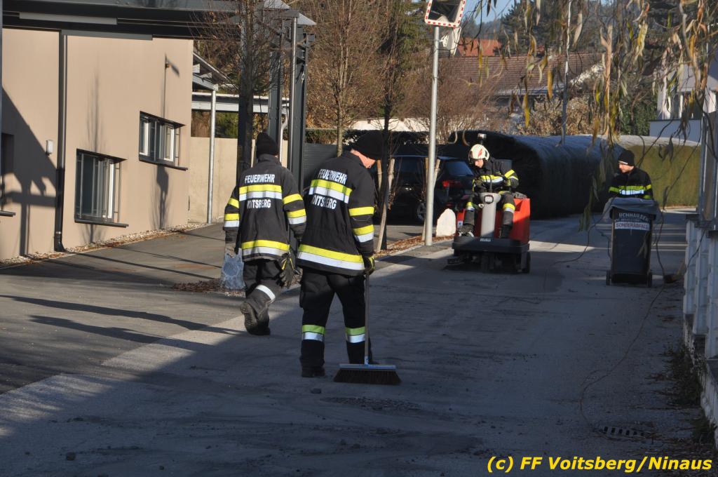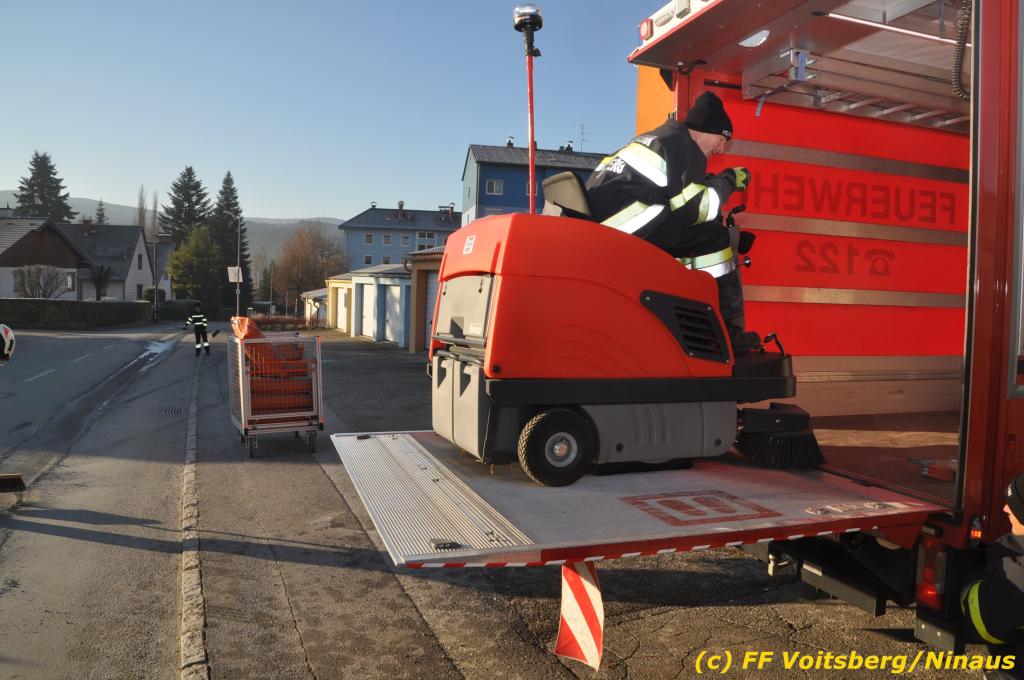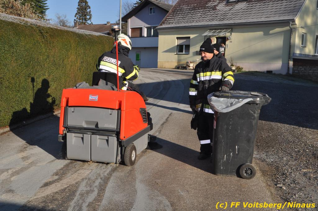 VOITSBERG, am 04.12.2019 Von einem Firmentransporter einer Baufirma gelangte am Mittwoch, 4. Dezember 2019 kurz nach 8 Uhr Dieseltreibstoff auf die Lacknergasse, Perschlerstrasse und Mozartgasse in Voitsberg. Ein mitgeführter Treibstoffkanister kippte auf der Ladefläche um und der auslaufende Diesel verunreinigte die Gemeindestrassen auf mehreren hundert Meter. Die alarmierte FF Voitsberg band die Betriebsmittel mittels Bindemittel und sammelte dieses mit einer feuerwehreigenen Kehrmaschine ein und entsorgte dieses. Unterstützt wurde die Feuerwehr von Mitarbeitern der Baufirma.