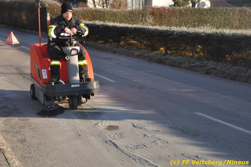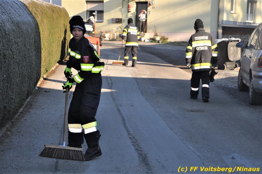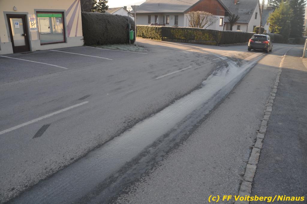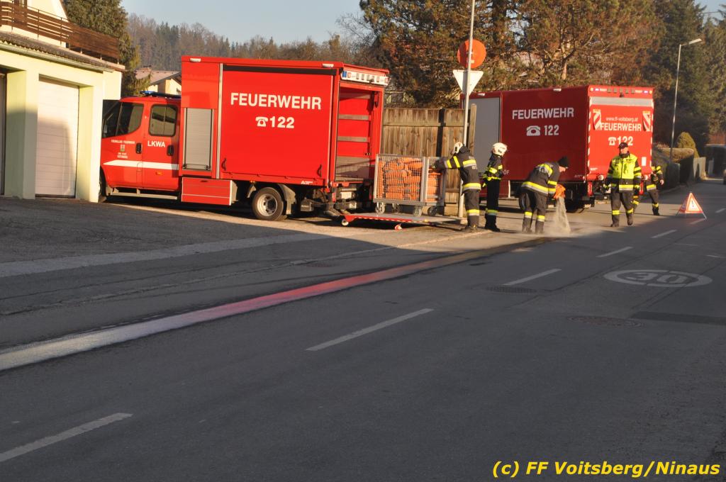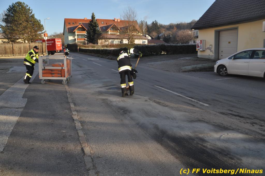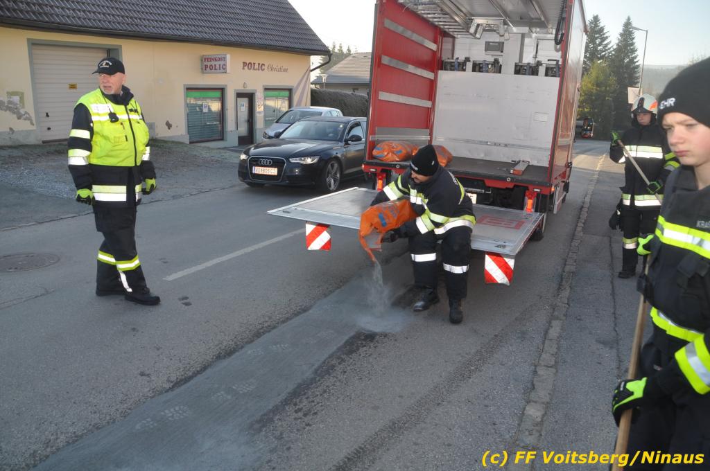 VOITSBERG, am 04.12.2019 Von einem Firmentransporter einer Baufirma gelangte am Mittwoch, 4. Dezember 2019 kurz nach 8 Uhr Dieseltreibstoff auf die Lacknergasse, Perschlerstrasse und Mozartgasse in Voitsberg. Ein mitgeführter Treibstoffkanister kippte auf der Ladefläche um und der auslaufende Diesel verunreinigte die Gemeindestrassen auf mehreren hundert Meter. Die alarmierte FF Voitsberg band die Betriebsmittel mittels Bindemittel und sammelte dieses mit einer feuerwehreigenen Kehrmaschine ein und entsorgte dieses. Unterstützt wurde die Feuerwehr von Mitarbeitern der Baufirma.