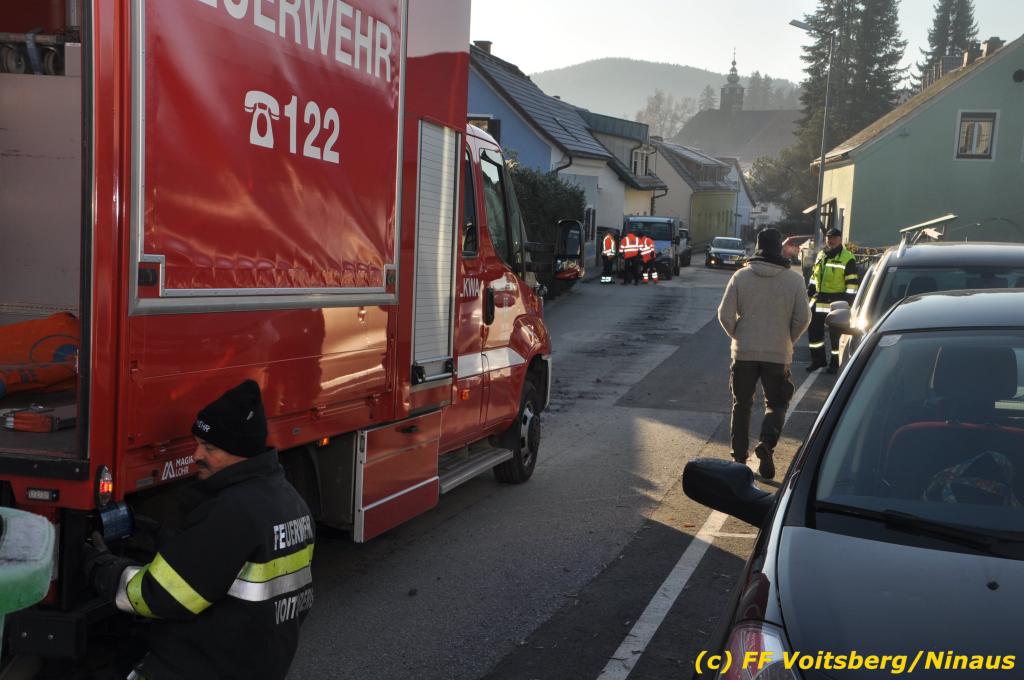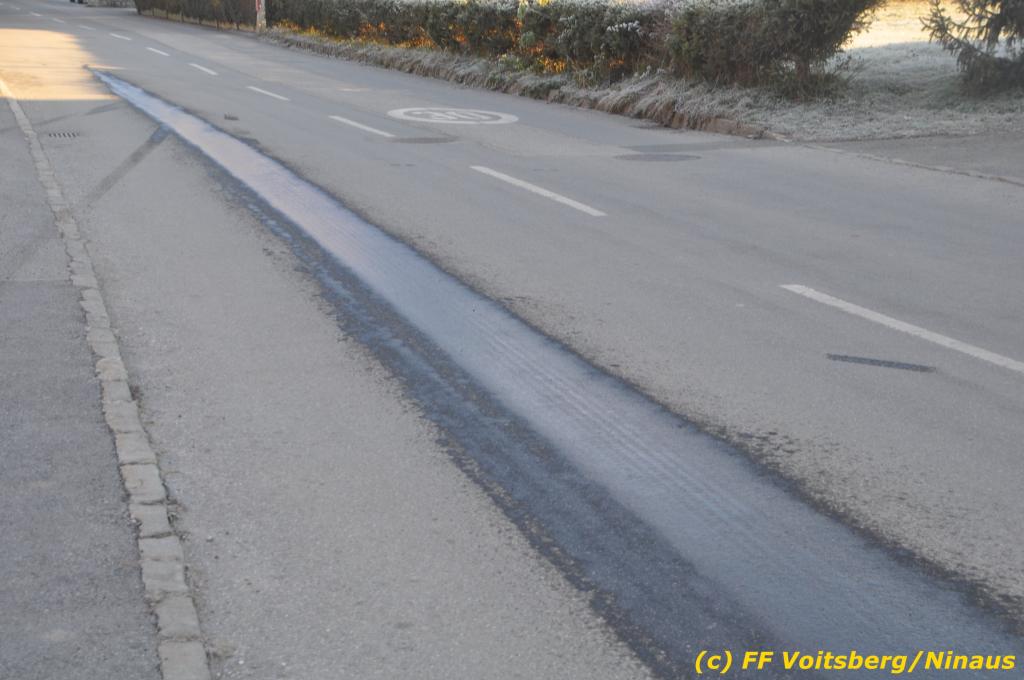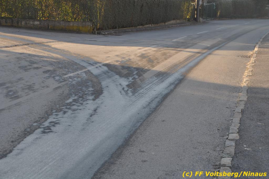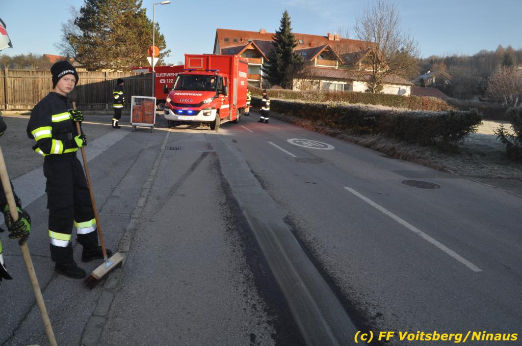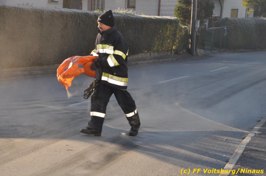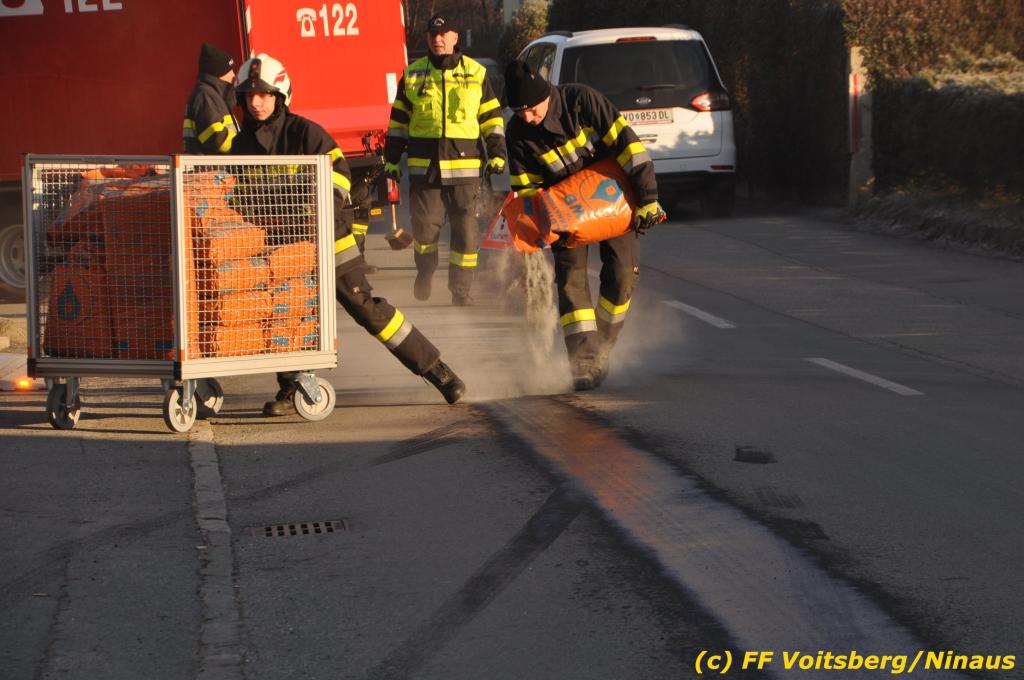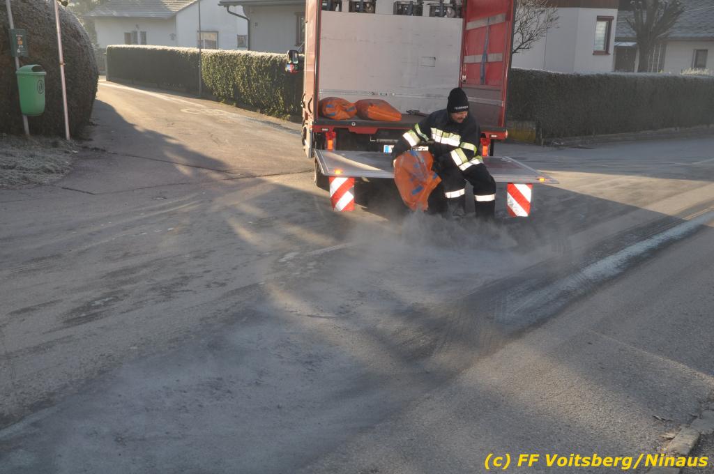 VOITSBERG, am 04.12.2019 Von einem Firmentransporter einer Baufirma gelangte am Mittwoch, 4. Dezember 2019 kurz nach 8 Uhr Dieseltreibstoff auf die Lacknergasse, Perschlerstrasse und Mozartgasse in Voitsberg. Ein mitgeführter Treibstoffkanister kippte auf der Ladefläche um und der auslaufende Diesel verunreinigte die Gemeindestrassen auf mehreren hundert Meter. Die alarmierte FF Voitsberg band die Betriebsmittel mittels Bindemittel und sammelte dieses mit einer feuerwehreigenen Kehrmaschine ein und entsorgte dieses. Unterstützt wurde die Feuerwehr von Mitarbeitern der Baufirma.