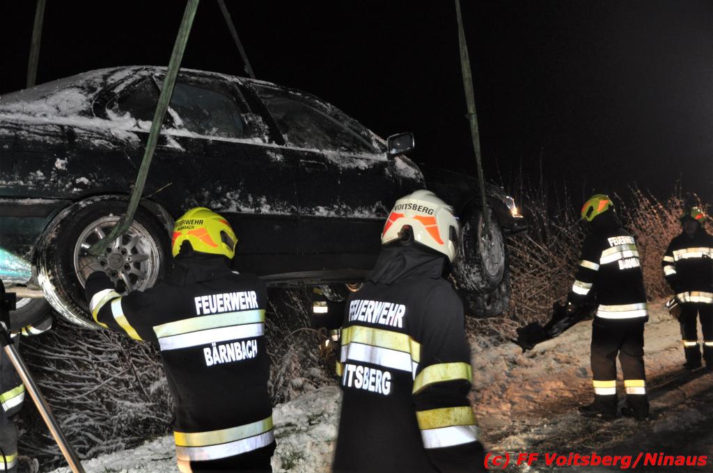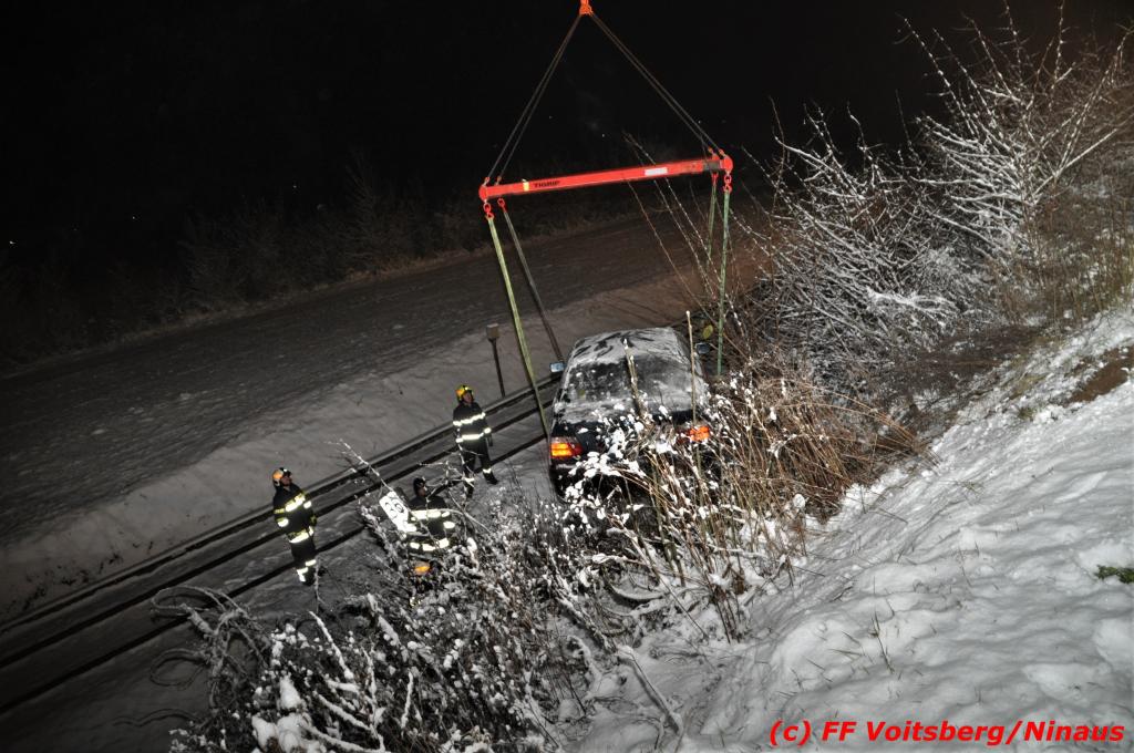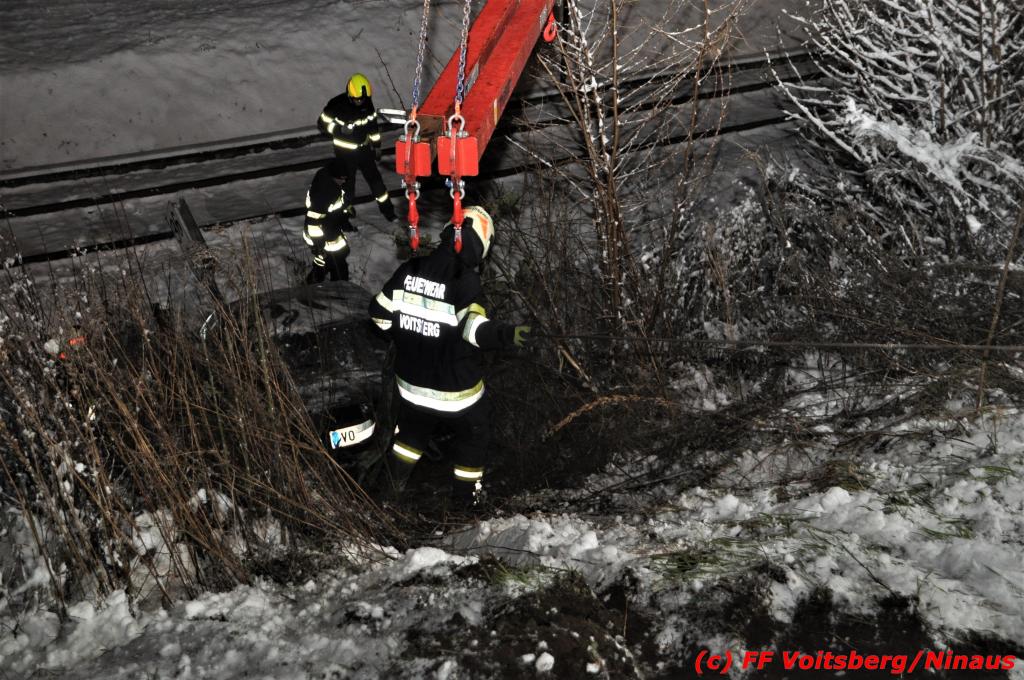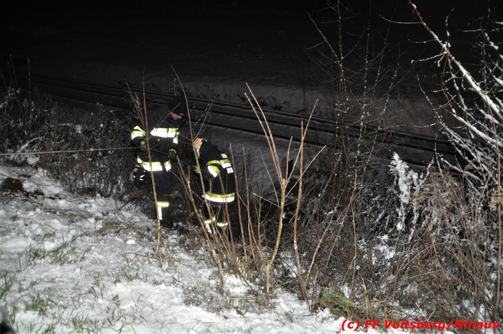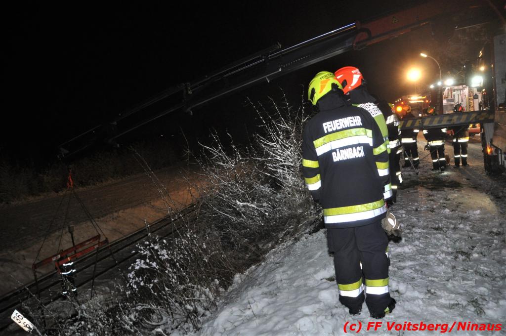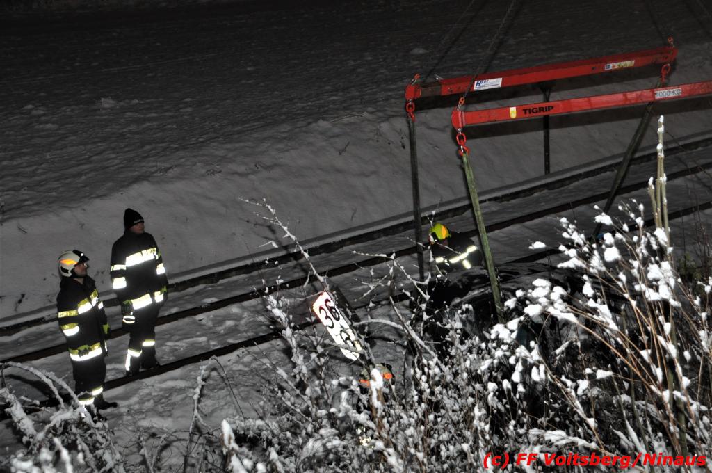 VOITSBERG, am 14.12.2019 Ein Pkw geriet am Samstag, 14. Dezember 2019 nach 1 Uhr auf der schneeglatten Fahrbahn der Marienschachtstraße in Bärnbach ab, fuhr über eine ca. 10 m hohe Böschung und kam kurz vor den Gleisen der GKB-Eisenbahn zu stehen. Dabei hatte der Lenker Glück, dass sich das Fahrzeug nicht überschlug und er unverletzt blieb. Zwecks Bergung wurde die zuständige FF Bärnbach seitens der LLZ Steiermark alarmiert, welche als Unterstützung nach Erkundung des Einsatzleiters das WLF-Kran der FF Voitsberg nachalarmieren ließ. Das leicht beschädigte Fahrzeug wurde geborgen und der Lenker konnte seine Fahrt auf eigener Achse fortsetzen.