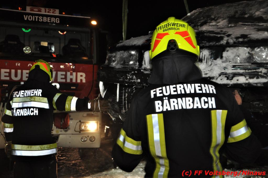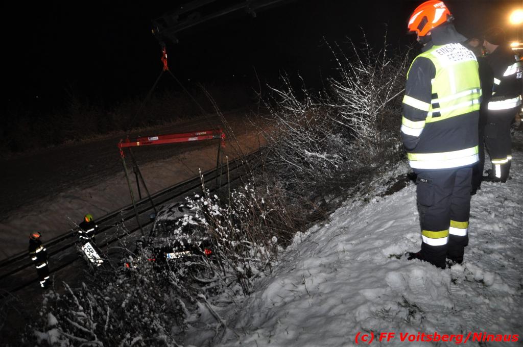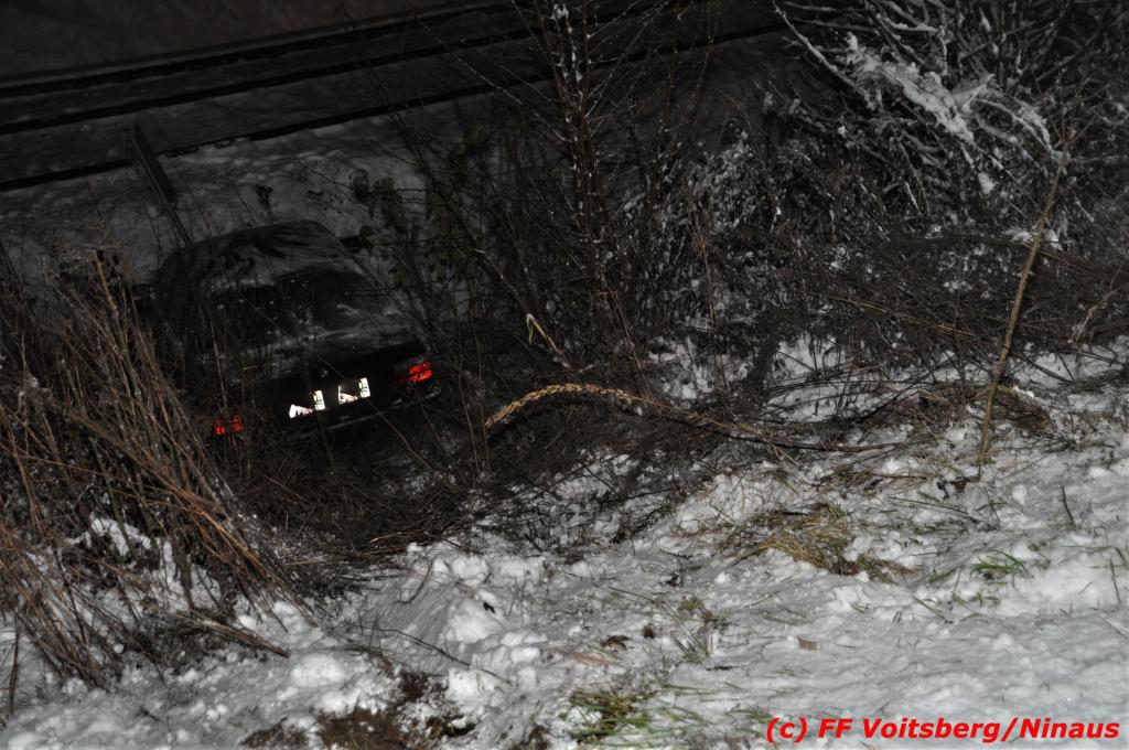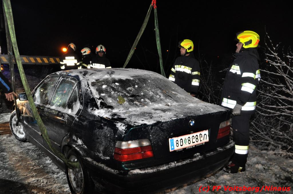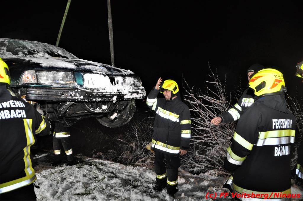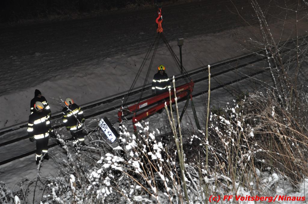 VOITSBERG, am 14.12.2019 Ein Pkw geriet am Samstag, 14. Dezember 2019 nach 1 Uhr auf der schneeglatten Fahrbahn der Marienschachtstraße in Bärnbach ab, fuhr über eine ca. 10 m hohe Böschung und kam kurz vor den Gleisen der GKB-Eisenbahn zu stehen. Dabei hatte der Lenker Glück, dass sich das Fahrzeug nicht überschlug und er unverletzt blieb. Zwecks Bergung wurde die zuständige FF Bärnbach seitens der LLZ Steiermark alarmiert, welche als Unterstützung nach Erkundung des Einsatzleiters das WLF-Kran der FF Voitsberg nachalarmieren ließ. Das leicht beschädigte Fahrzeug wurde geborgen und der Lenker konnte seine Fahrt auf eigener Achse fortsetzen.