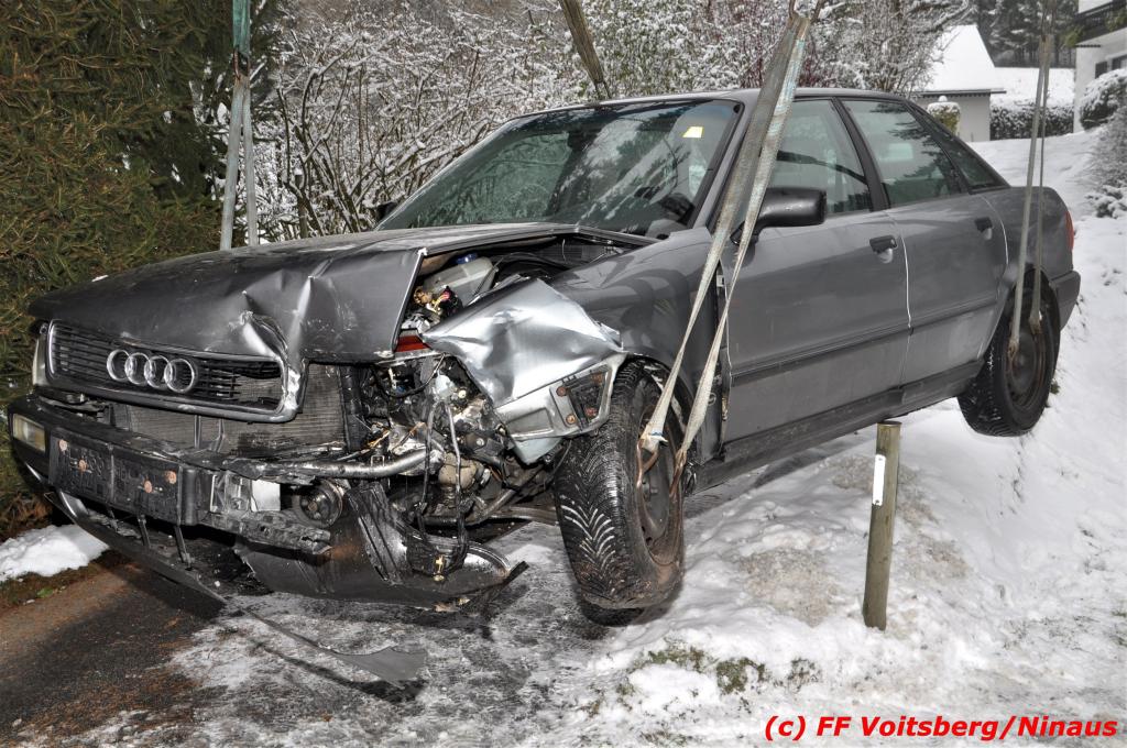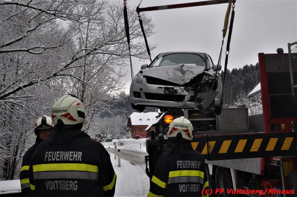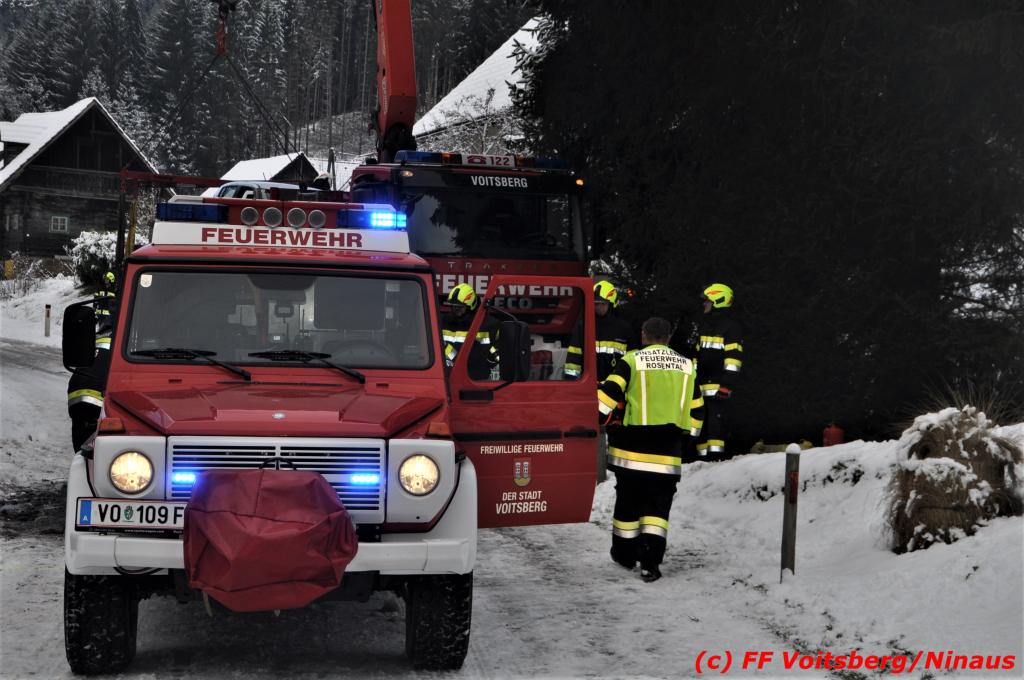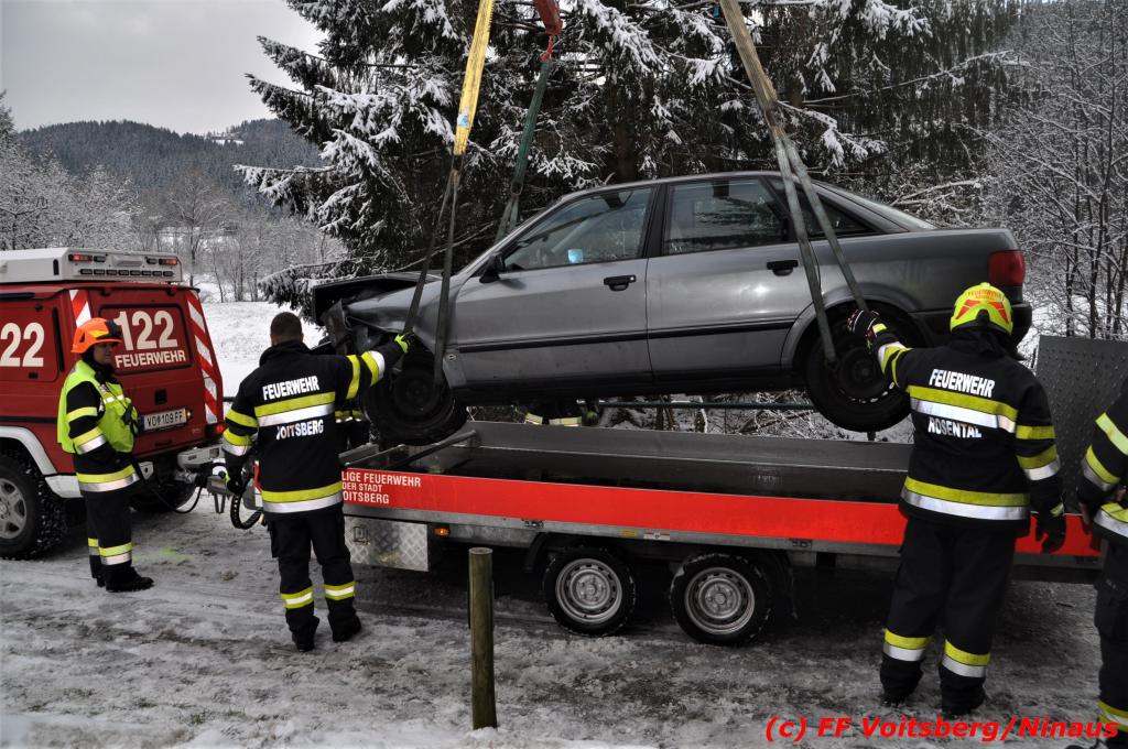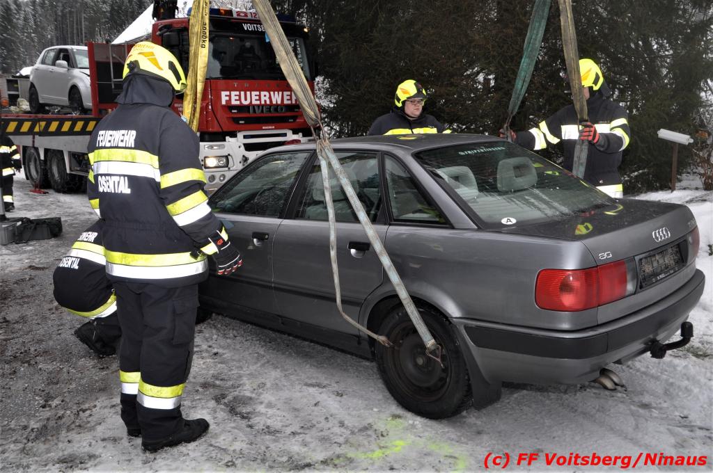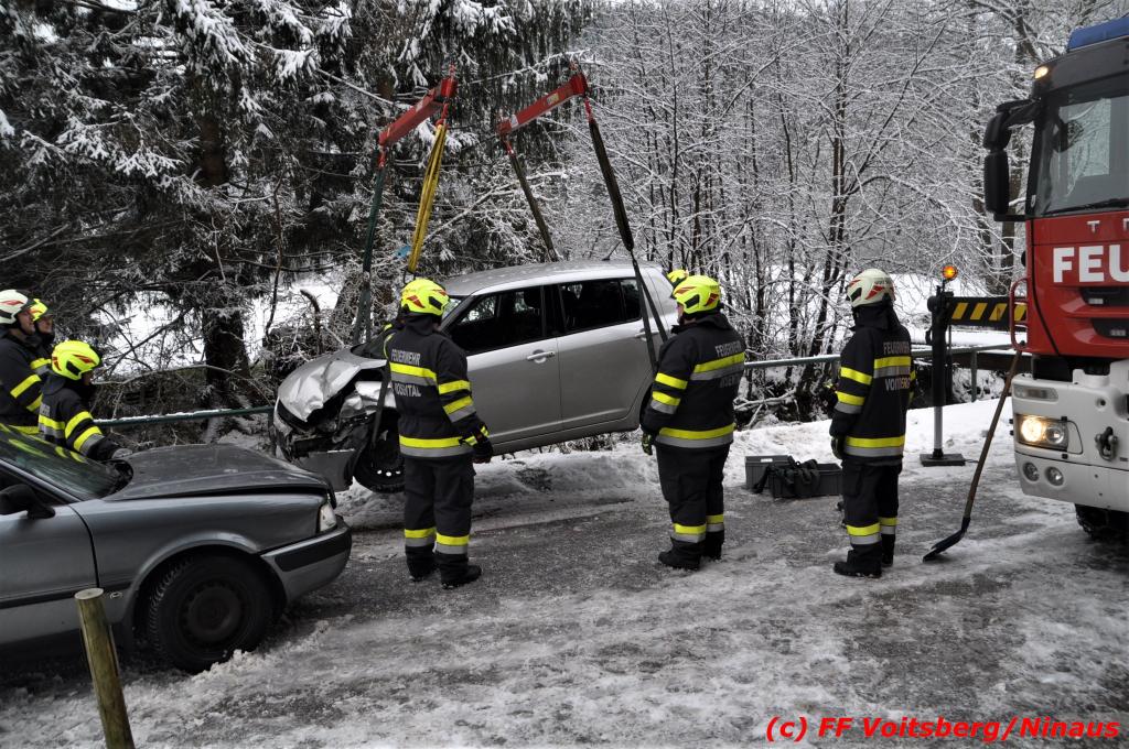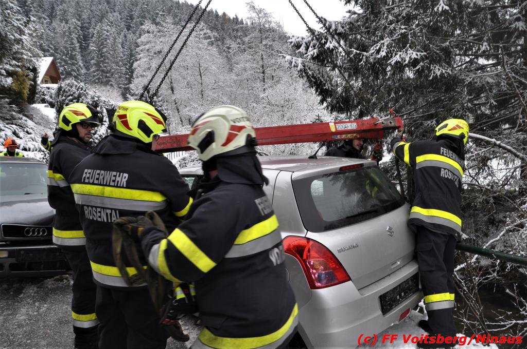 VOITSBERG, am 14.12.2019 Am Samstag, 14. Oktober 2019 in den Vormittagsstunden kam es aus unbekannter Ursache auf der schneeglatten Gößnitztalstraße im Gemeindegebiet Rosental zu einem Zusammenstoß zweier Pkw. Beide Fahrzeuge wurden schwer beschädigt und blockierten die Straße. Drei in den Fahrzeugen befindliche Personen wurden mit Verletzungen unbestimmten Grades in das LKH Voitsberg eingeliefert. Zwecks Bergung und Binden auslaufender Betriebsmittel wurde die FF Rosental seitens der LLZ alarmiert, welche nach Erkundung durch den Einsatzleiter zwecks Bergung beider Fahrzeuge das WLF-Kran der FF Voitsberg nachalarmieren ließ. Die FF Rosental sicherte die Unfallstelle ab, baute einen Brandschutz auf, regelte den Verkehr und band ausgelaufene Betriebsmittel. Beide Fahrzeuge wurden mit dem WLF-Kran und dem Mehrzweckanhänger der FF Voitsberg zu einem gesicherten Platz überstellt. .