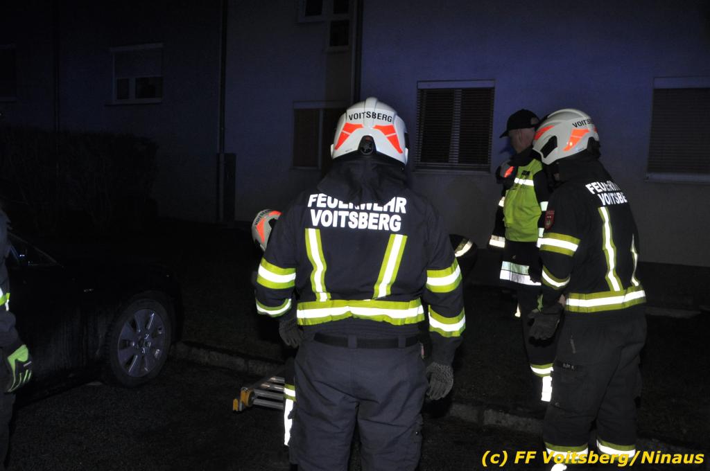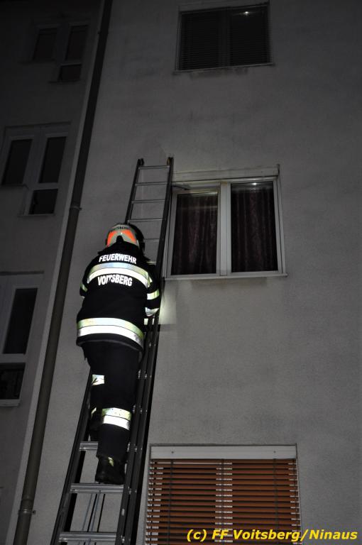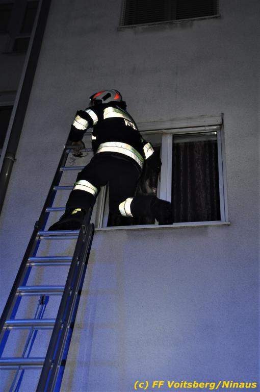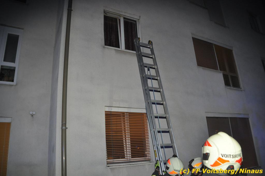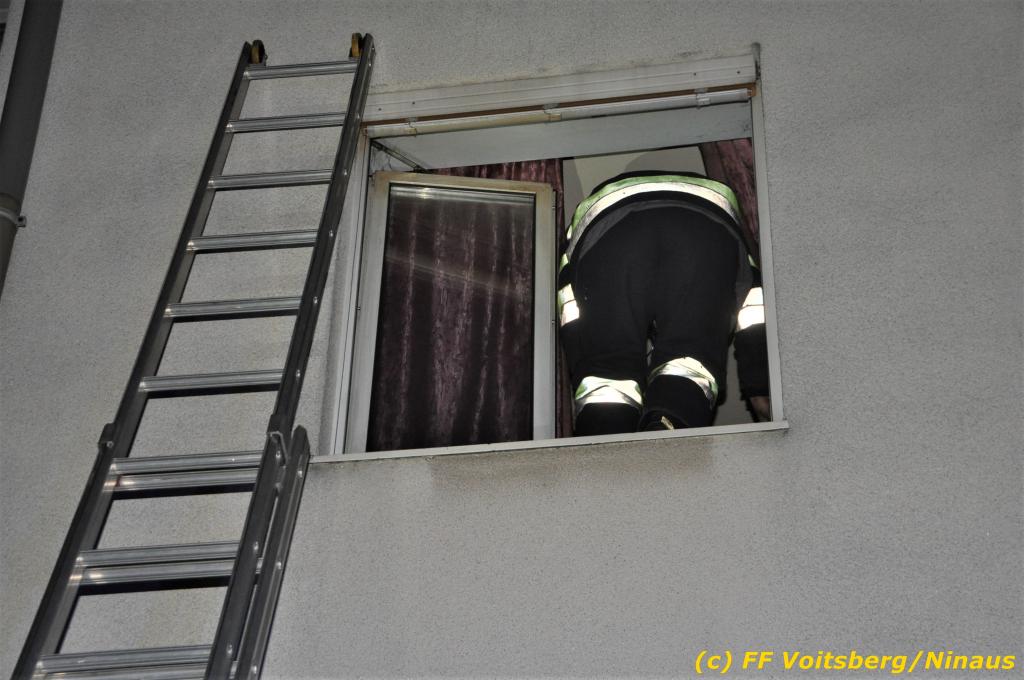 Daraufhin verständigte die Polizei die FF Voitsberg zwecks Türöffnung oder Fenstereinstieg und das Rote Kreuz Voitsberg-Köflach zwecks möglichem Sanitätseinsatz an. Bei Erkundung der Einsatzstelle durch den Einsatzleiter wurde ein gekipptes Fenster gesichtet, woraufhin ein Feuerwehrkamerad über den Leiterweg zuerst das Fenster öffnete und daraufhin in die Wohnung im 1. Stock einstieg und keine Person anfand.