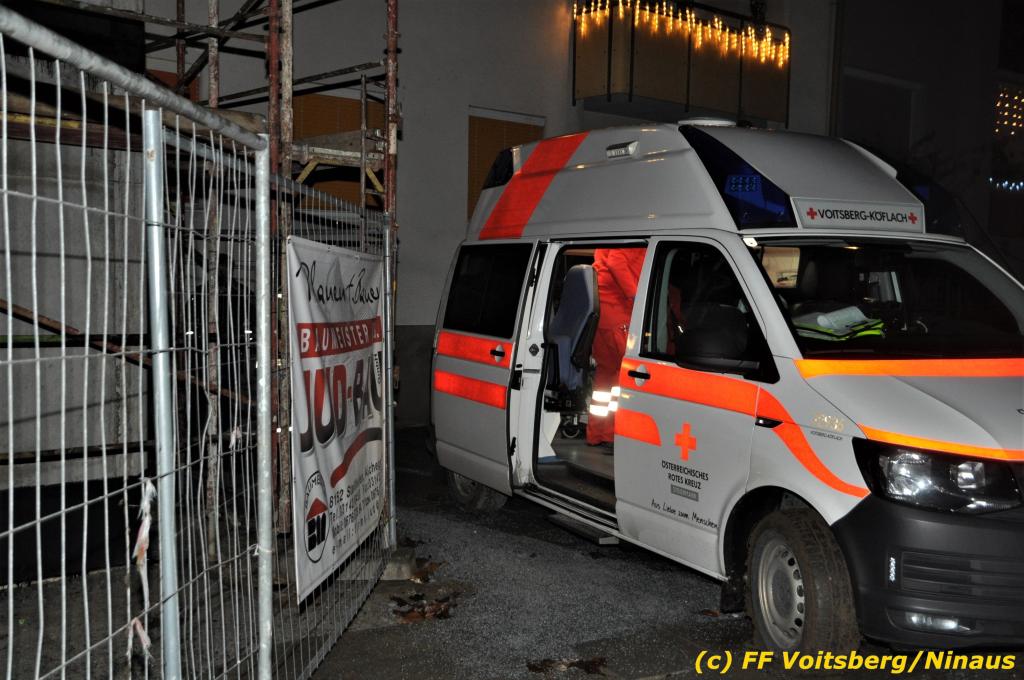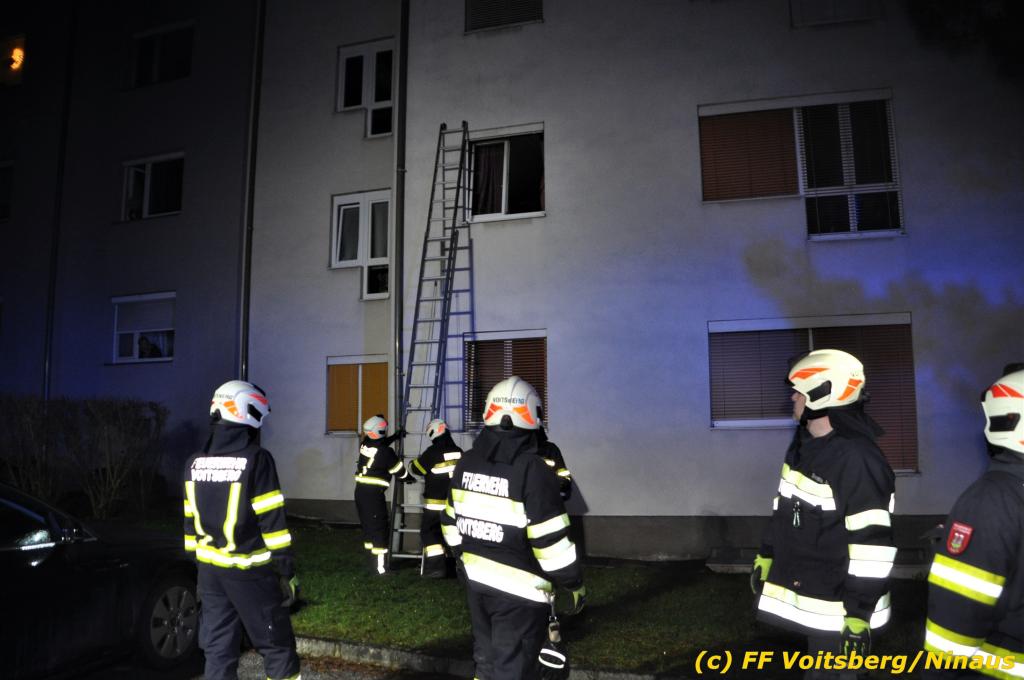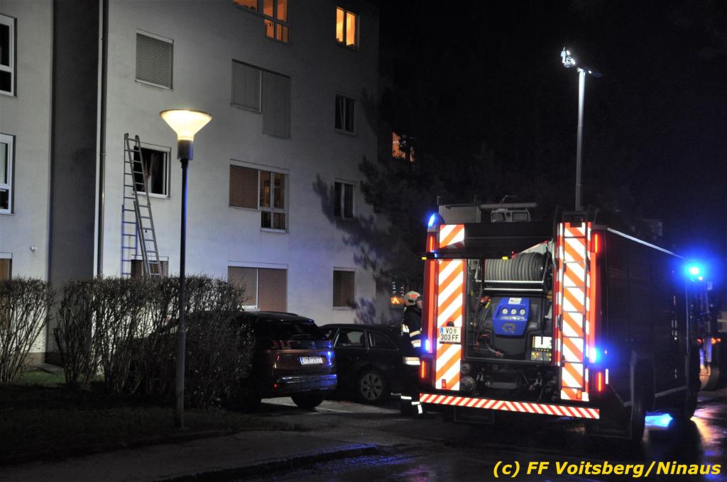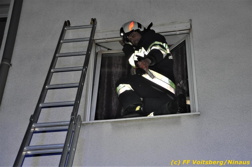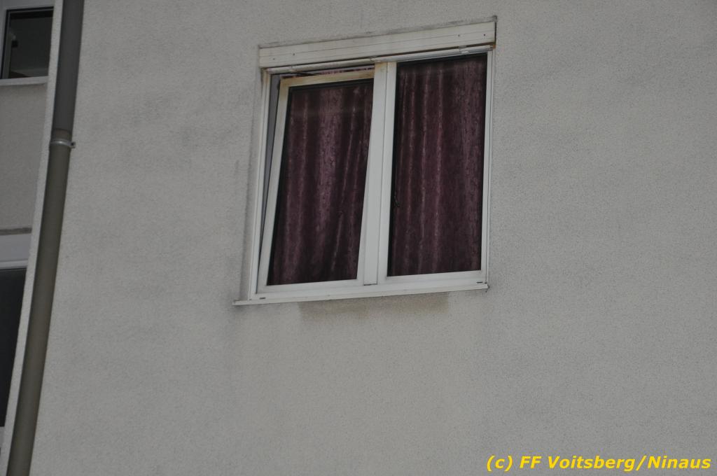 Daraufhin verständigte die Polizei die FF Voitsberg zwecks Türöffnung oder Fenstereinstieg und das Rote Kreuz Voitsberg-Köflach zwecks möglichem Sanitätseinsatz an. Bei Erkundung der Einsatzstelle durch den Einsatzleiter wurde ein gekipptes Fenster gesichtet, woraufhin ein Feuerwehrkamerad über den Leiterweg zuerst das Fenster öffnete und daraufhin in die Wohnung im 1. Stock einstieg und keine Person anfand.