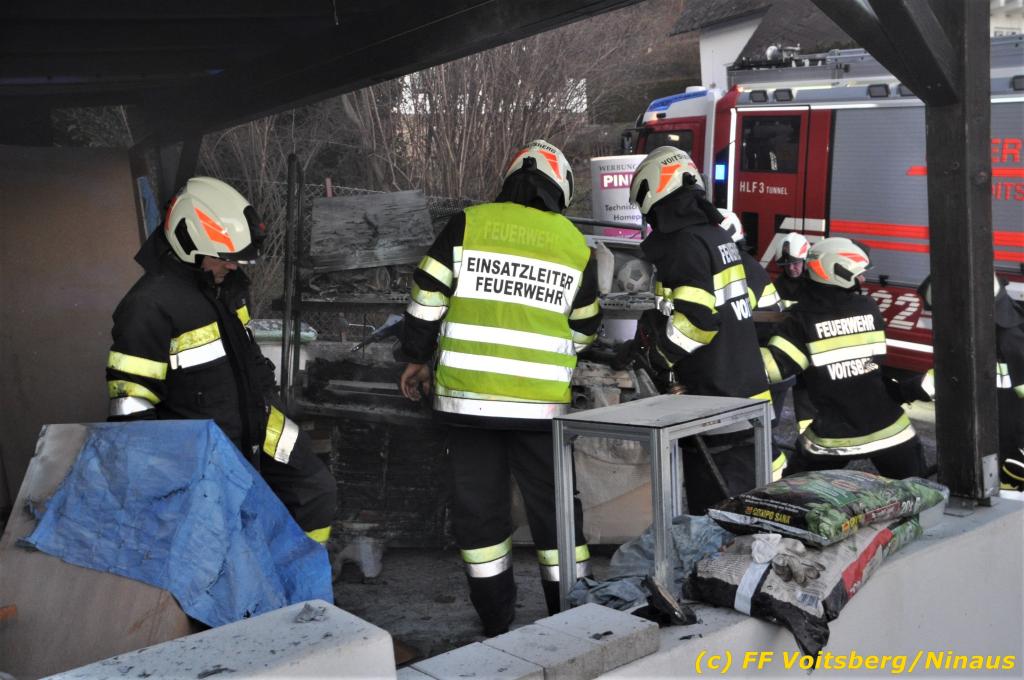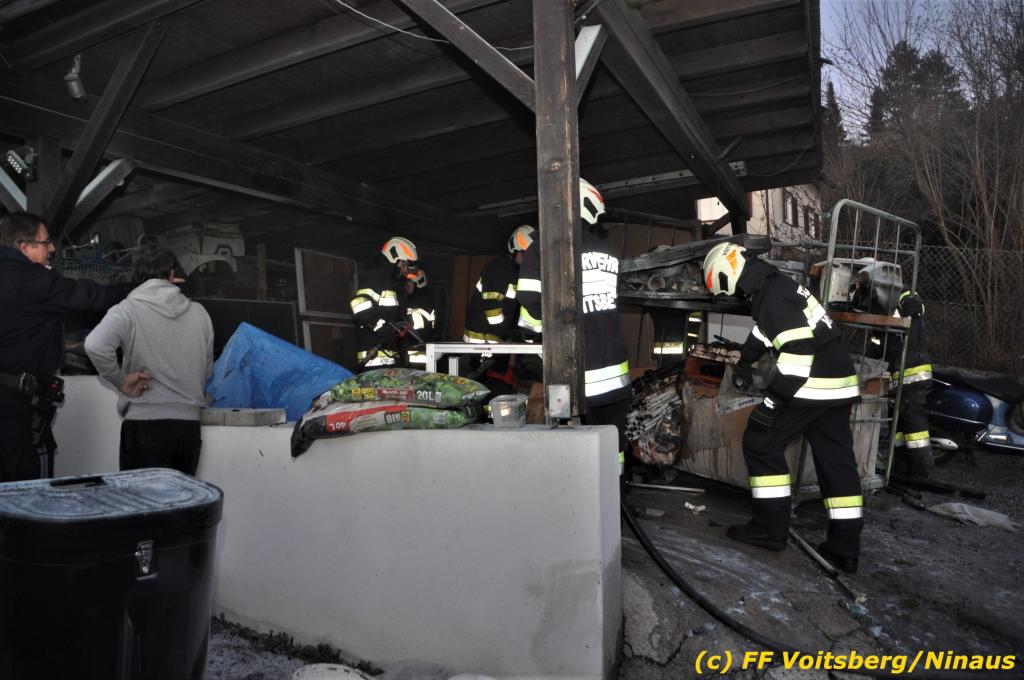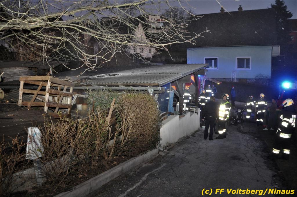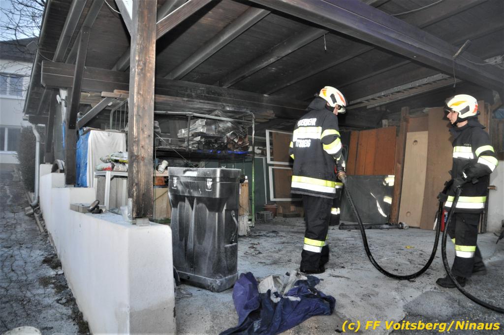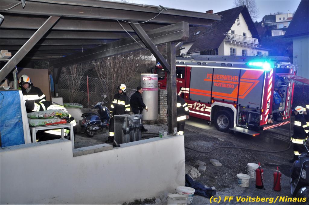 VOITSBERG, am 11.01.2020 Die FF Voitsberg wurde am Samstag, 11. Jänner 2020 um 16:25 Uhr zu einem Brand in die Franz-Schöpfer-Gasse in Voitsberg alarmiert. Ein Hausbesitzer bemerkte einen Kleinbrand in seinem vom Haus getrennten Carport. Mit insgesamt 5 Feuerlöschern versuchte er vergeblich, den Brand zur Gänze zu löschen. .