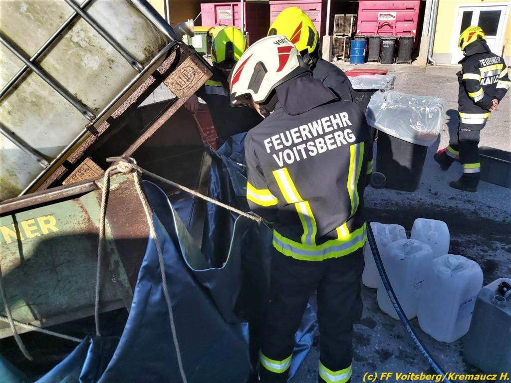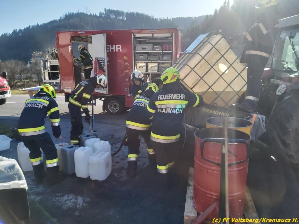 Der Behälter wurde mit einer Mineralumfüllpumpe entleert und ca. 200 Liter in bereitgestellte Kanister gepumpt und danach fachgerecht entsorgt. Die FF Kainach band die ausgelaufenen Betriebsmittel auf der Landesstraße mit Ölbindemittel.
