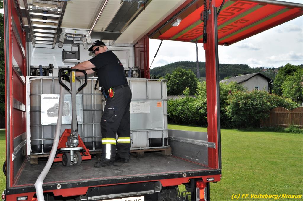 Mit einer speziellen Pumpe für Öleinsätze wurde zuerst der Ölfilm abgepumpt und fachgerecht in Fässern versorgt, ehe das restliche klare Wasser mit einer Tauchpumpe und einem Nasssauger in einen Kanal gepumpt wurde. Nach der notwendigen Gerätereinigung im Rüsthaus konnte um 15:40 Uhr die Einsatzbereitschaft wiederhergestellt werden.