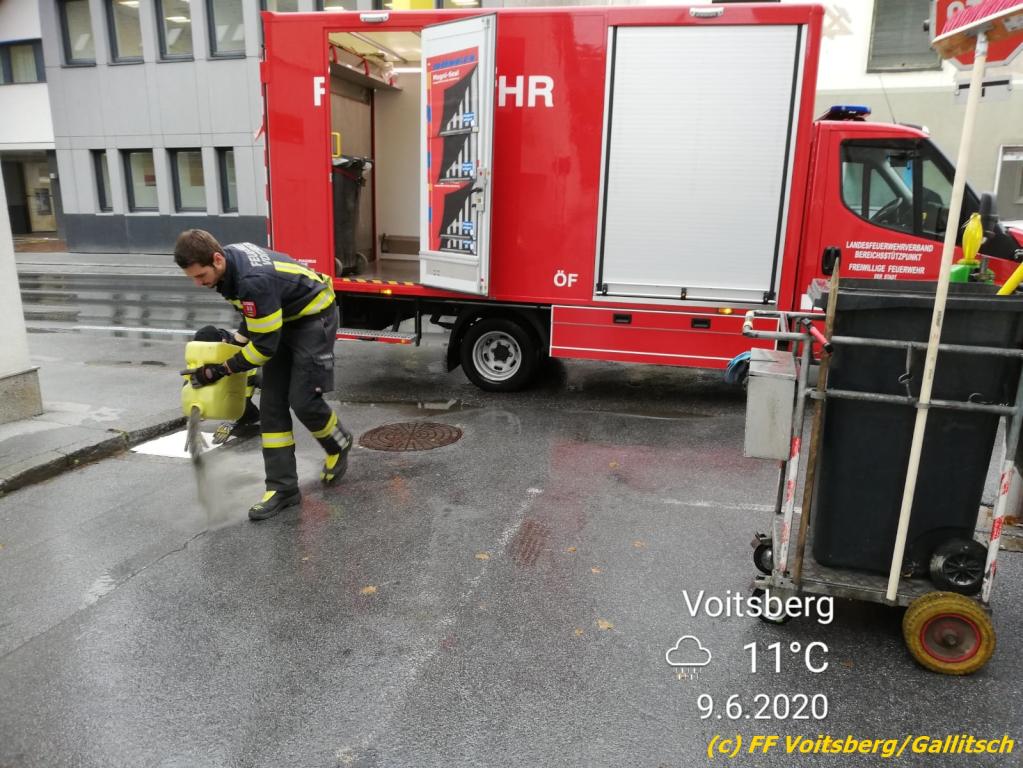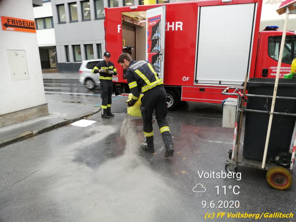 VOITSBERG, am 09.06.2020 Am Dienstag, 9. Juni 2020 um 08:11 Uhr wurde zu einem Einsatz in die Jungferngasse in Voitsberg gerufen. Ausgelaufene Betriebsmittel drohten in die Kanalisation zu gelangen. Mit aufgestreuten Ölbindemittel konnte dies verhindert werden.