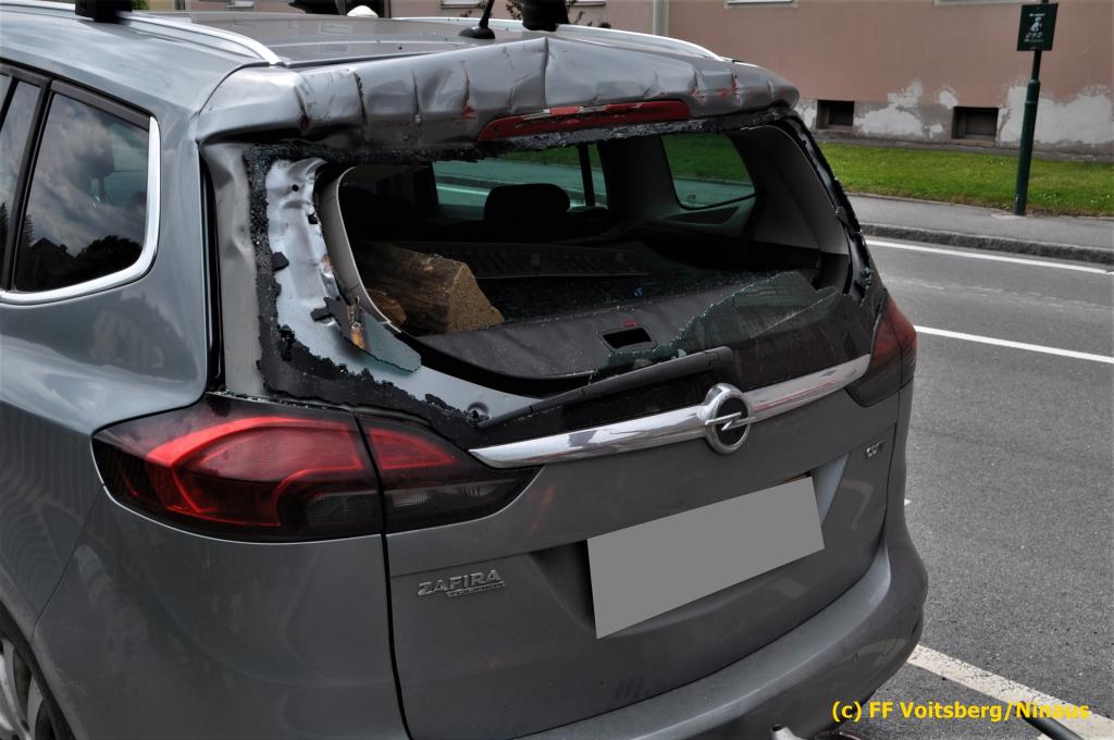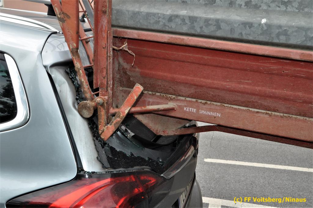 Bei der Kreuzung Arnsteinstrasse – Bahnhofstraße in Voitsberg kam ein Pkw auf das in Richtung Umfahrung Ost fahrende Gefährt trotz Stopptafel entgegen. Der Pkw-Lenker musste sein Fahrzeug durch eine Schnellbremsung zum Stillstand bringen, um einen Frontalzusammenstoß zu vermeiden. Dabei rutschte das am Anhänger befindliche Ladegut trotz Sicherung nach vor und prallte gegen das Heck des Zugfahrzeuges, welches beschädigt wurde.