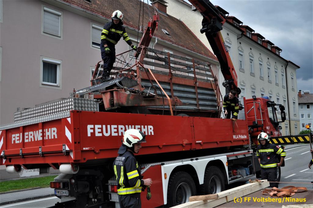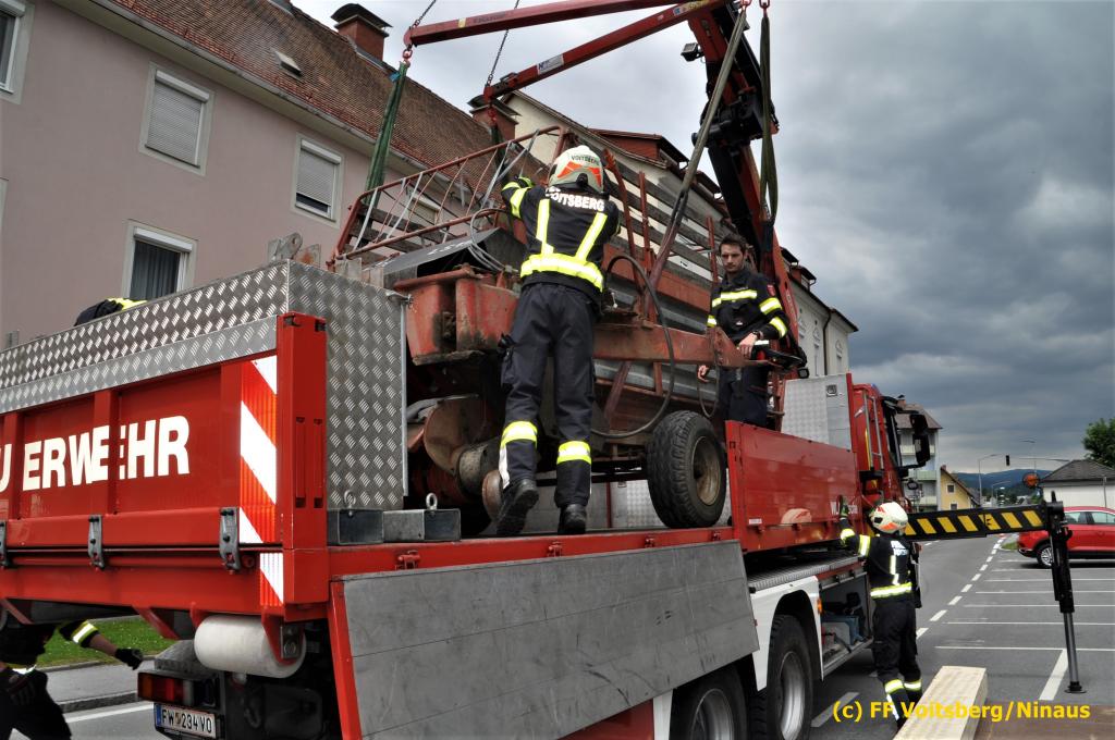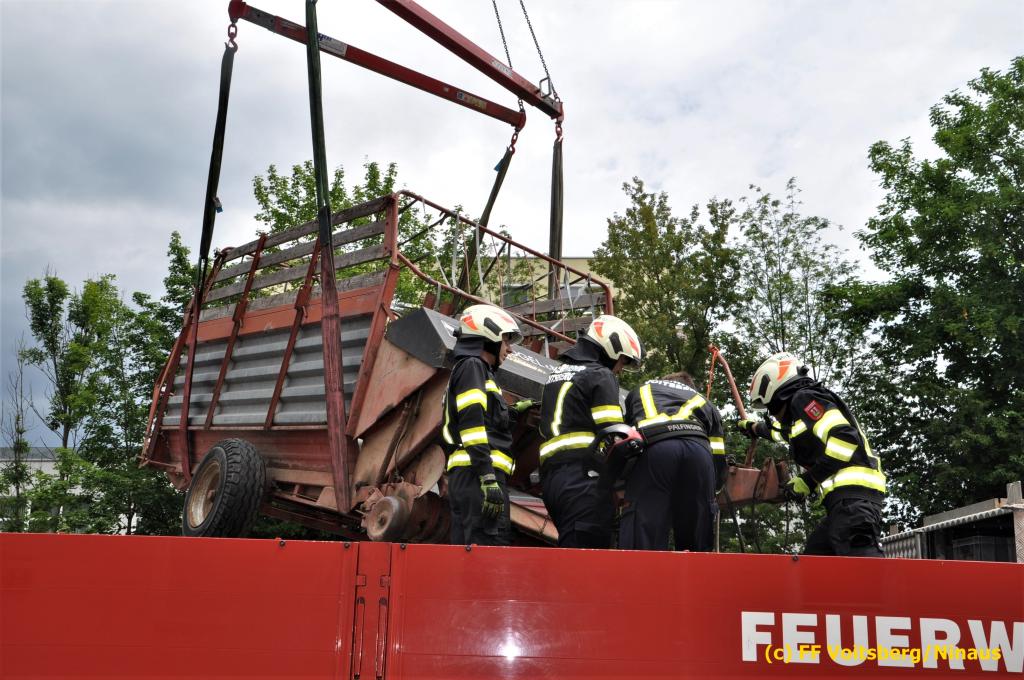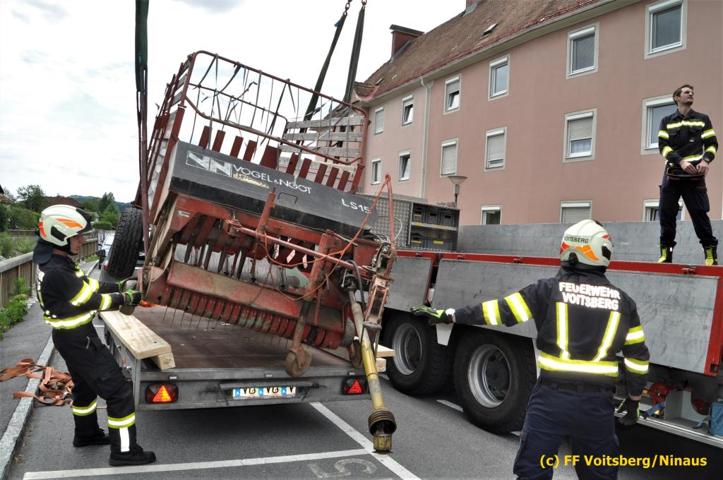 Mit dem WLF-Kran der FF Voitsberg wurde das landwirtschaftliche Gerät geborgen und zu einem Abstellplatz transportiert. Die FF Voitsberg richtete während der Bergungsarbeiten eine Umleitung über die Bahnhofstraße ein und reinigte die Straße von herumliegenden Wrackteilen.