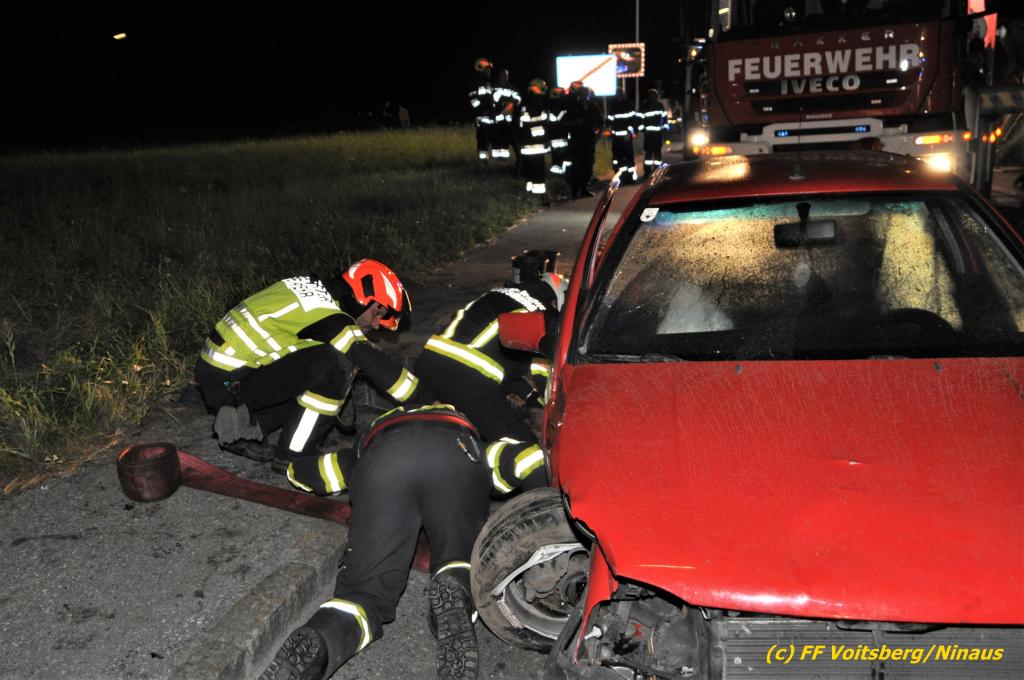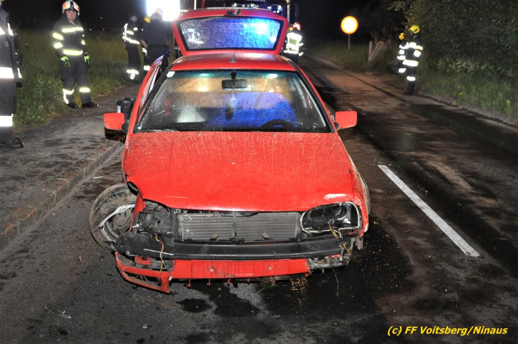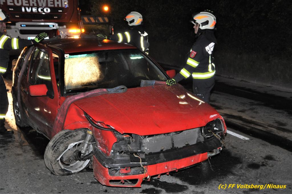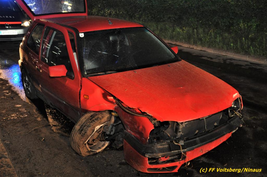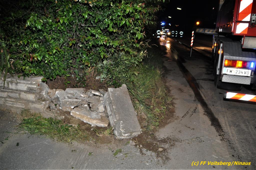 VOITSBERG, am 19.06.2020 Die Feuerwehren Bärnbach und Afling wurden am Freitag, 19. Juni 2020 kurz nach 21 Uhr zu einem Verkehrsunfall auf der L 341 nach Bärnbach (Ortsteil Klein-Kainach) alarmiert. Ein Pkw-Lenker kam mit seinem Fahrzeug Richtung Kainach fahrend auf die linke Straßenseite, touchierte einen Verteilerkasten und eine Gartenmauer, ehe es ihn wieder auf die Straße zurückschleuderte.