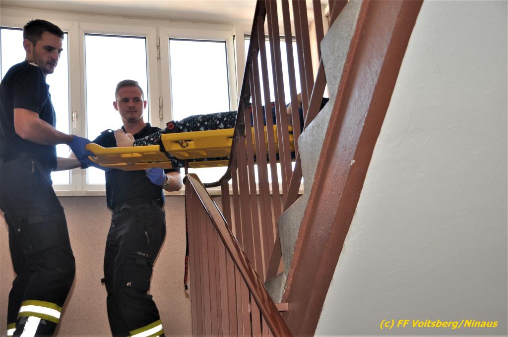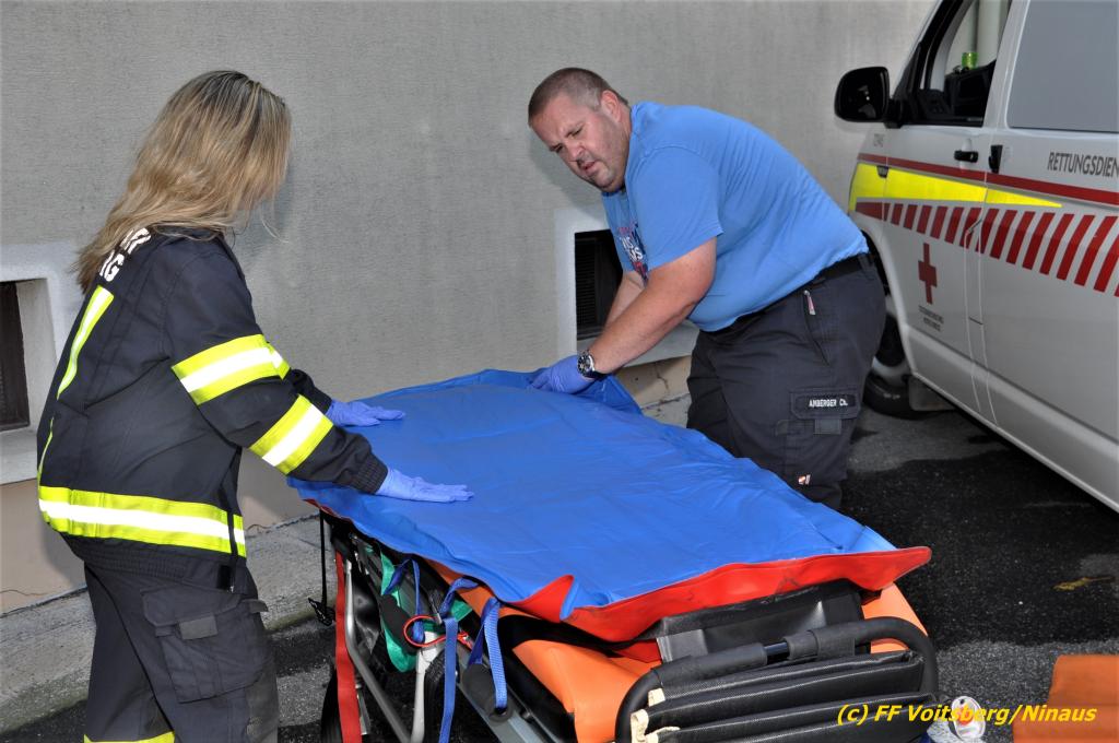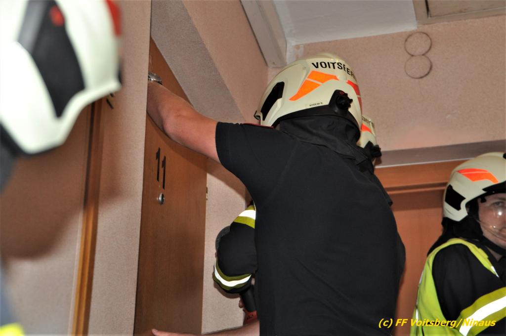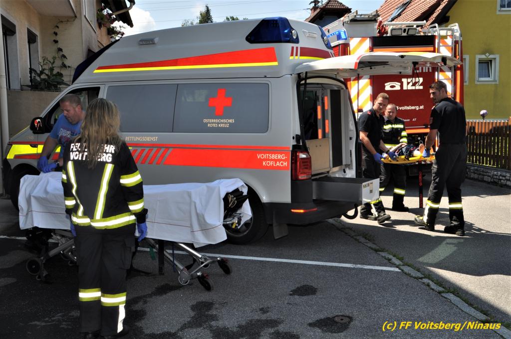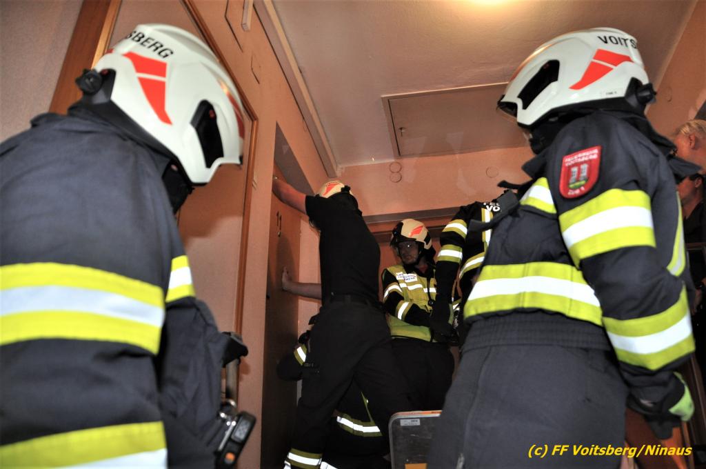Der FF Voitsberg gelang durch Abschneiden der Türkegel und dem Entfernen der Türe der Zutritt in die Wohnung für das Rote Kreuz und die Polizei. Die Sanitäter versorgten die unbestimmten Grades verletzte Person und brachten sie in Zusammenarbeit mit der FF Voitsberg zum Rettungswagen. Sie wurde anschließend zur weiteren Behandlung in das LKH Voitsberg eingeliefert.