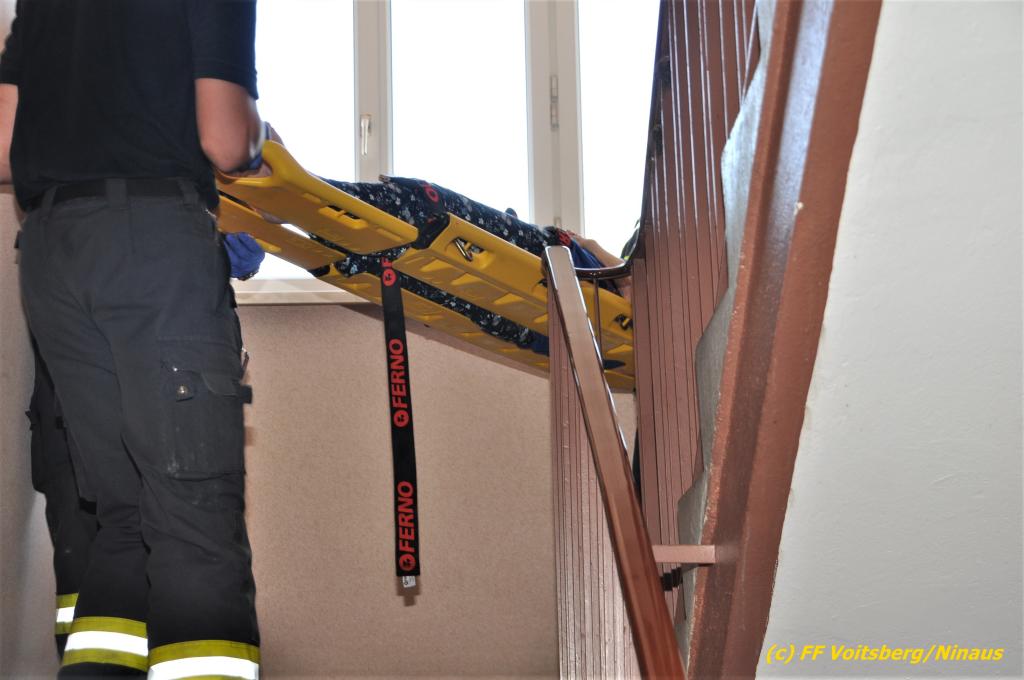 Eine betagte 88jährige Frau rief aus ihrer im zweiten Stockwerk gelegenen Wohnung um Hilfe, nachdem sie dort gestürzt war und von selbst nicht mehr aufstehen konnte. Der Schwiegersohn war zu dieser Zeit vor der Türe und konnte nicht öffnen, da innen der Schlüssel steckte. Daraufhin verständigte er unverzüglich die Einsatzkräfte.
