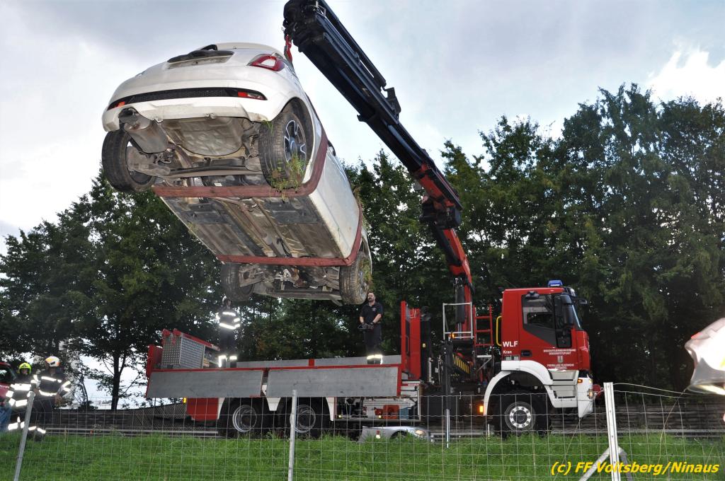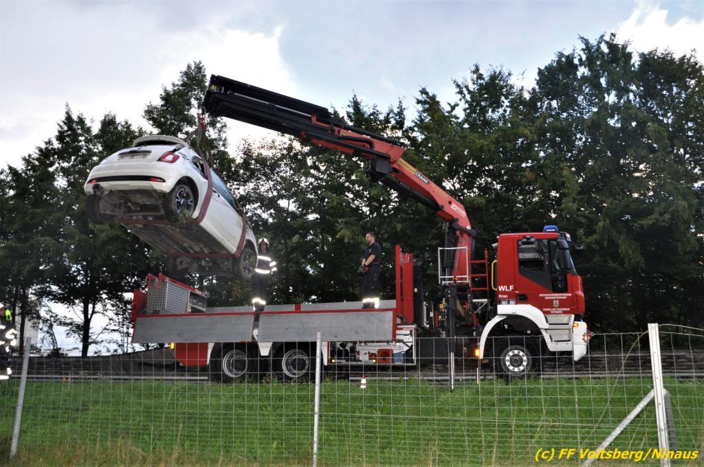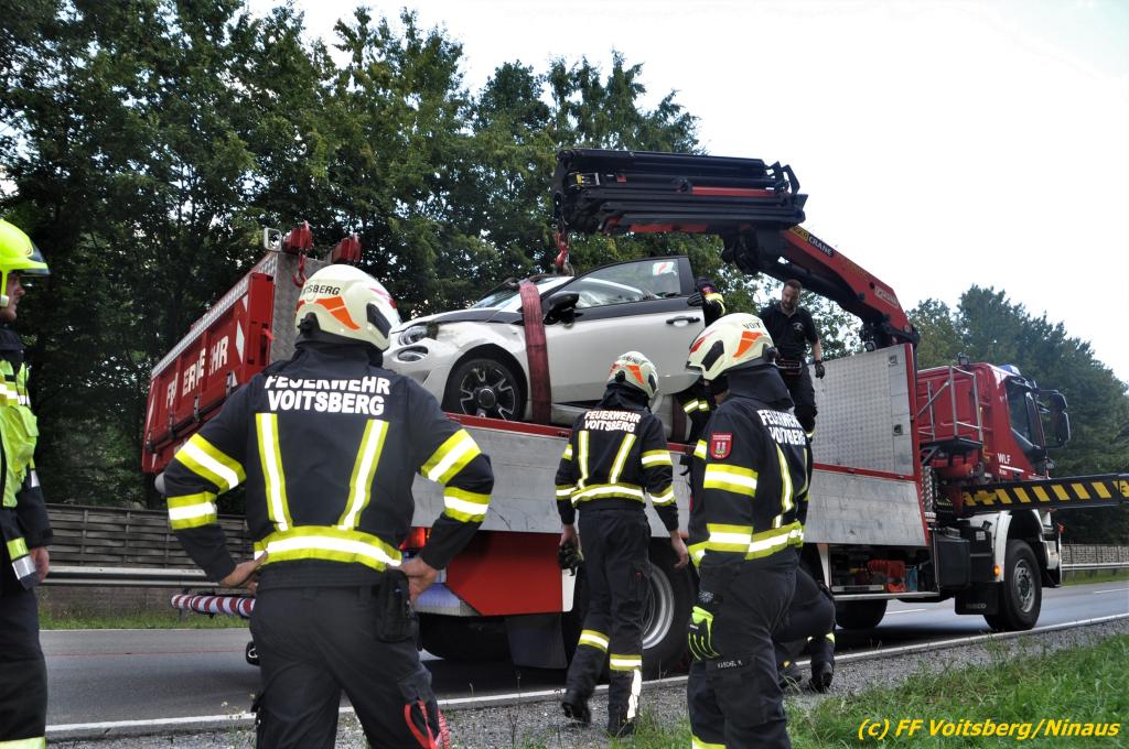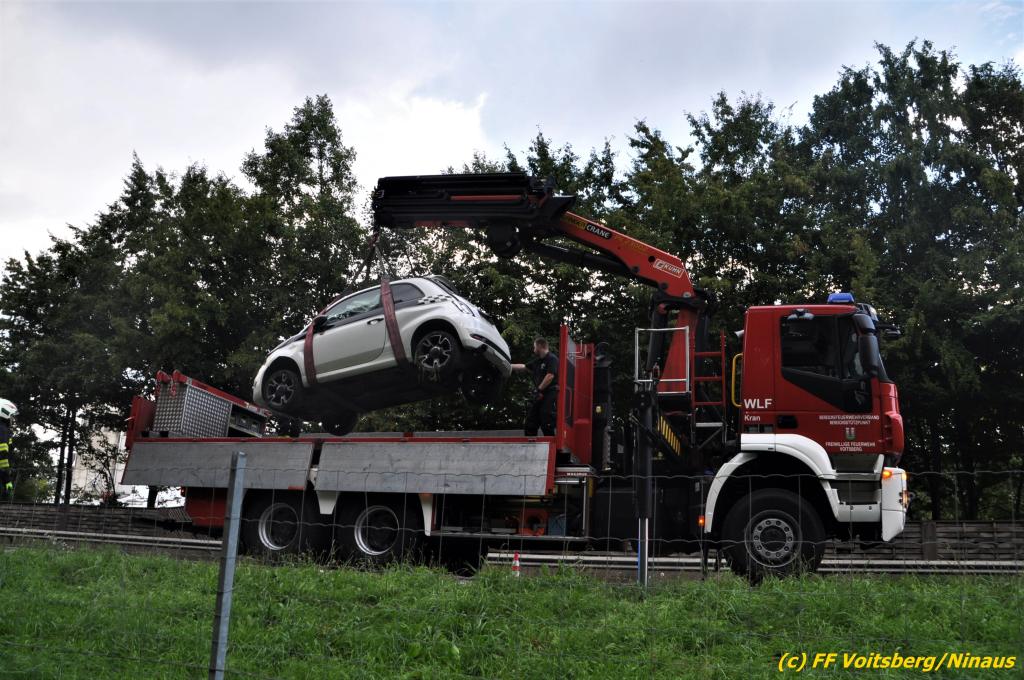 Das schwer beschädigte Fahrzeug wurde mit dem WLF-Kran der FF Voitsberg geborgen und an einem gesicherten Stellplatz abgestellt.