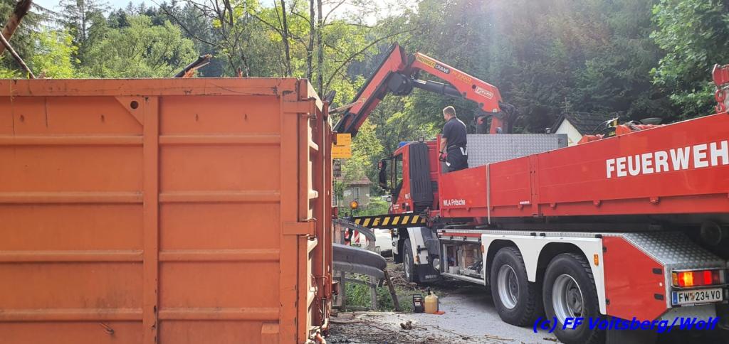 Deshalb wurde am Sonntag, 23. August nachmittags mit dem des WLF-Greifer der FF Voitsberg das gelagerte Material auf einen Container, bereitgestellt vom städtischen Bauhof der Stadtgemeinde Voitsberg, verfrachtet und die Gefahr gebannt.