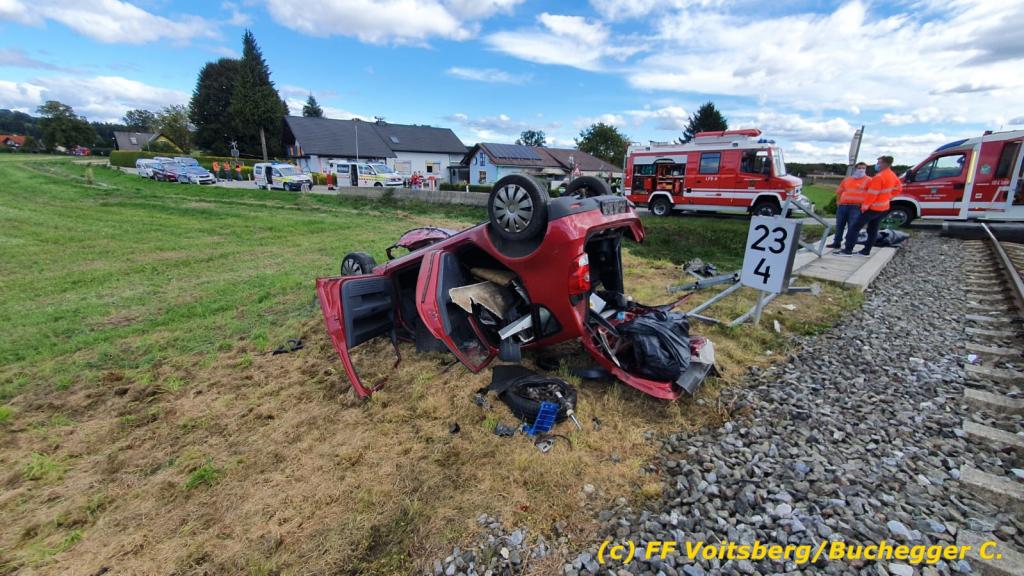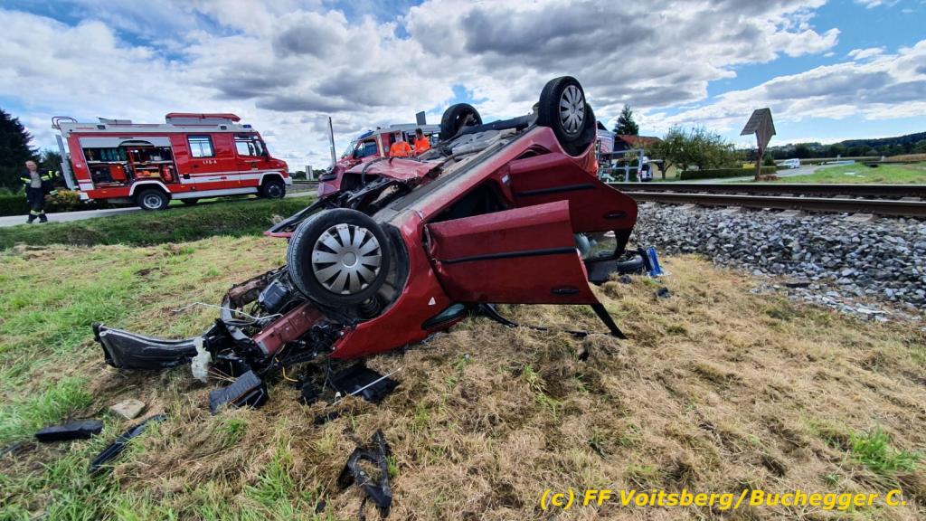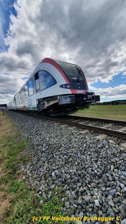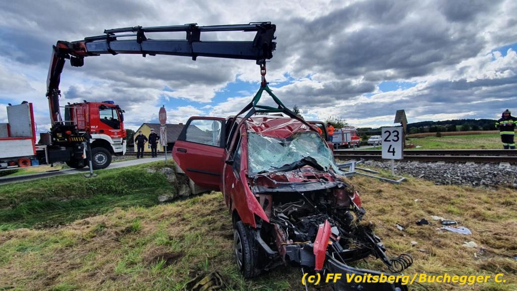 VOITSBERG, am 30.09.2020 Nach einem Zusammenstoß zwischen einem Pkw und einer Triebwagengarnitur der GKB wurde das schwer beschädigte Fahrzeug nach Anforderung der einsatzleitenden Feuerwehr Söding mit dem WLF-Kran geborgen und zu einem gesicherten Platz gebracht.