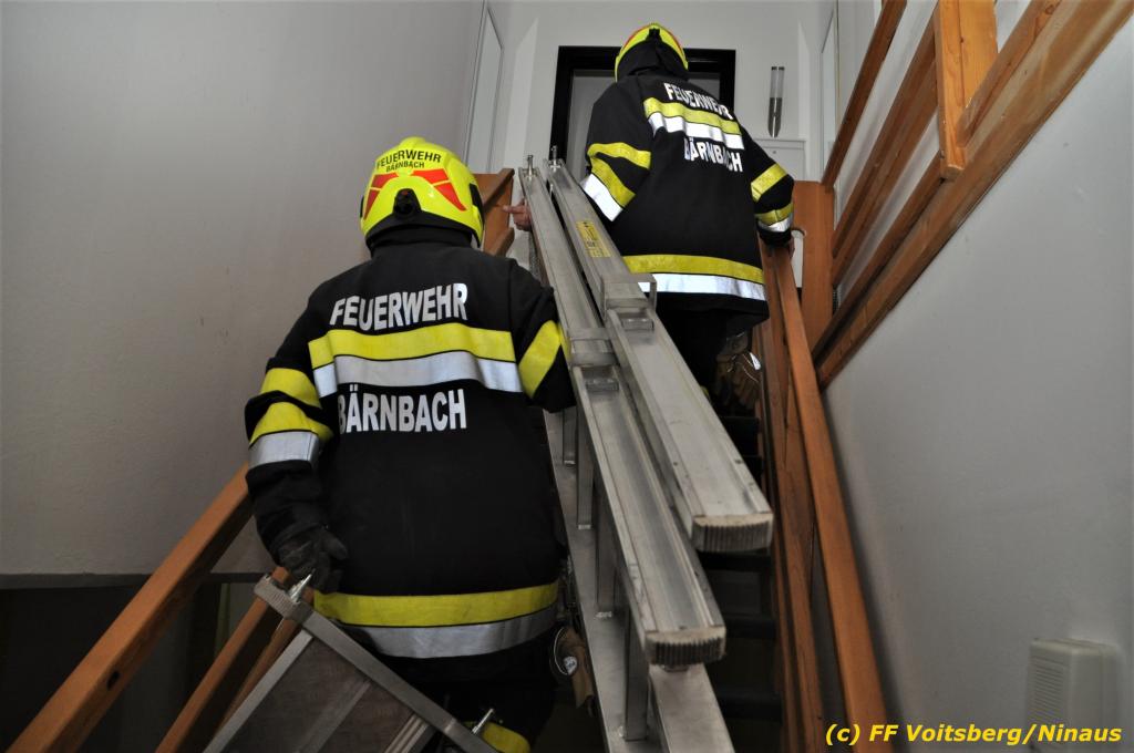 Ein Nachbar, selbst Feuerwehrmann bei der FF Piber, bemerkte am Freitag, 2. Oktober kurz nach Mittag Flammen in einem Zimmer im ersten Stock in der Hauptstraße in Bärnbach. Er verständigte sofort über Notruf die LLZ Steiermark, welche die Feuerwehren Bärnbach und Piber und in weiterer Folge die FF Voitsberg und die Drehleiter Köflach alarmierte. Zeitgleich versuchten die Wohnungsinhaber den Brand mit Feuerlöschern selbst zu löschen, was aber nicht gelang.