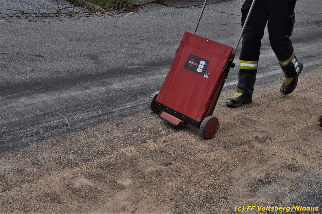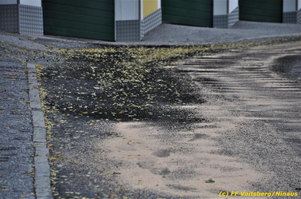 Mit Ölbindemittel wurde die Spur gebunden und mit der feuerwehreigenen Kehrmaschine aufgesaugt.
