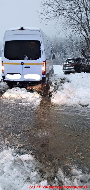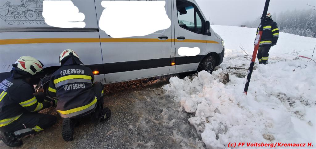Die verständigte FF Voitsberg barg den Klein-Lkw mittels Seilwinde, sodass dieser die Fahrt unbeschädigt auf eigener Achse fortsetzen konnte.