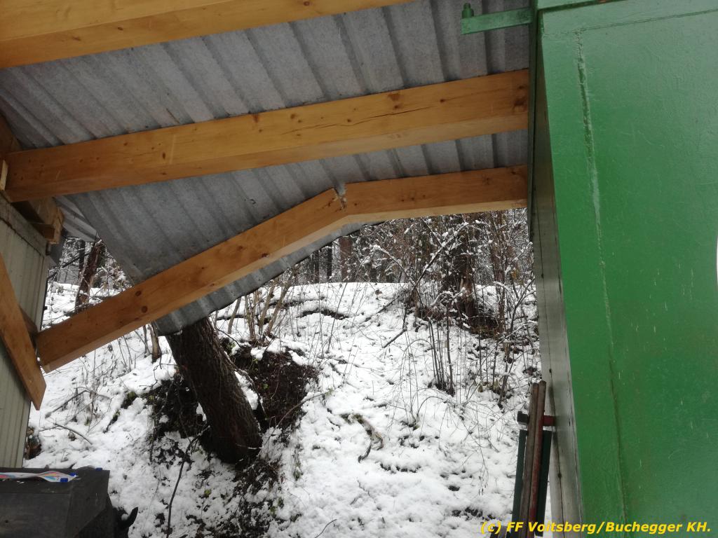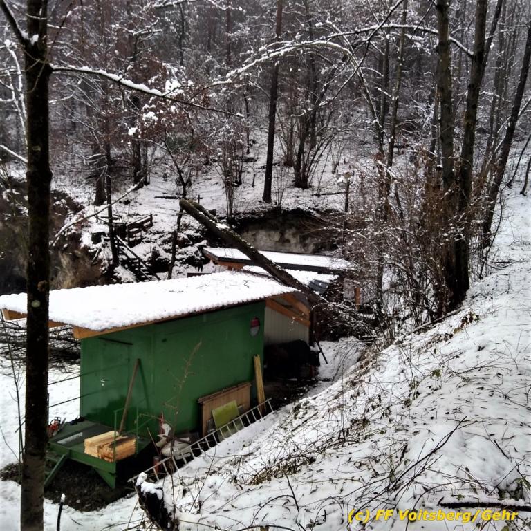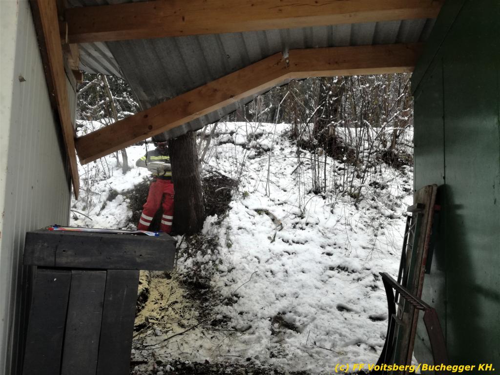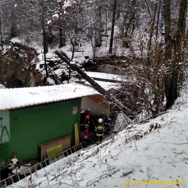VOITSBERG, am 10.12.2020 Am Gelände des Bogenschießclubs Voitsberg in der Zangtalerstraße stürzte am Donnerstag, 10. Dezember 2020 in den Morgenstunden ein Baum auf einen dort befindlichen Lager-Container.